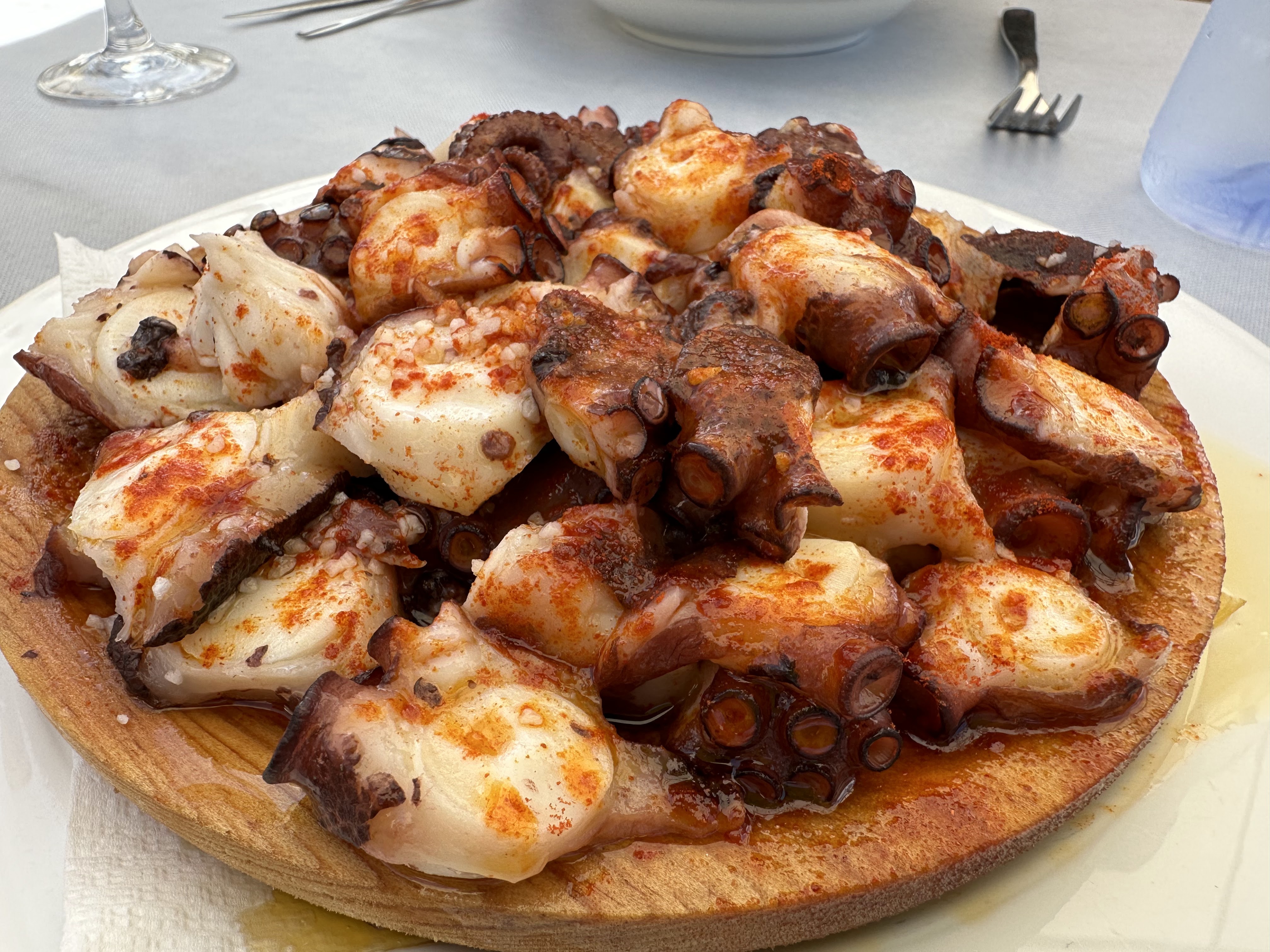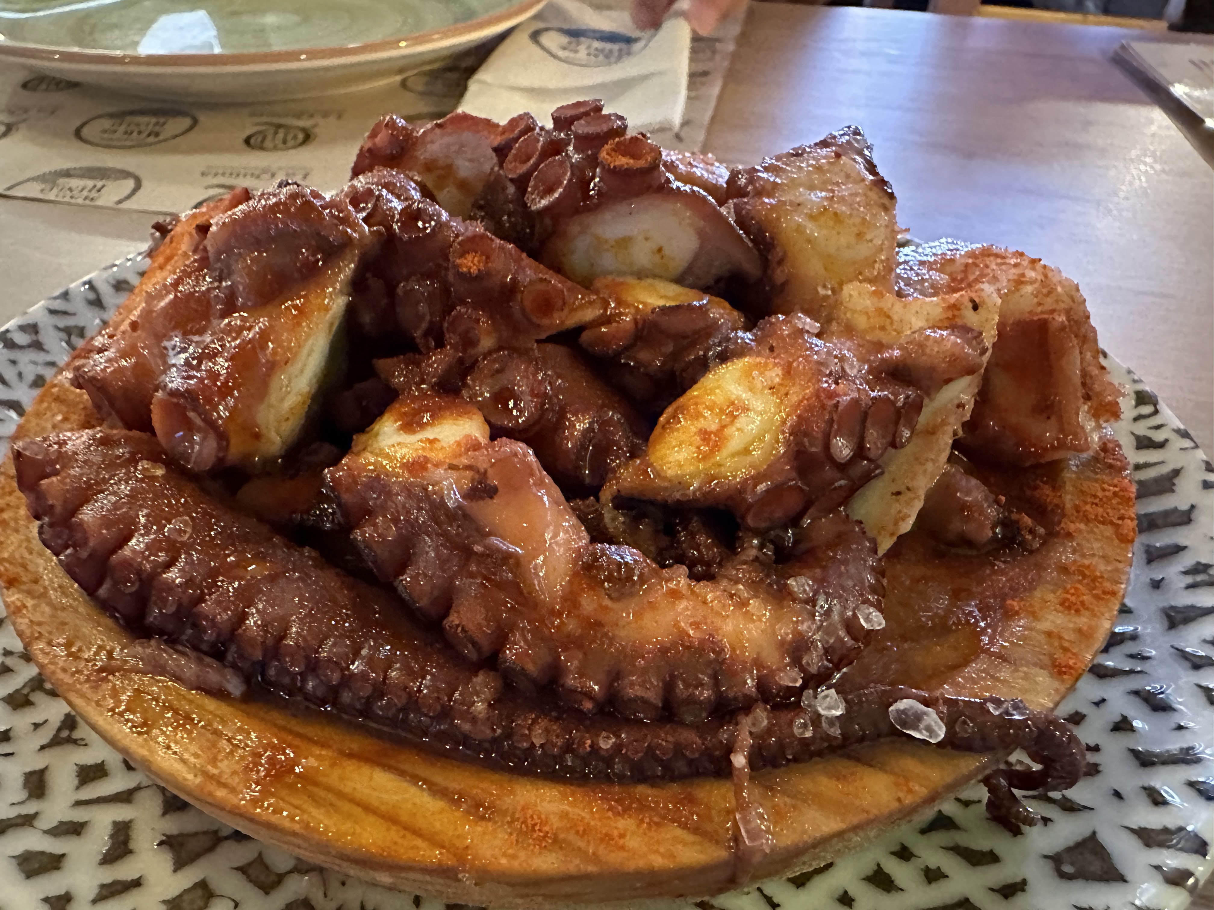 26 grados; todo lleno en la zona recomendada de la Calle S.Francisco/Ribadeo; muchos con cola esperando entrar; hubo suerte y pillamos mesa interior (tienen también zona de terraza techada) en la PULPERÍA MAR DE RINLO.