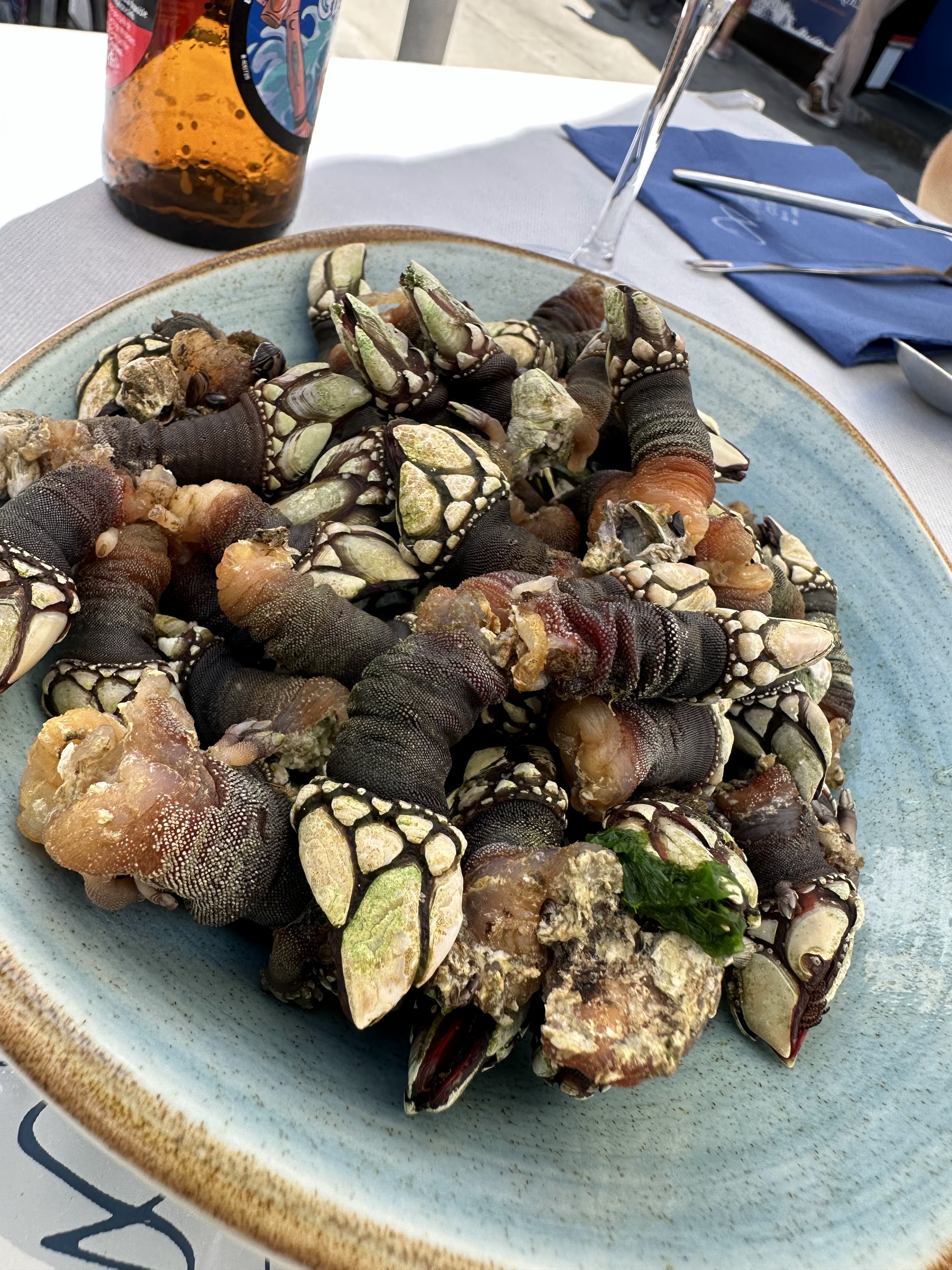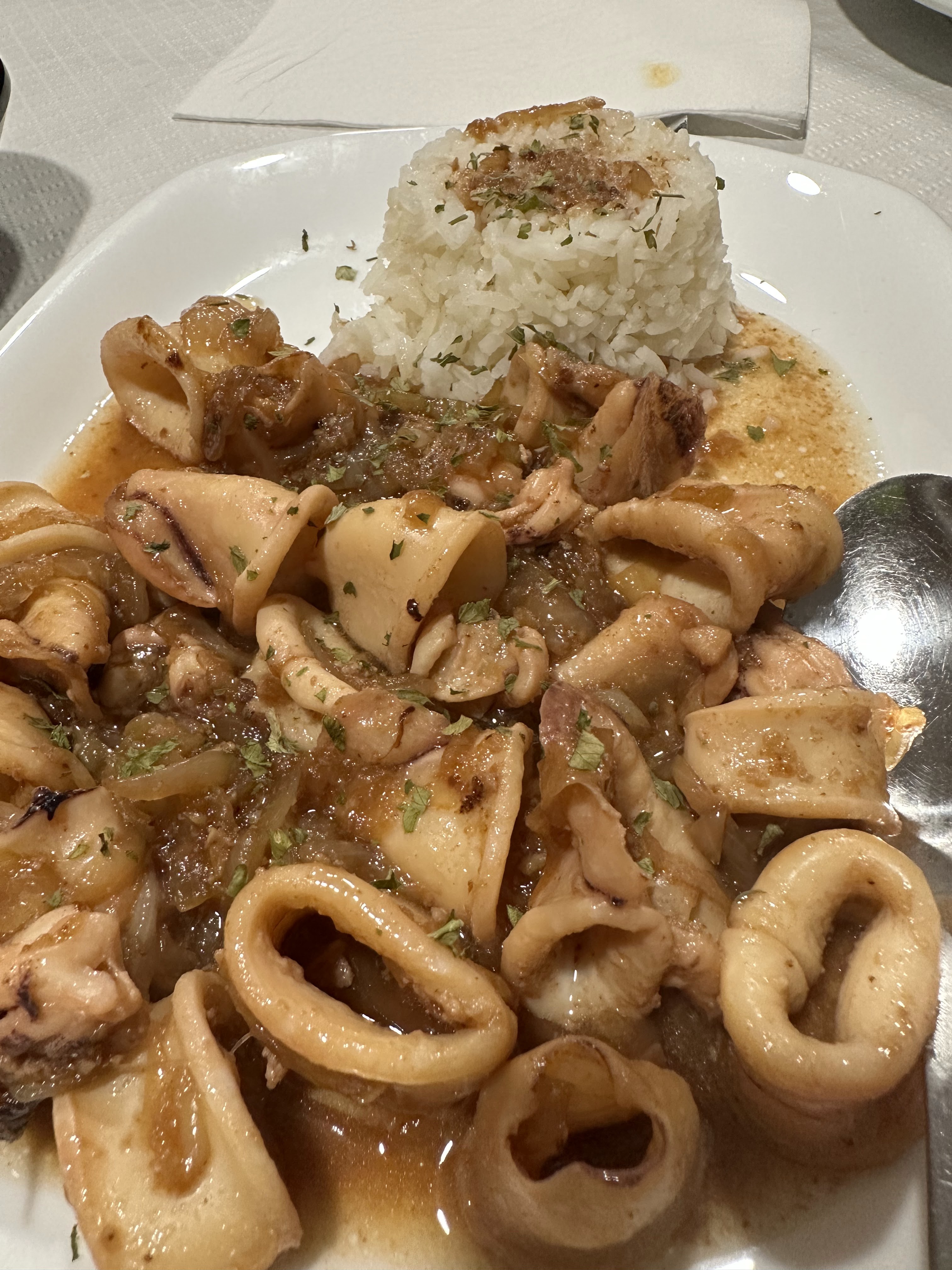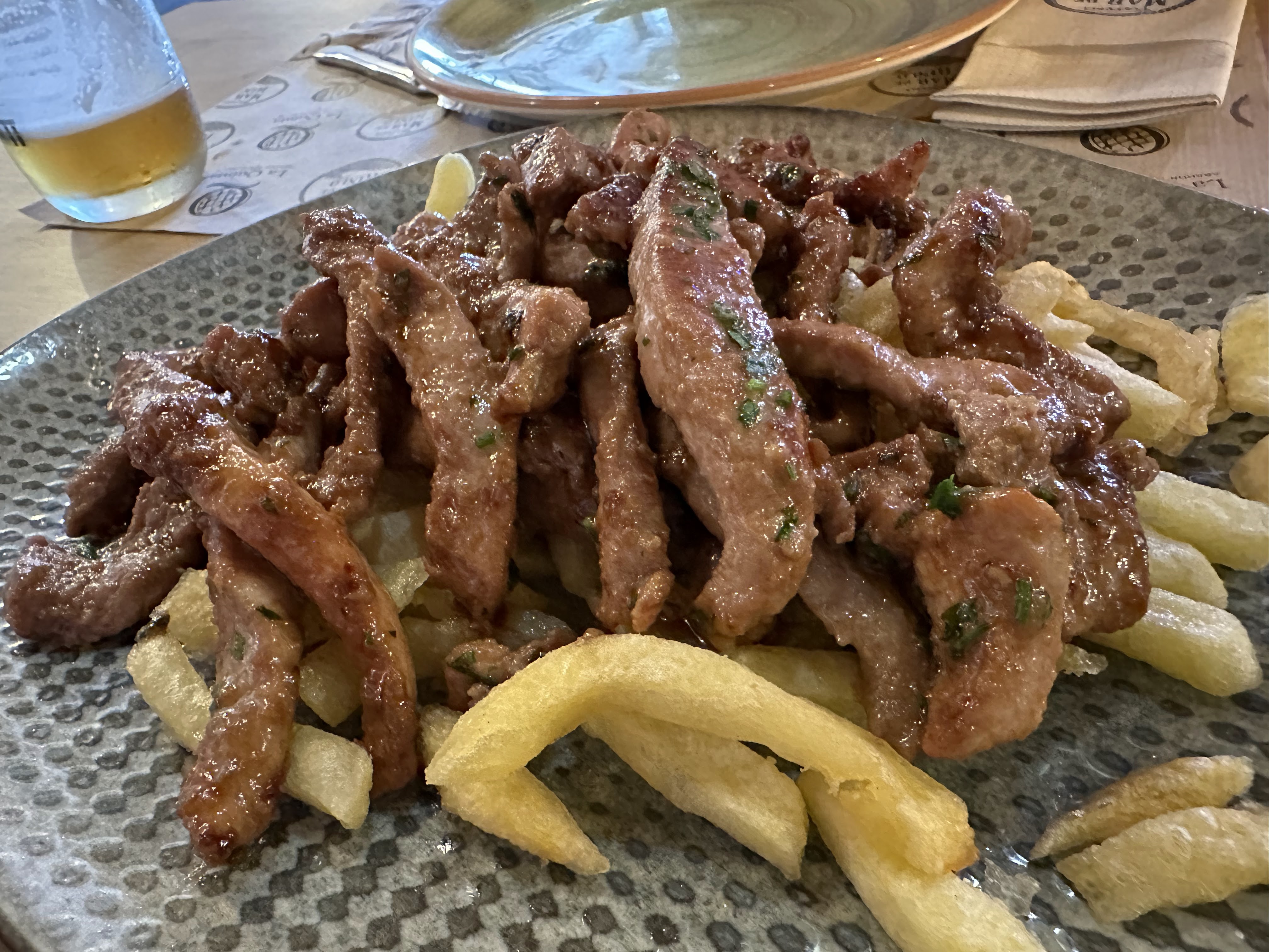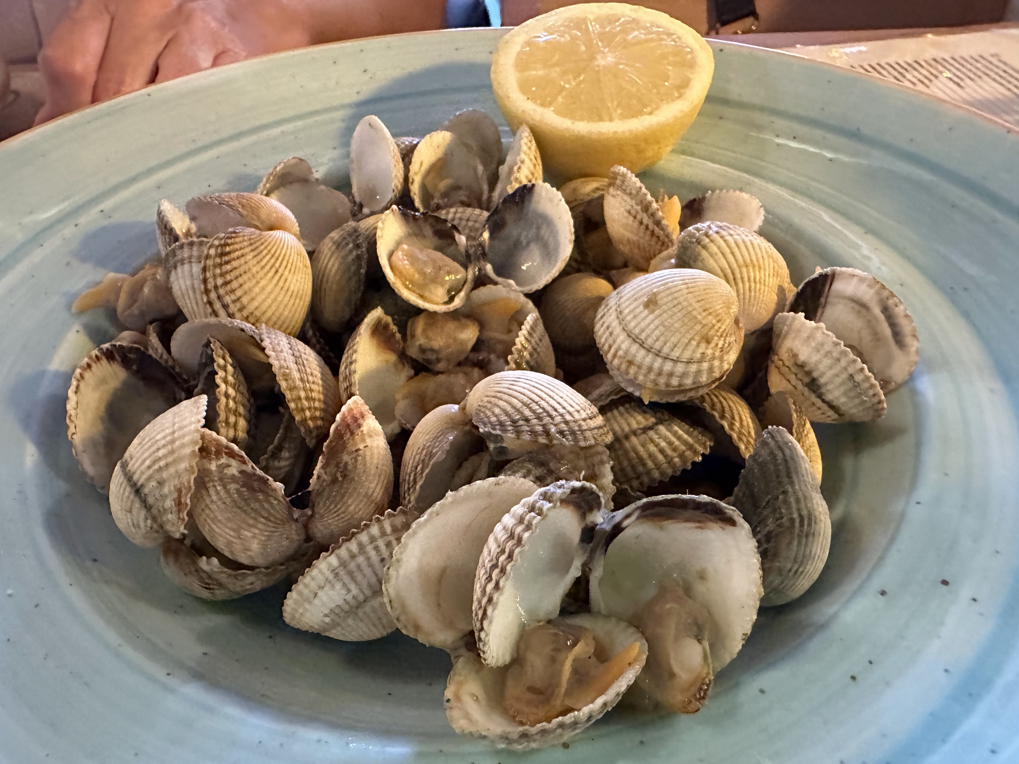 Compartimos un menú del día (15 eur) compuesto por ensalada de pasta y pollo asado con patatas, y unas navajas con ajos fritos (18,50 eur) y un buen plato de bonito asado (20 eur); el camarero nos dijo que estaba bien de comida y así fue.