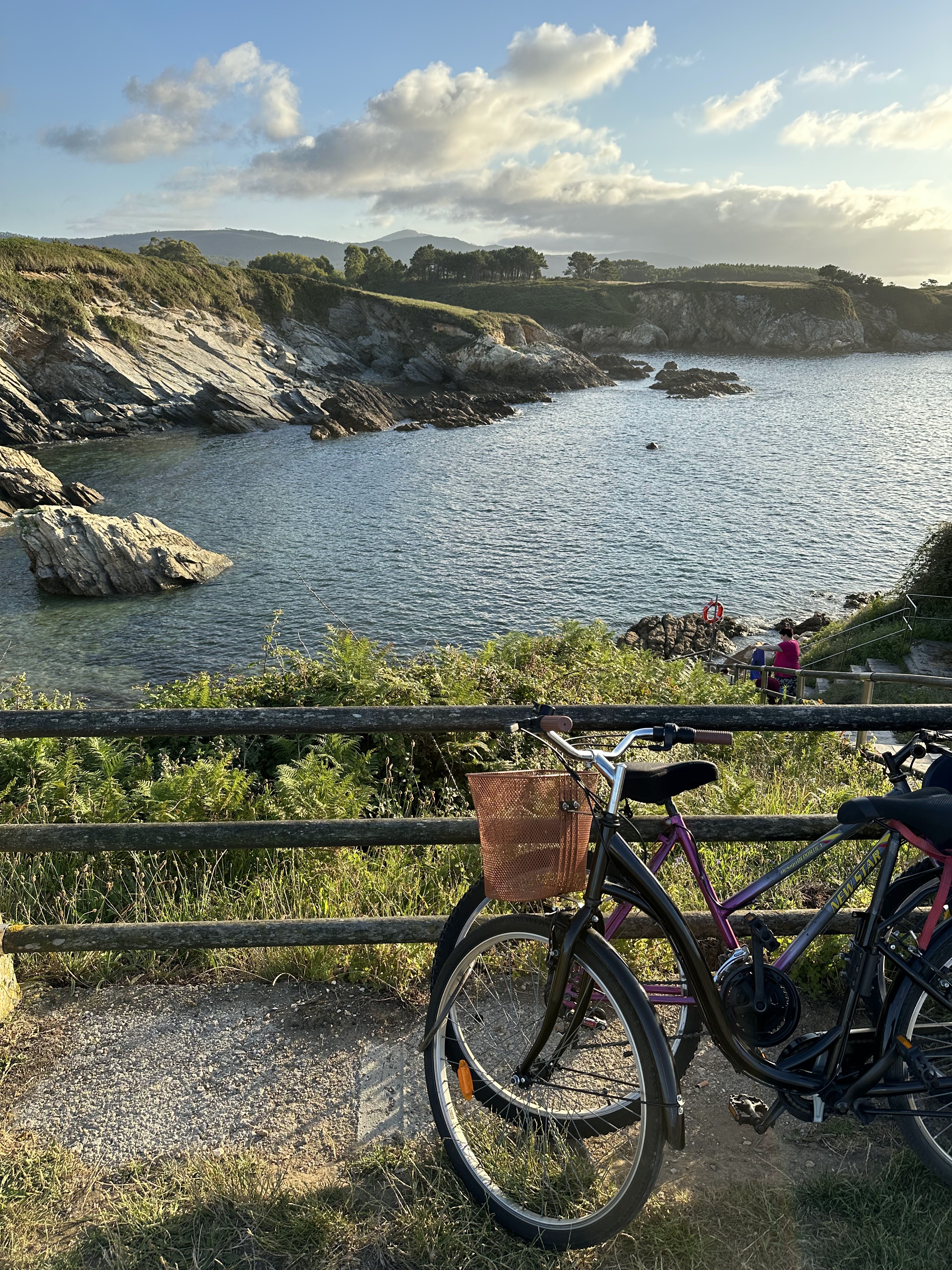 Dejado el coche en el aparcamiento, fuimos primero a ver la Playa de Rocas Blancas; una pequeña playa guarecida entre acantilados que forman una cala de arena. Pongo foto sugerente en el siguiente bloque, con una bicicleta en primer término.
