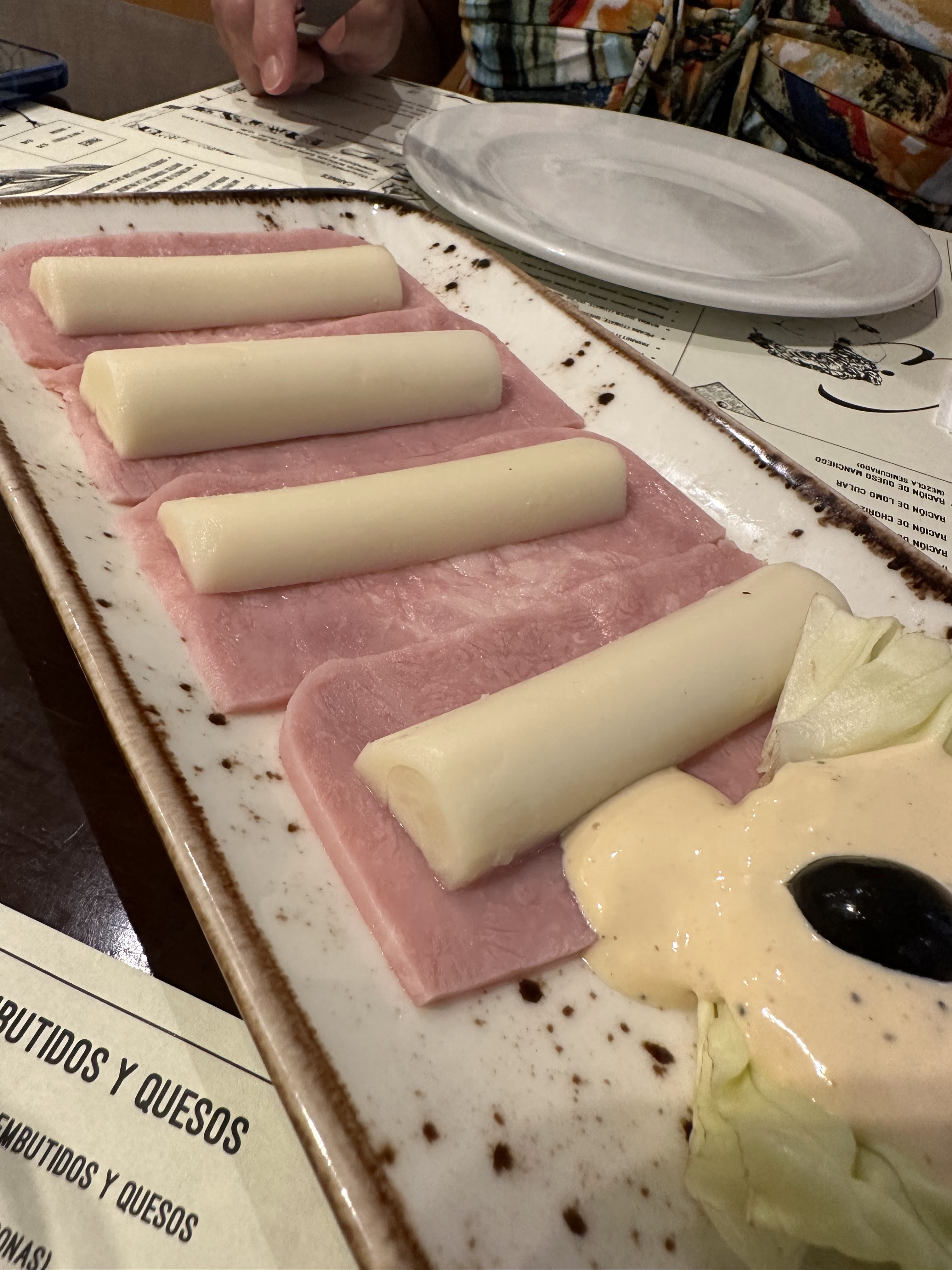 El denominado en carta como antipasto, era de «palmitos brasileños, brotes tiernos de la palmera , jamón york y salsa golf» (vaya tela; 7,30 eur) pero no nos imaginábamos tal presentación tan, tan…os dejo pongáis el calificativo vosotr@s; pongo foto.