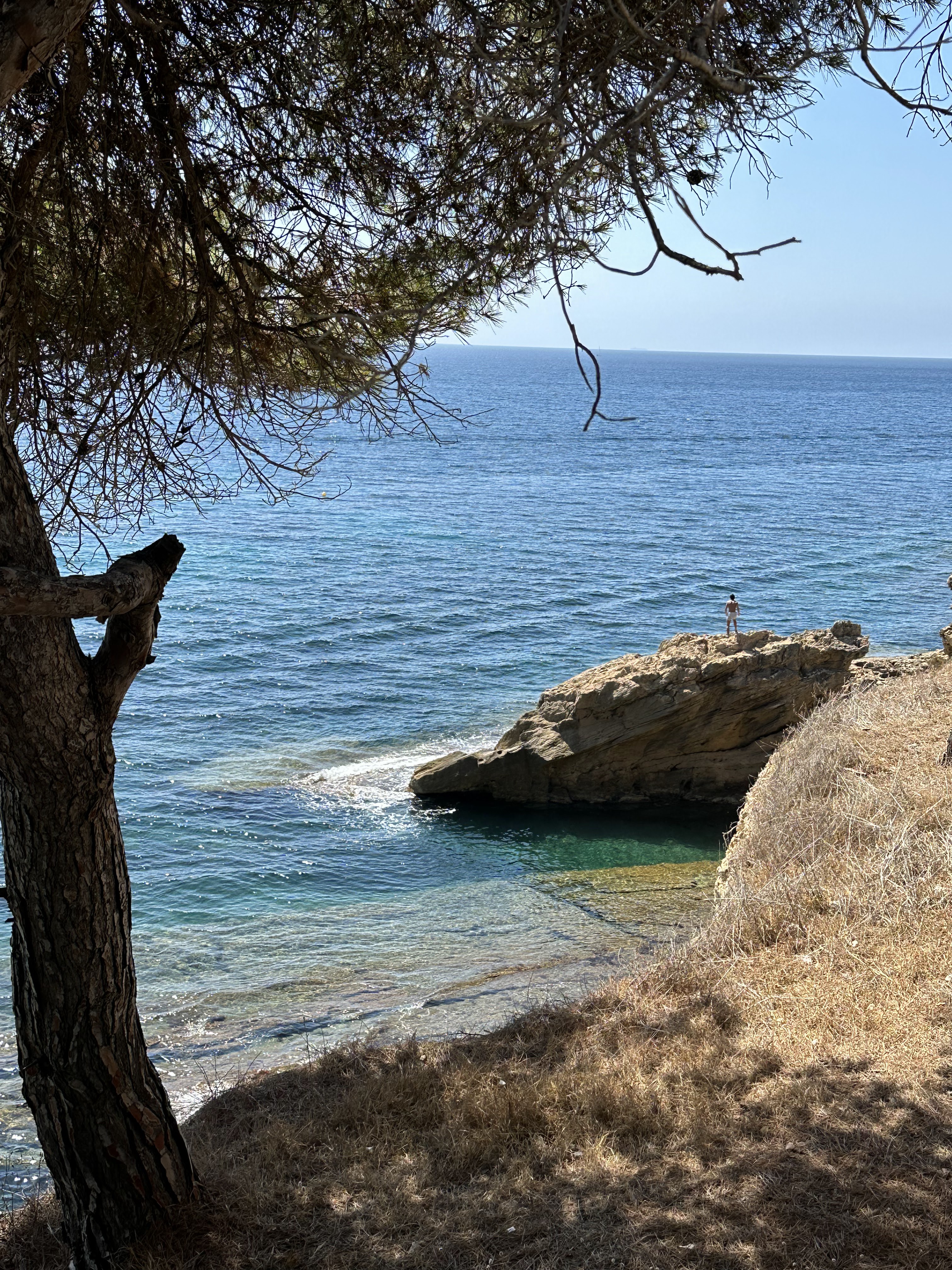 Desde el mirador, iniciamos el descenso hacia la Cala de l’Advocat, donde encontramos un espigón, una escalera metálica para acceder al mar y un chiringuito (en temporada).