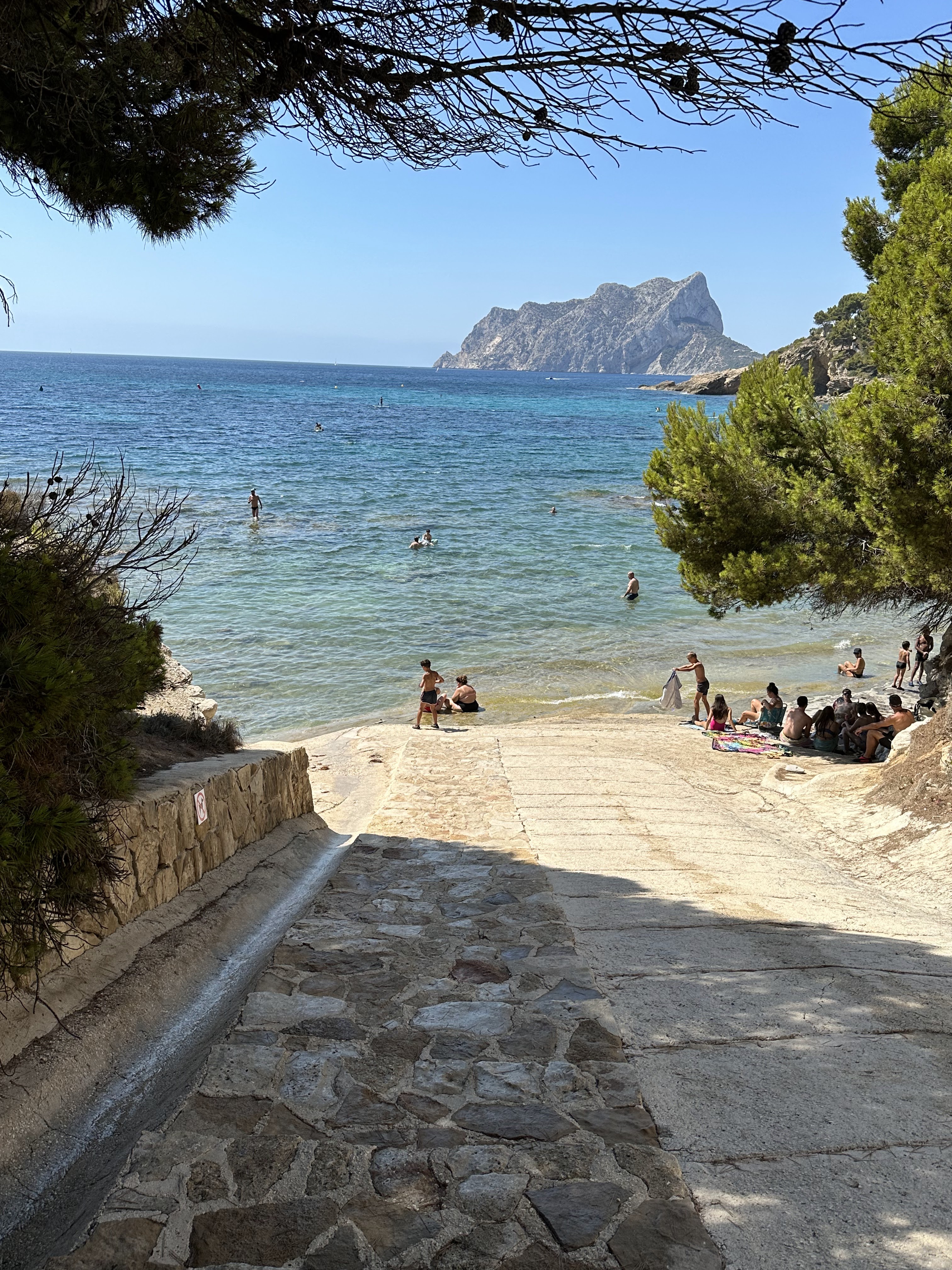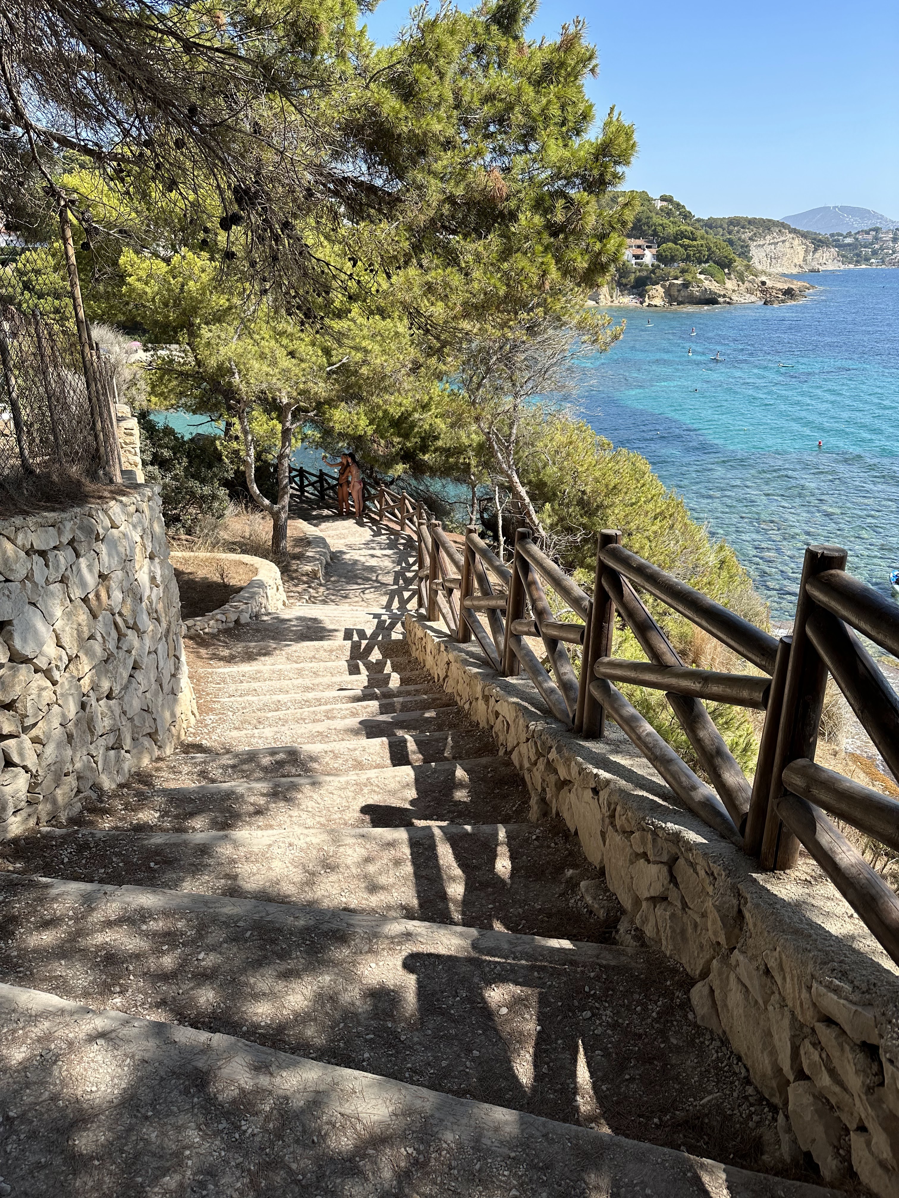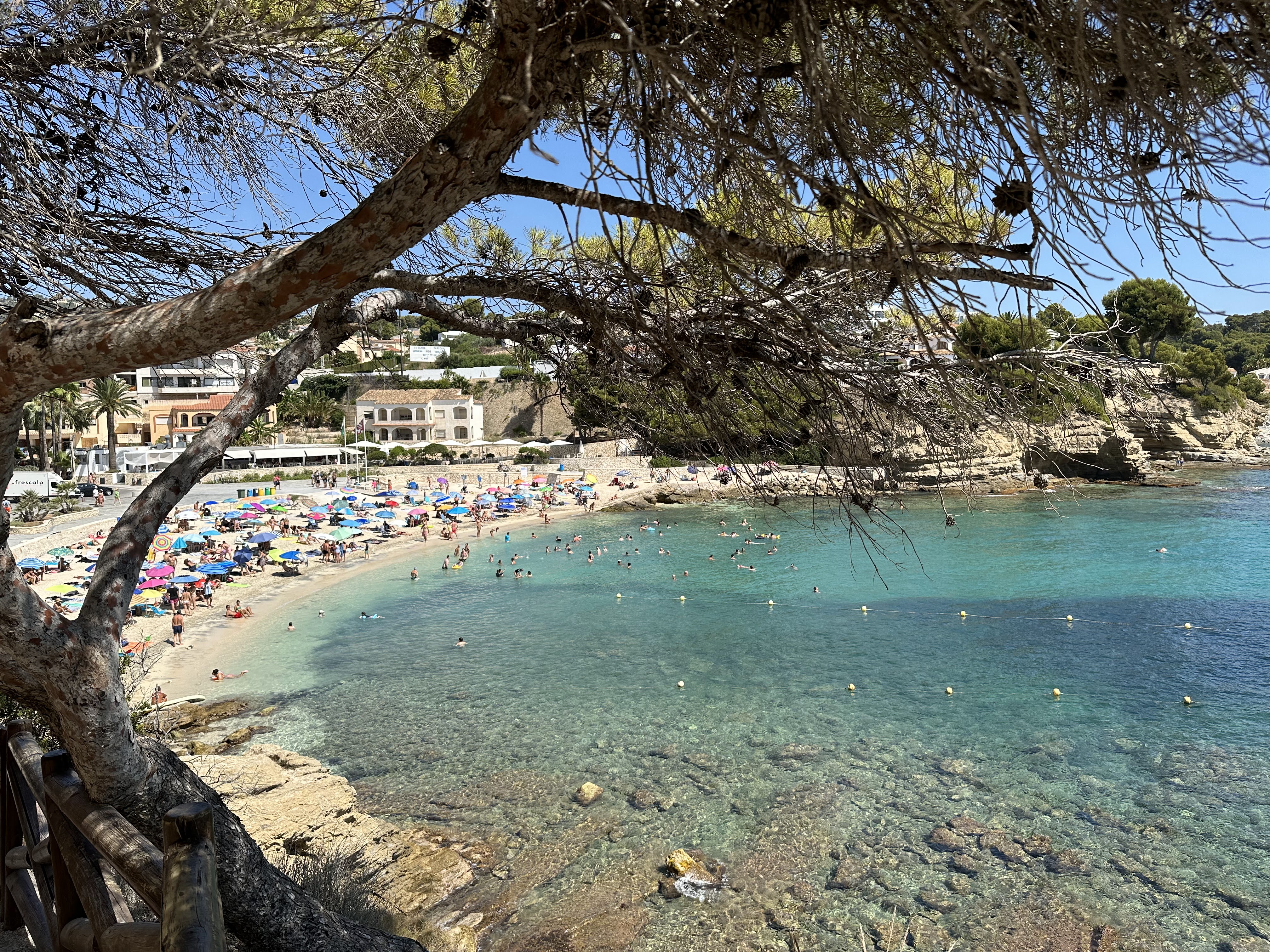 De vuelta en la Tourist Info Benissa Playa, recorremos el tramo hasta Cala Pinets (más recóndita y tranquila), pasando por la Cala de la Fustera ―la más accesible y cómoda del recorrido con todos los servicios, parking y restaurante―.