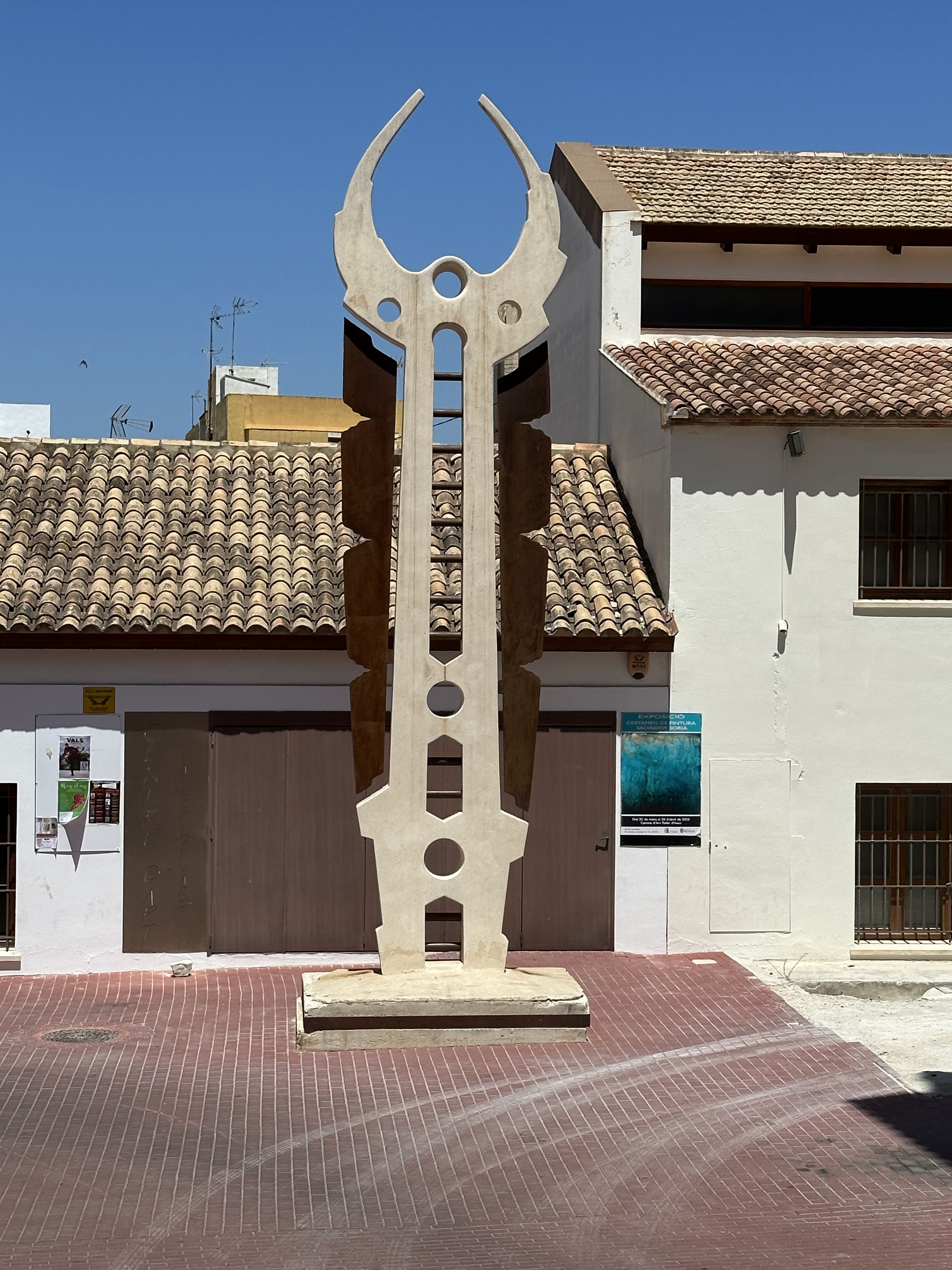 Las fotos siguientes pertenecen a la fachada de una pizzería (L’Orenga) en la calle Nou y a un raro monumento en la mencionada plaza G.Ivars. que no se si dedicado al toro o a qué; no he podido averiguarlo.