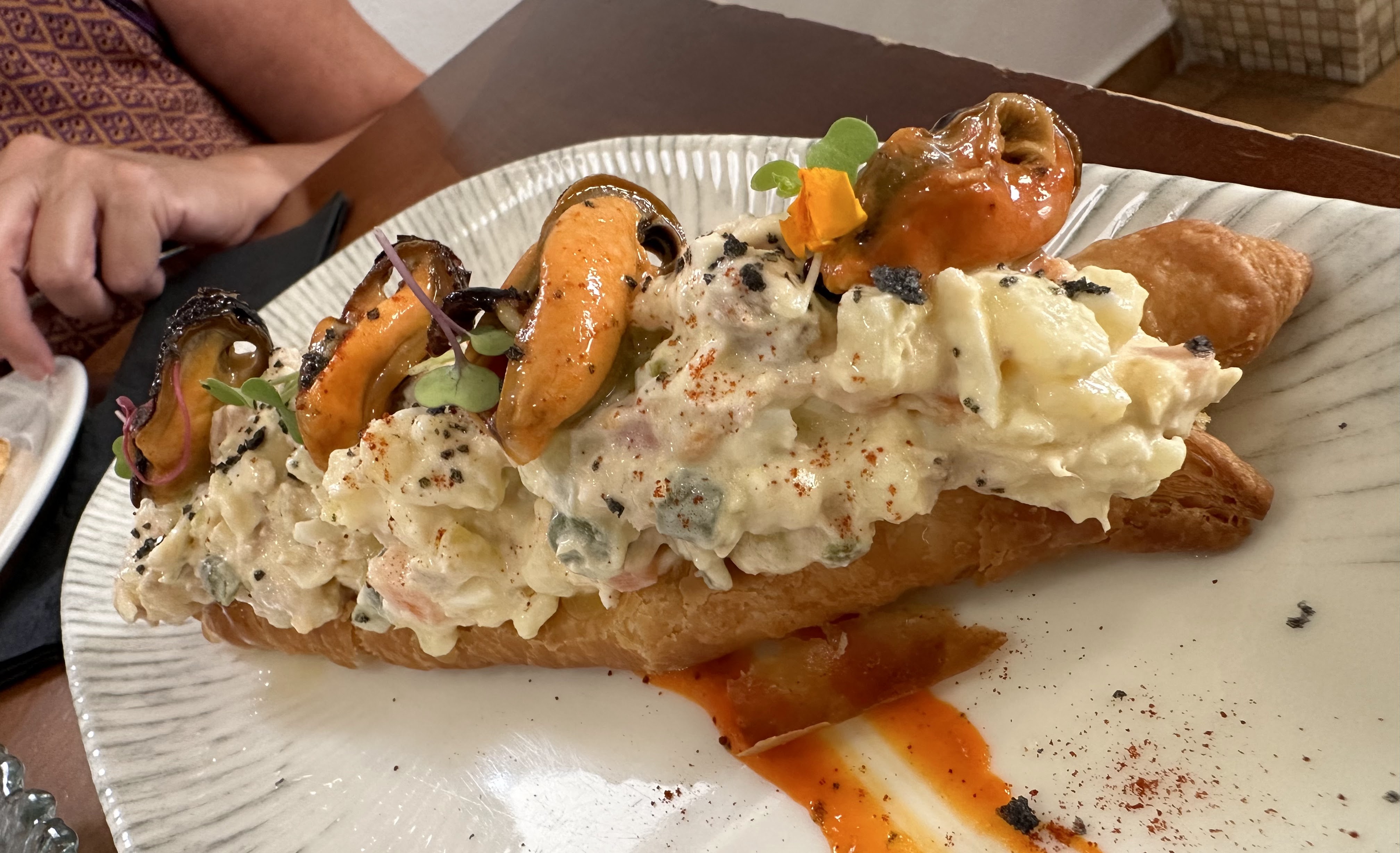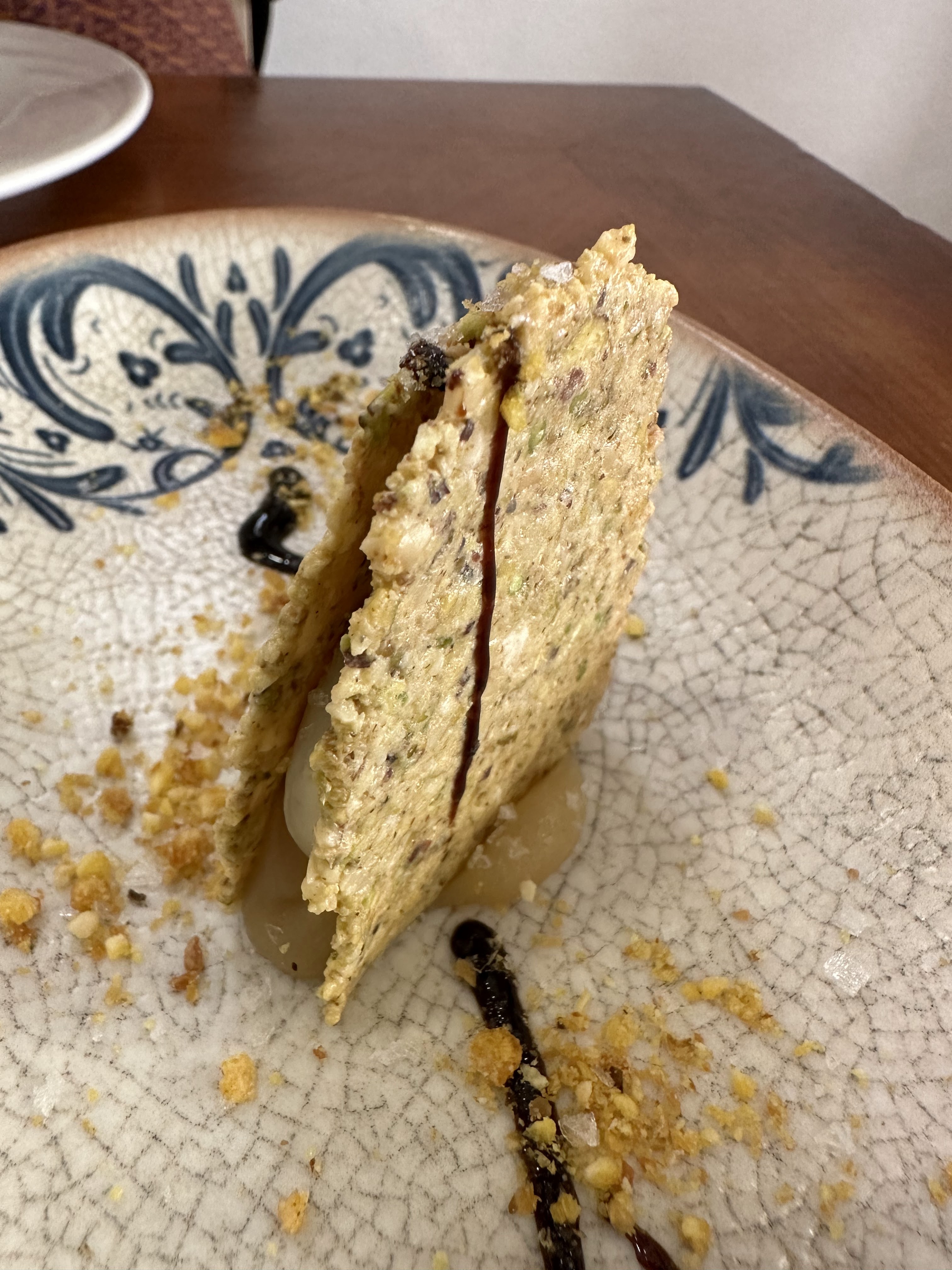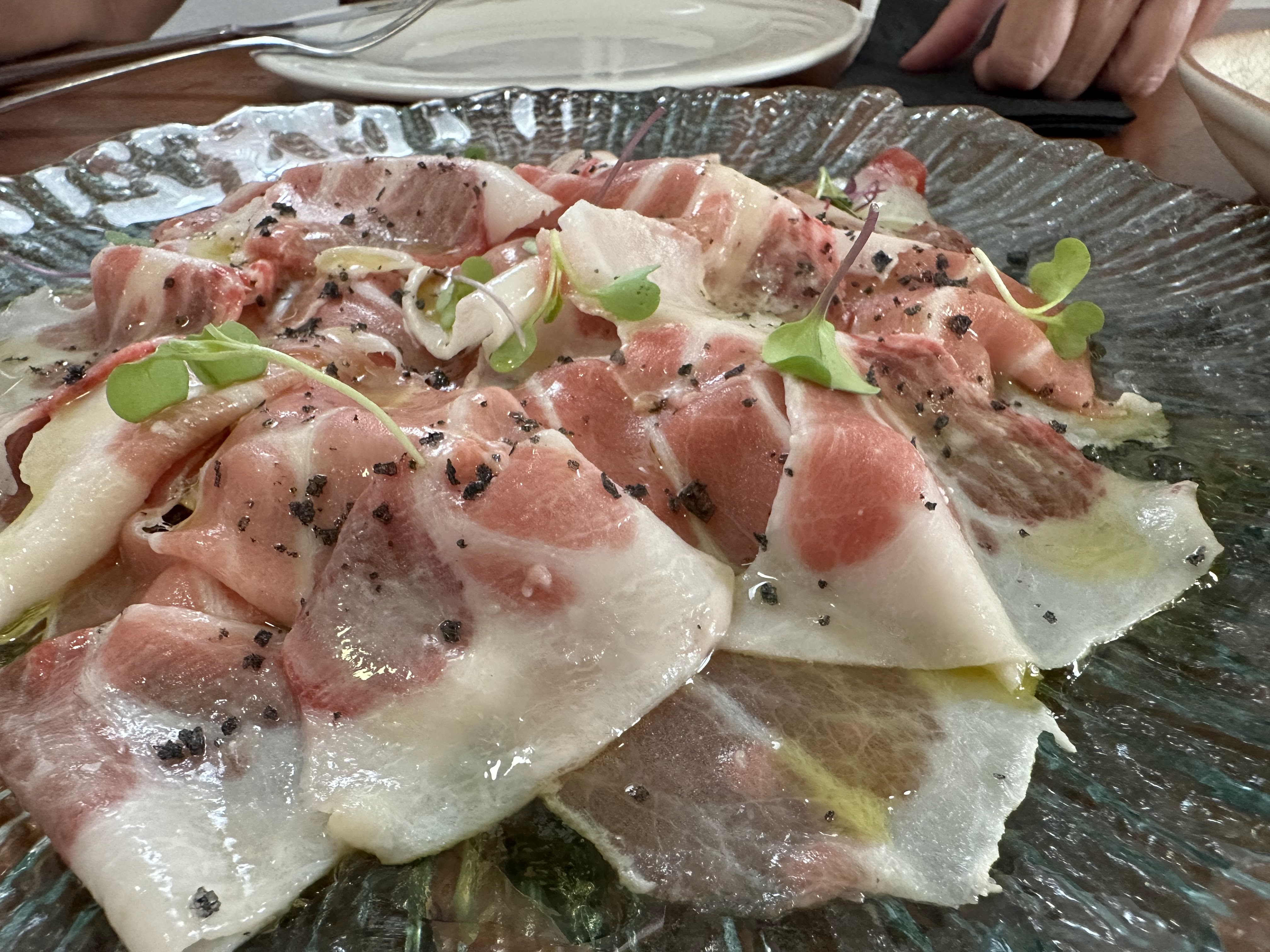 Galleta crujiente de pistacho y almendra con foie mi cuit y confitura de boniato (3,70 eur); Fartó, ensaladilla, escabeche valenciano y mejillones (6 eur); carpaccio de ventresca de atún rojo (16 eur); tortilla de confit de pato, foie y queso parmesano con aroma a trufa negra (15 eur).