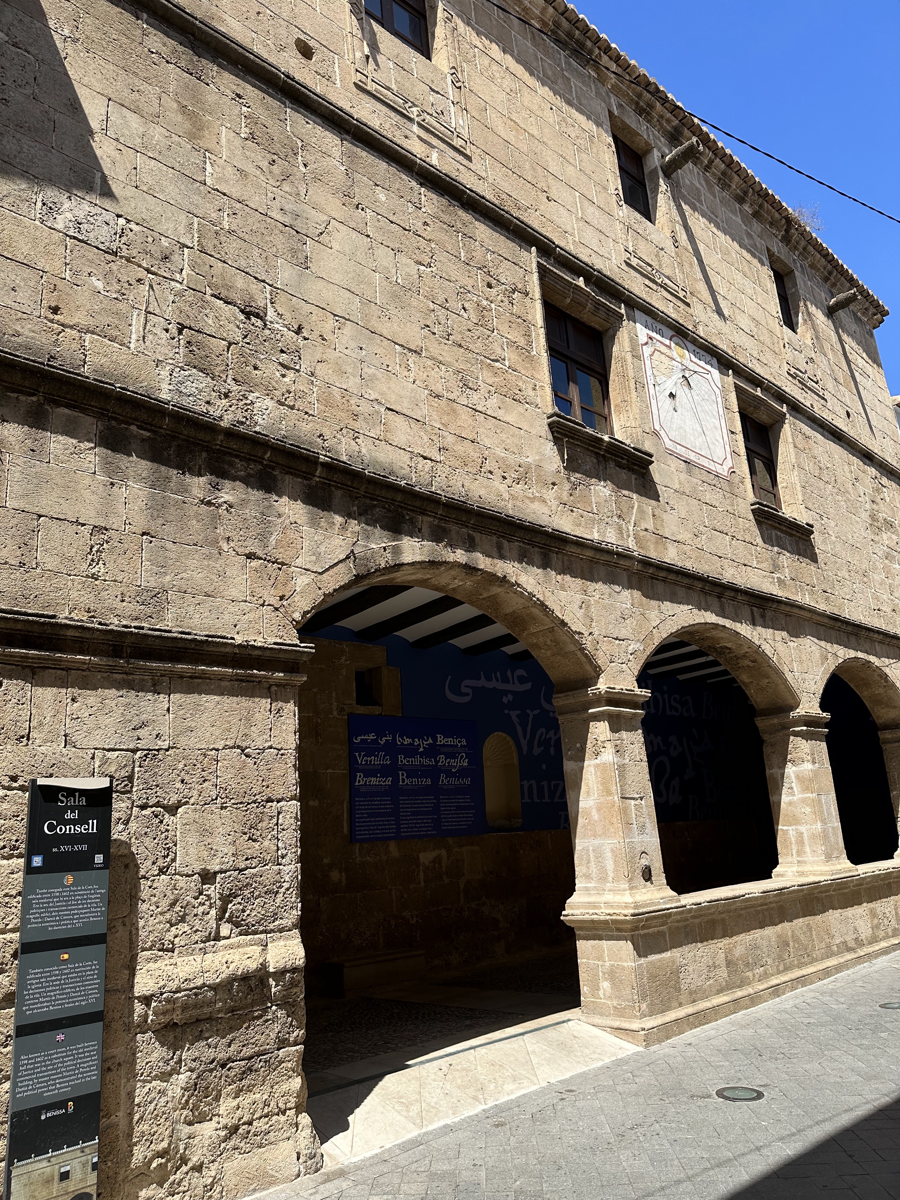 «La Sala del Consell, su edificio, fue construido a finales del siglo XVI en pleno centro de la Villa Vieja, en la antigua Calle Mayor. Su principal función fue la de almacén para la contratación y venta de trigo, comercio de vital importancia durante el medioevo. Más tarde cambió sus funciones a Casa de la Villa (lo que hoy sería el Ayuntamiento), alojando en sus estrechas salas al Consejo, el archivo, la prisión y los cargos administrativos de la época. Ya en el siglo XX sirvió como escuela unitaria (de Primeras Letras y Academia de Bachillerato). En su interior se conserva una máquina para mondar almendras, inventada y patentada por el industrial local Silvestre Ivars, que obtuvo un gran éxito en los años 30 del siglo pasado.»