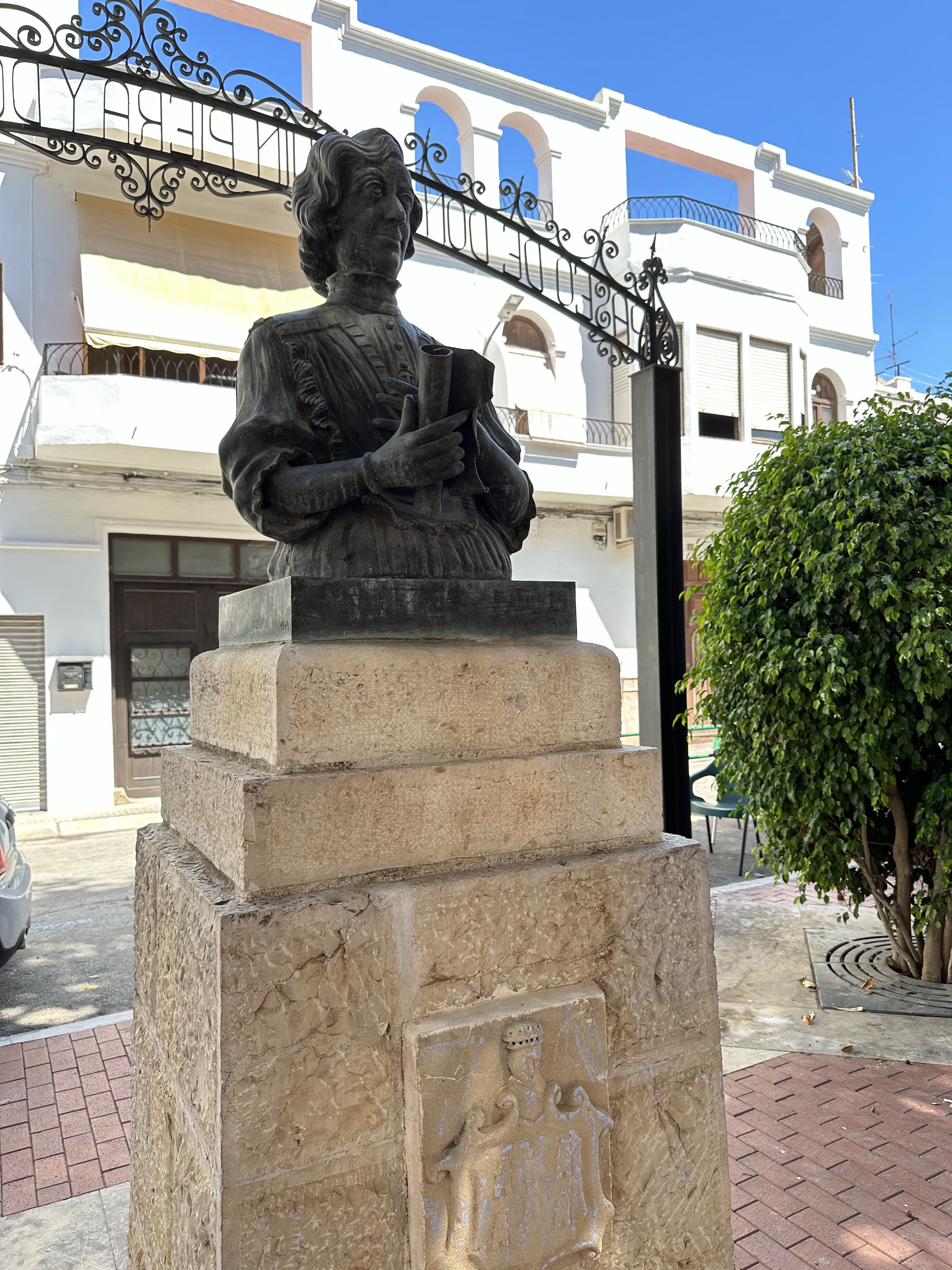 Esta última foto se trata del «monumento al riberero»; el «Riberer» es un personaje de honda tradición en la vida de Benissa. Durante siglos fueron muchos los benisseros que, dos veces al año, se desplazaban caminando hasta los campos de la ribera del Júcar, en la provincia de Valencia, (de ahí el nombre) para trabajar como emigrantes temporales en el cultivo y la recolección del arroz. En el camino viejo de Valencia existía una gran roca desde la cual se divisaba, por última vez en la marcha, el campanario de la vieja iglesia fortaleza. Allí, las cuadrillas de ribereros o «blavets» (como los llamaban porque solían ir vestidos con un blusón de color azul) se detenían y rezaban una Salve en petición de protección como despedida de su pueblo hasta su regreso».