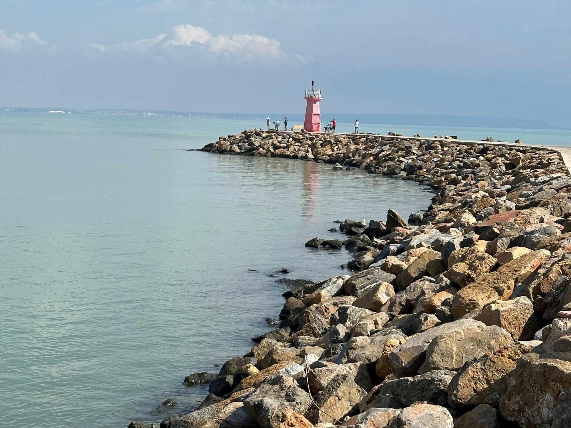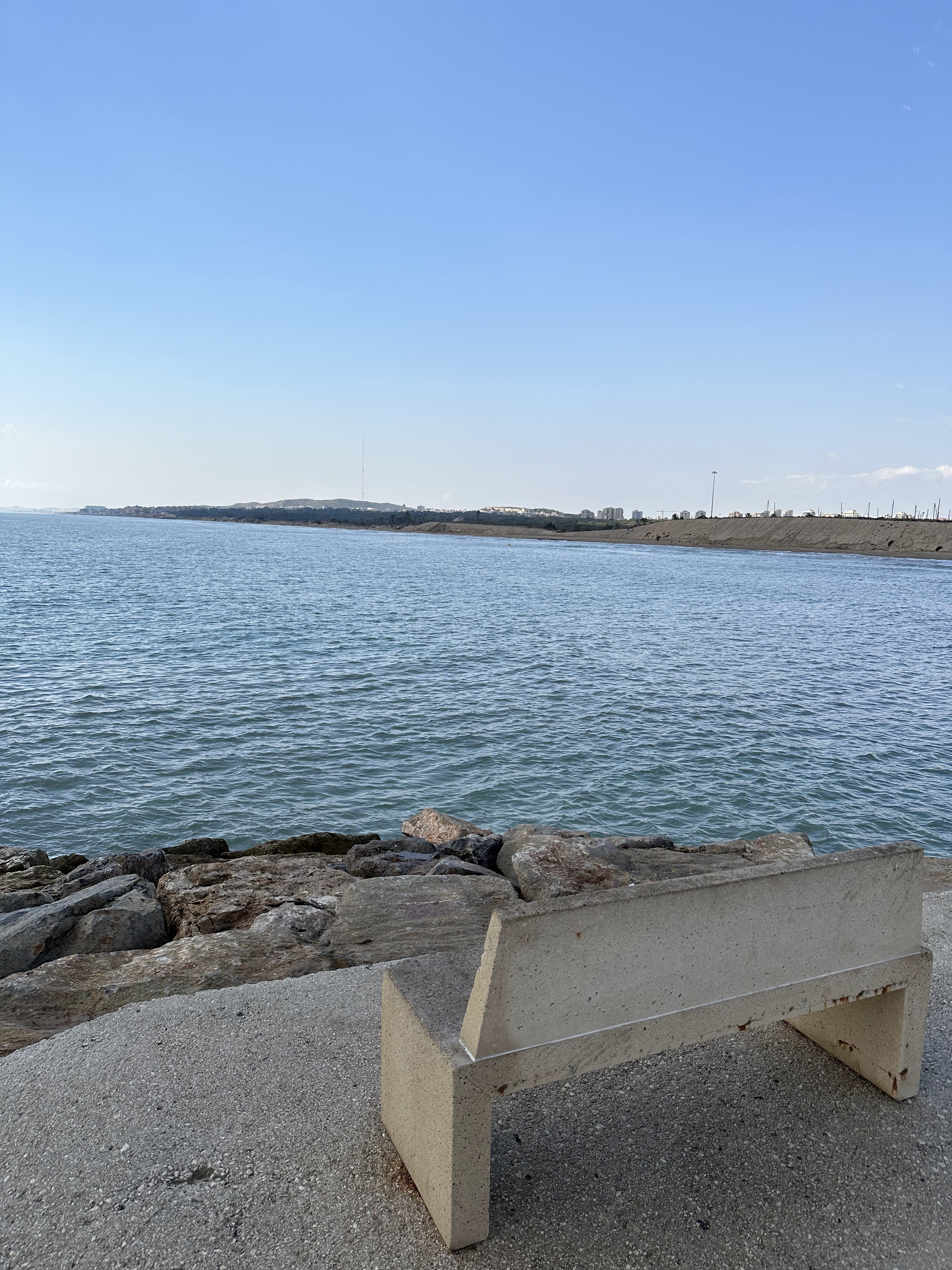 Bastante gente pescando en ese paseo al Faro y también de descanso en los bancos del mirador al Mediterráneo y a la desembocadura del Río Segura y su gola (canal navegable).