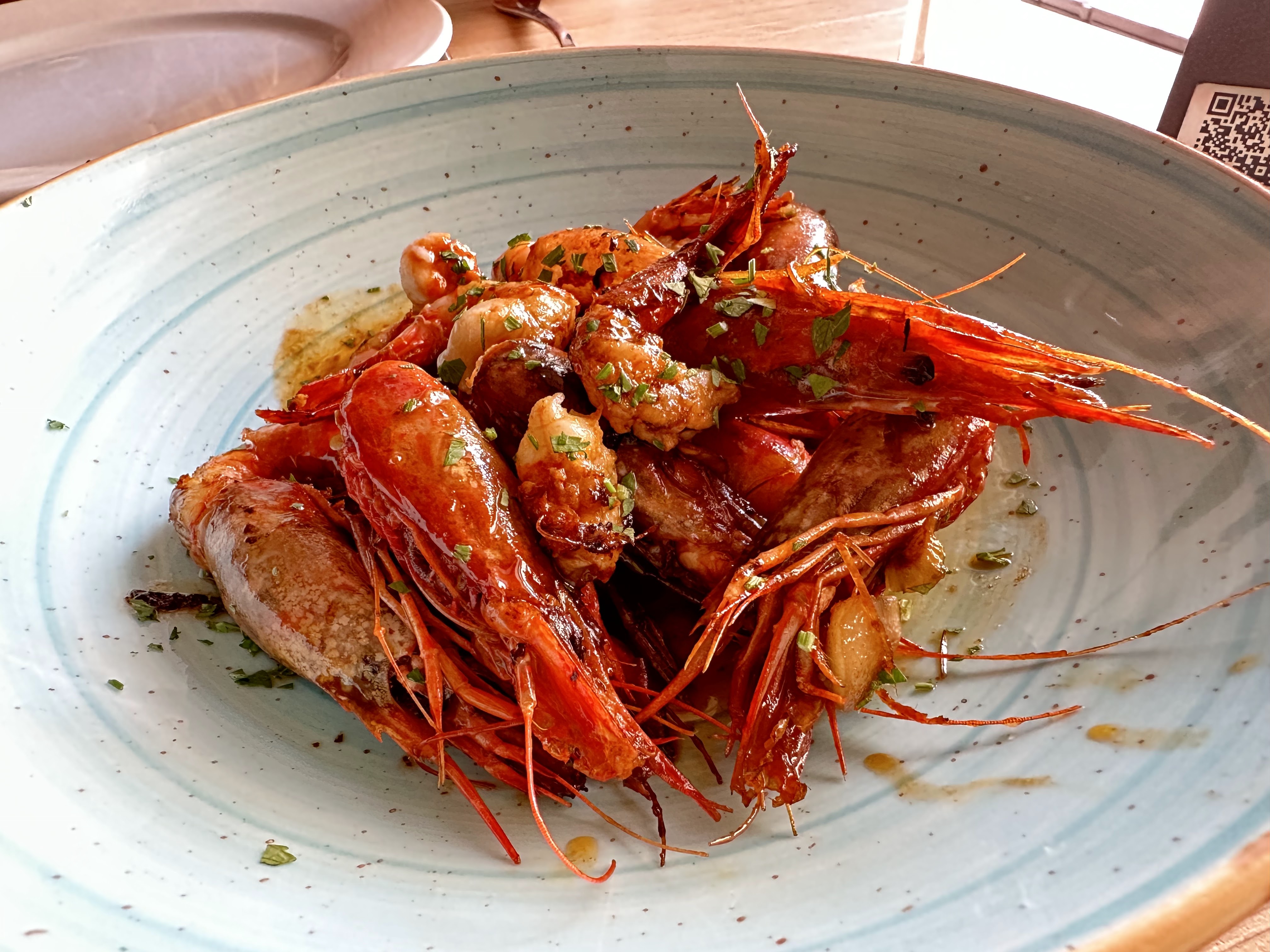 ½ ración gambas al ajillo (16 eur); ½ ración ensaladilla de rape (9 eur); quisquilla de Sta.Pola (15 eur) y un arroz de cangrejo azul de Guardamar (20 eur p.p.). Cervezas al principio, y un par de copas de vino blanco, albariño y godello (O Fillo da Condesa y Triay respect.) para el arroz.
