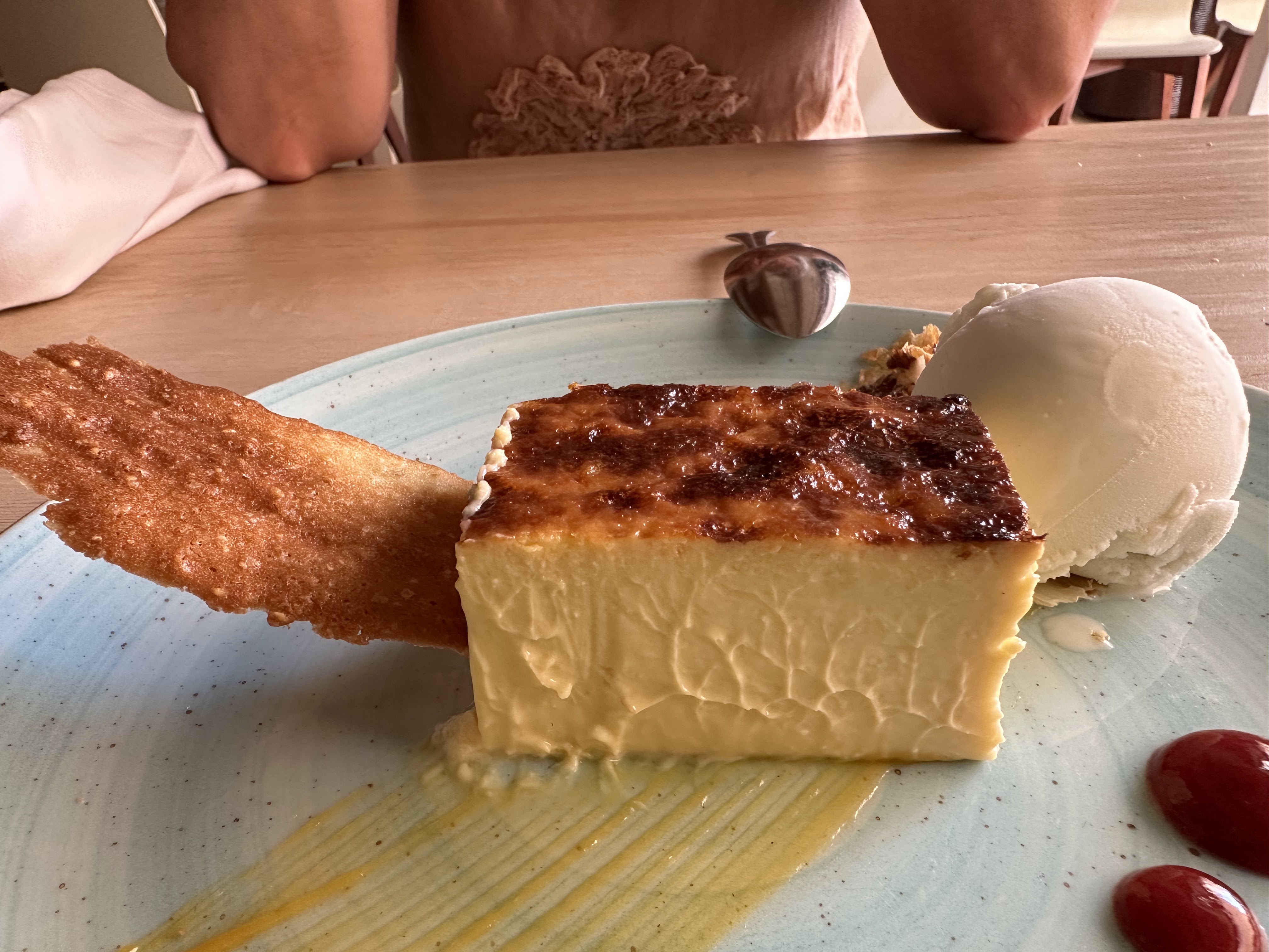 *De postre : Tarta de queso y bola de helado de queso de cabra; diferente pero cremosa y muy buena.