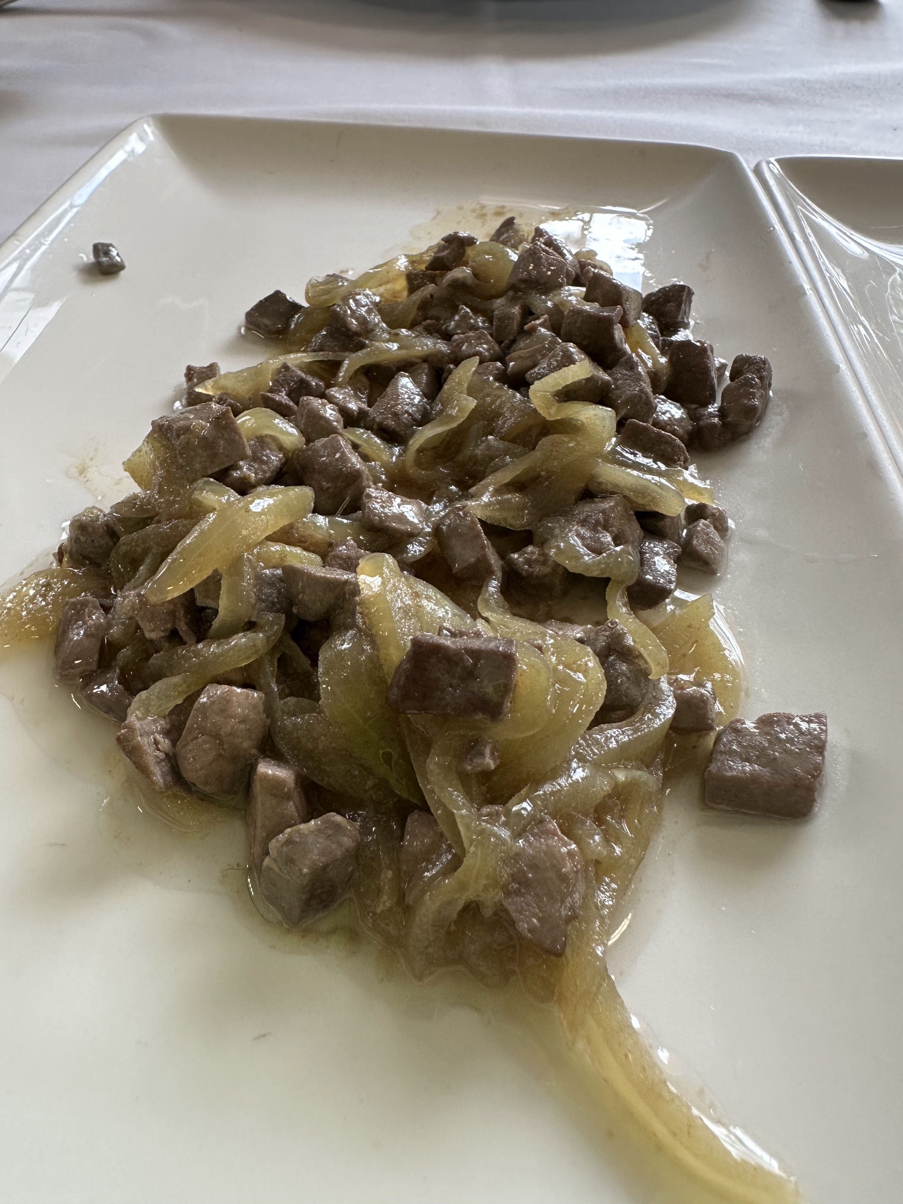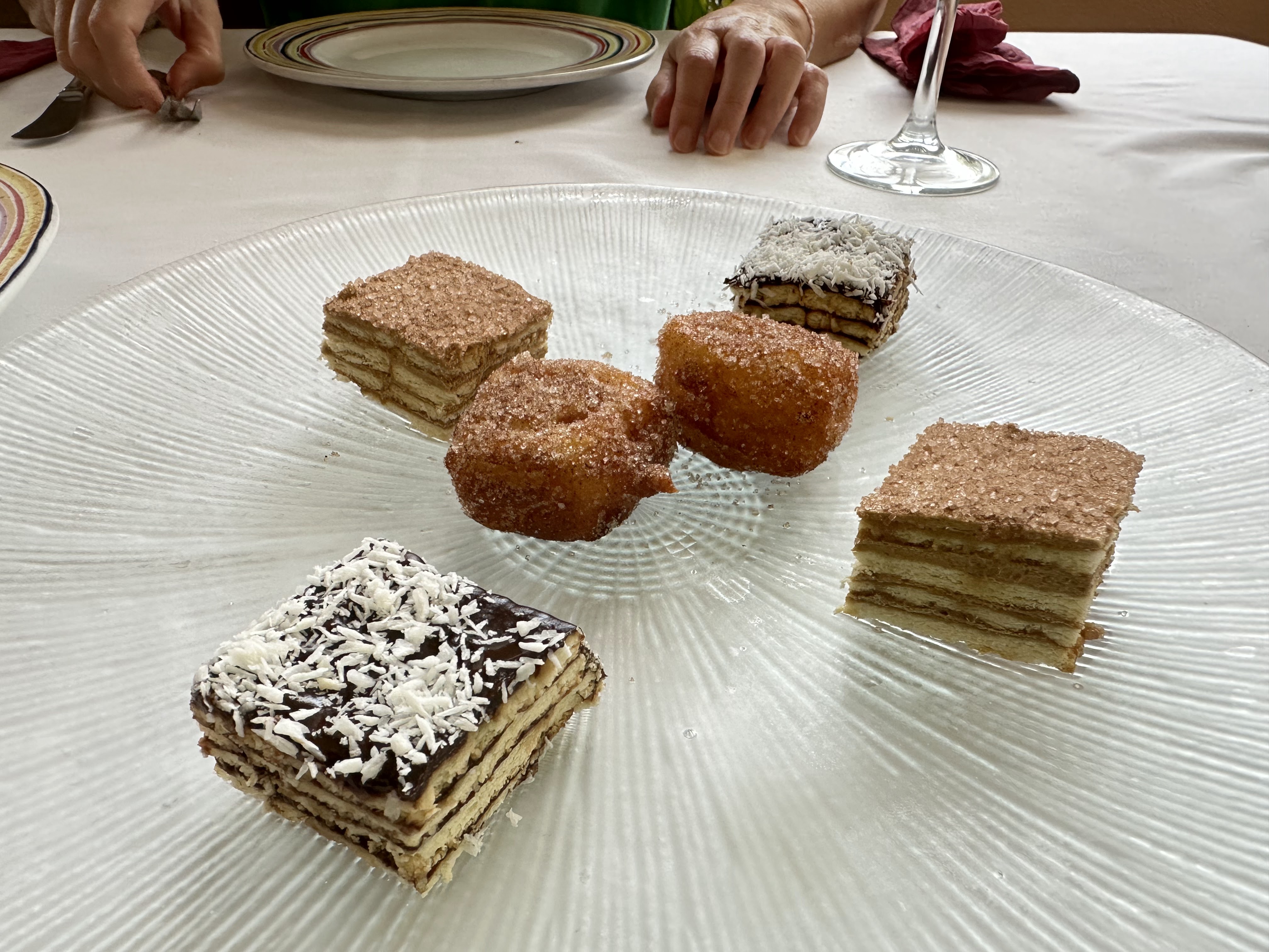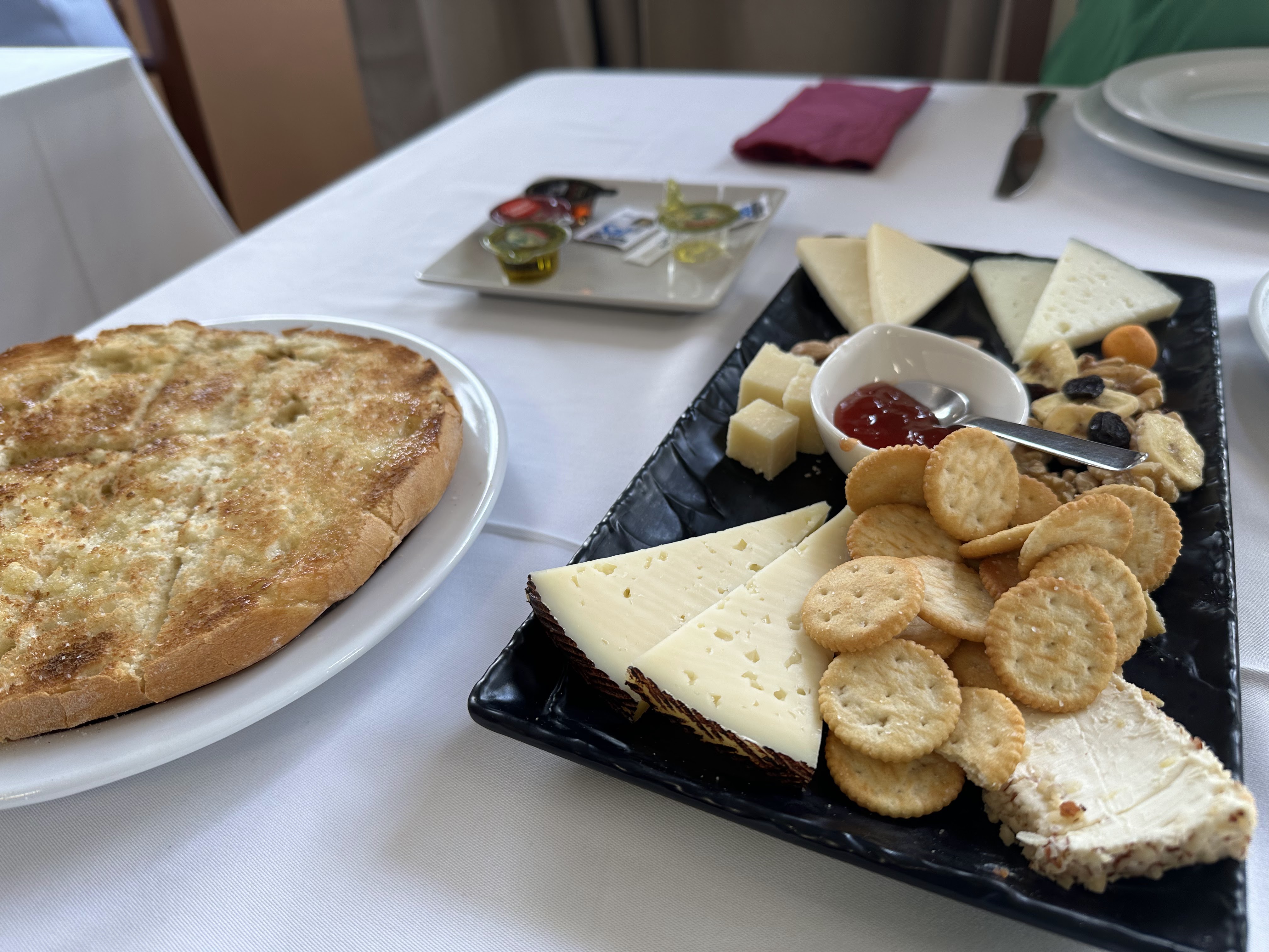 Tabla de quesos con frutos secos; tabla de embutidos caseros; ensalada de la casa; pan a la brasa con «pipirrana» (no era lo que entendemos por esto, era básicamente tomate con ajo); lomo de conejo con ajos tiernos; hígado de cabrito encebollado a la pimienta; arroz con conejo y serranas; frutas variadas y dulces de la casa. Incluía café, refrescos, cerceza y vino de la casa. 38 eur p.p.