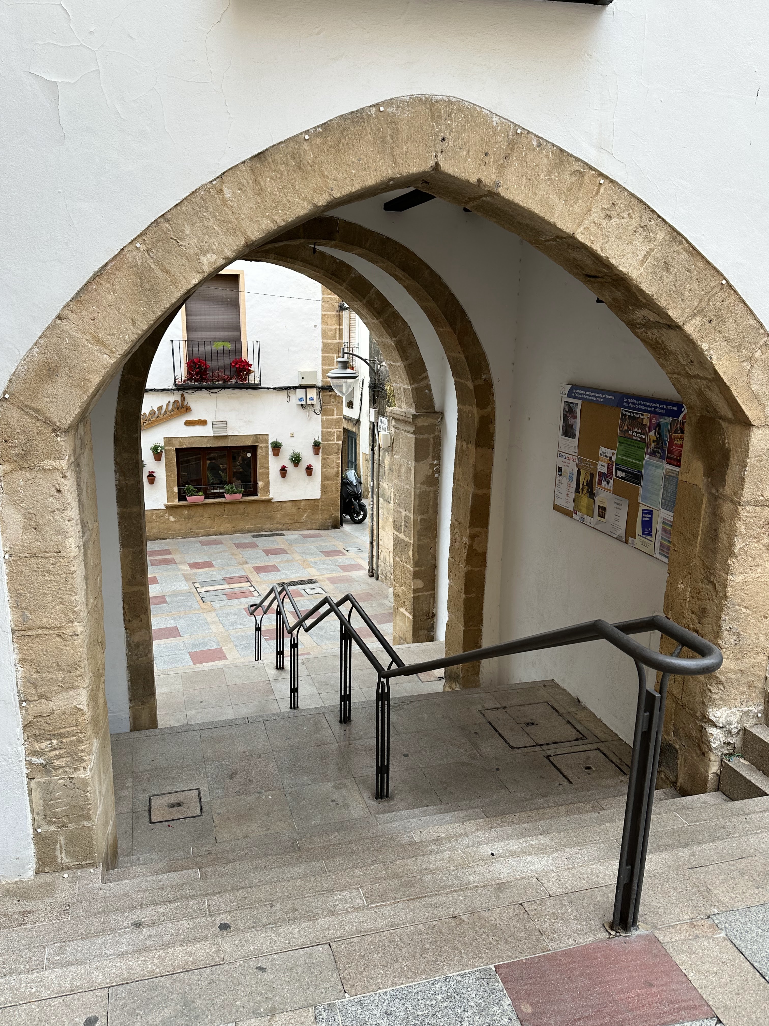 Justo al lado de la Oficina de Turismo sita ahí también, veréis un arco que salva uno de los desniveles existentes. Al fondo se puede apreciar la fachada del museo arqueológico y etnológico Soler Blasco, (casa-museo con pintura y arqueología).