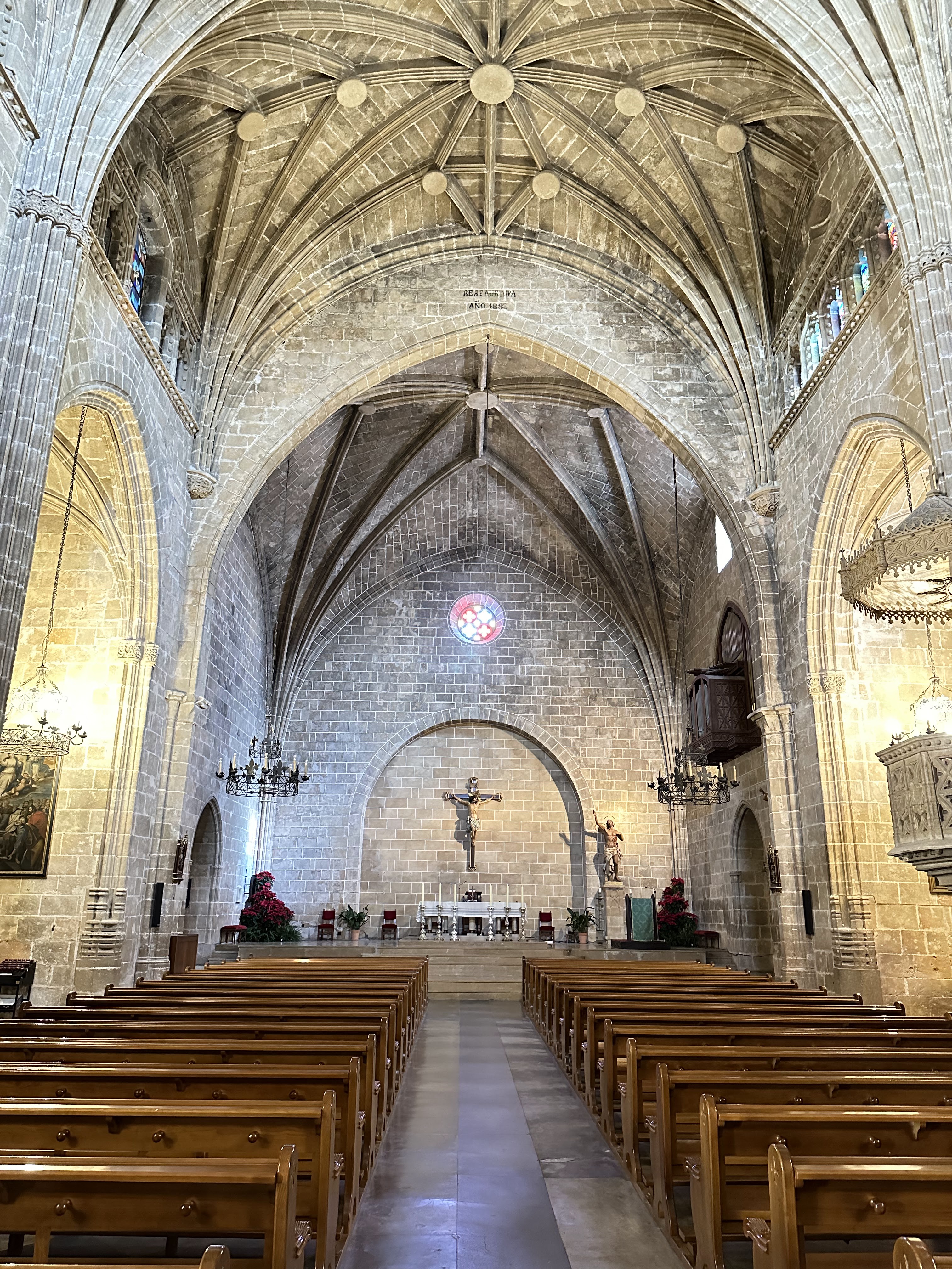 El interior está divido en tres naves. La nave central tiene unos 200 m de superficie y las laterales son más pequeñas. Originalmente estaban cubiertas por bóvedas y no tenían otra iluminación que las tres ventanas de la fachada, lo que potenciaba su contundencia y robustez, convirtiéndolo en un lugar más inaccesible.