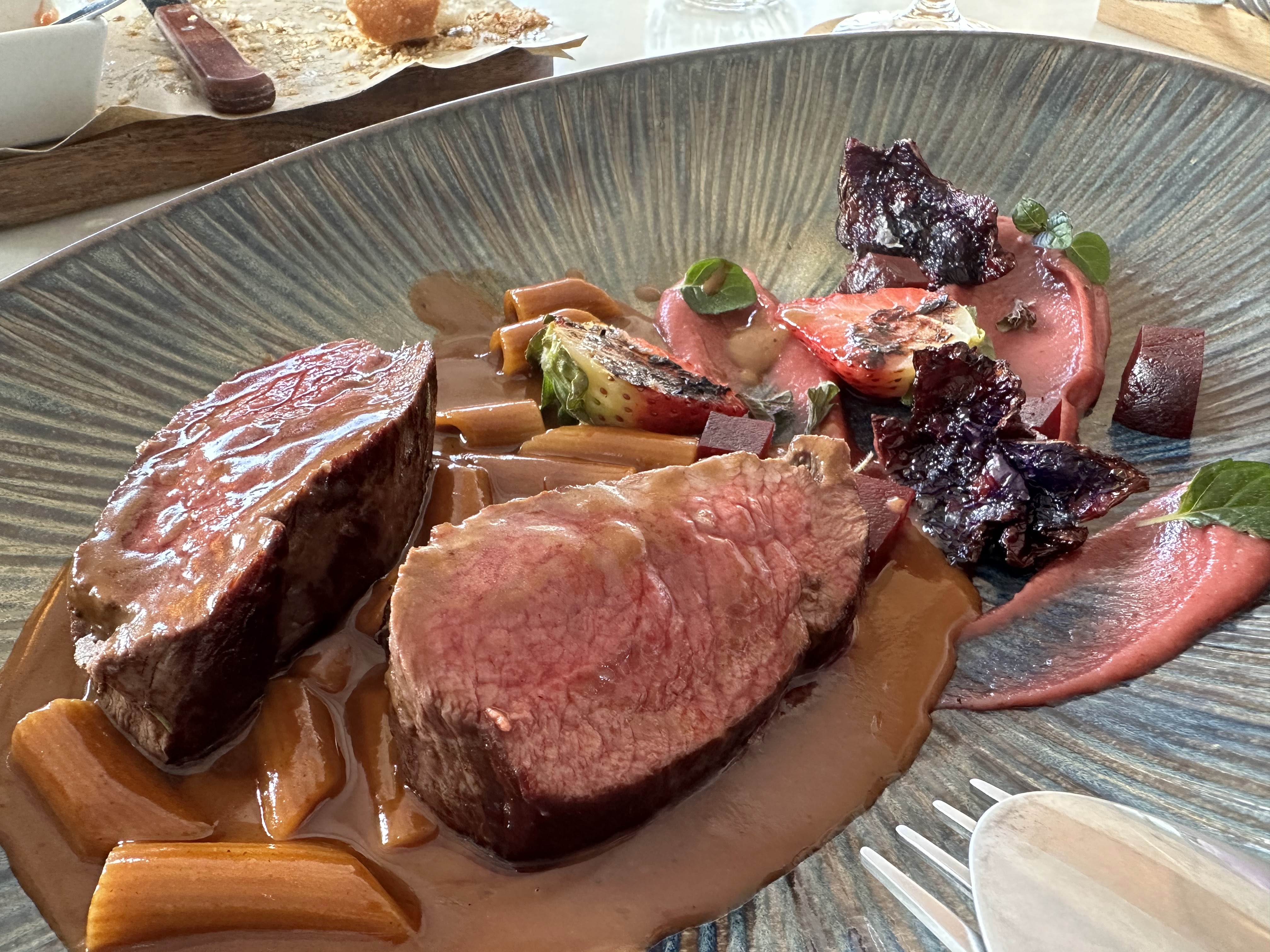 -Lomo de cierva toledana, pasta glaseada sobre su jugo, setas, remolacha, ajedrea y fresas a la parrilla.