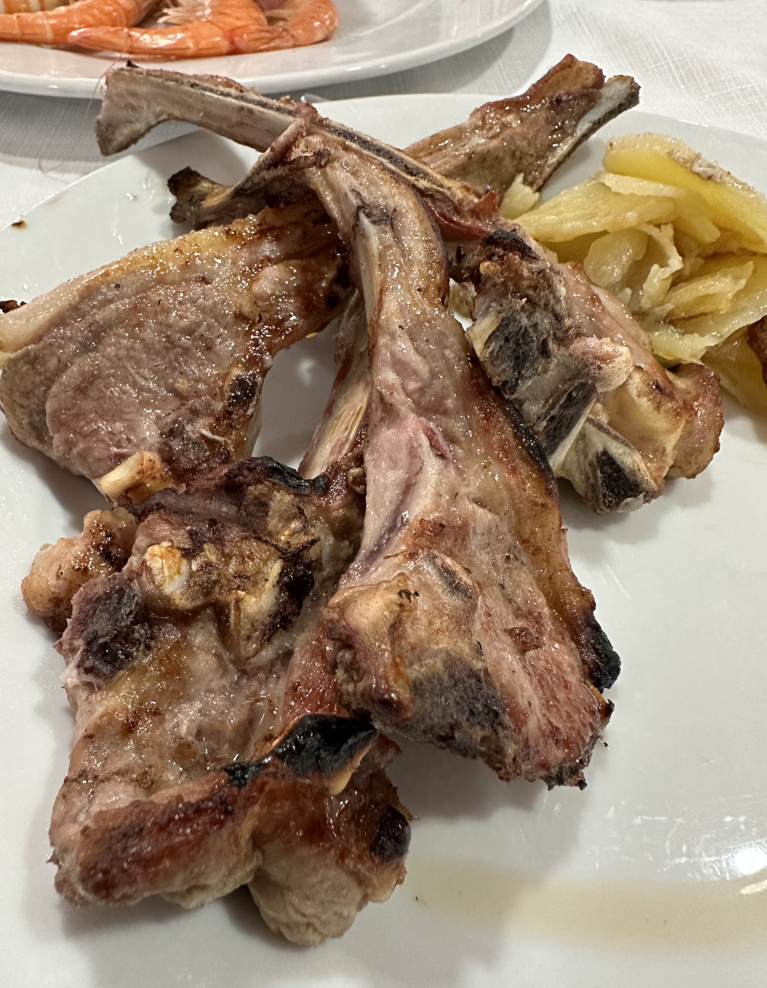 Casi no podíamos con eso ya y nos dicen si queríamos más aperitivo, nooooo….entonces había que eligir principal, entre pelotas y su cocido, arroz con costra, cordero a la brasa con patatas a lo pobre, los comentarios por internet y lo llenos que estábamos nos hizo pedir esto último, la carne.