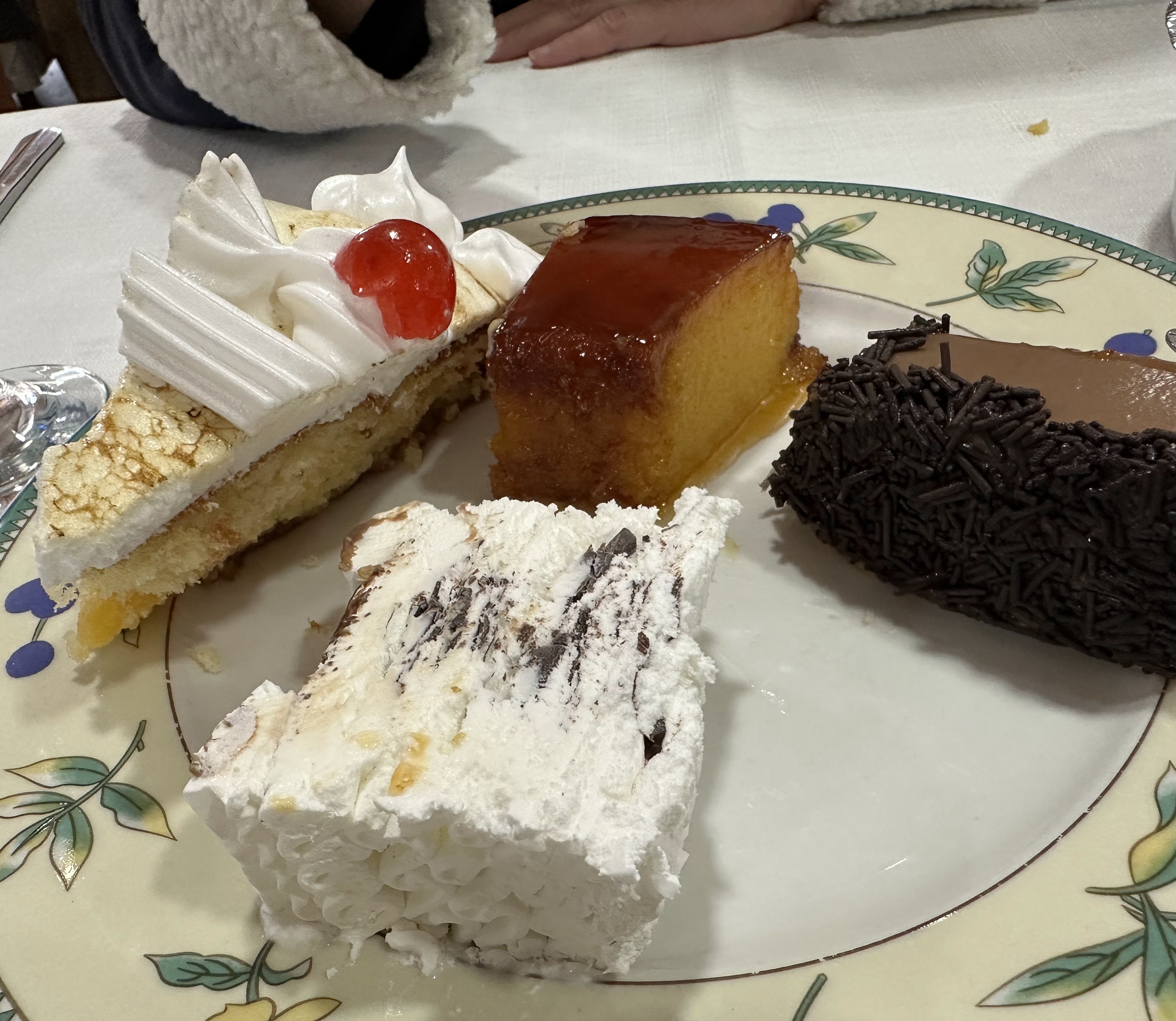 El postre un pupurrí, con una porción de tarta de merengue, de chocolate, tocino de cielo y comtessa, muy rica.