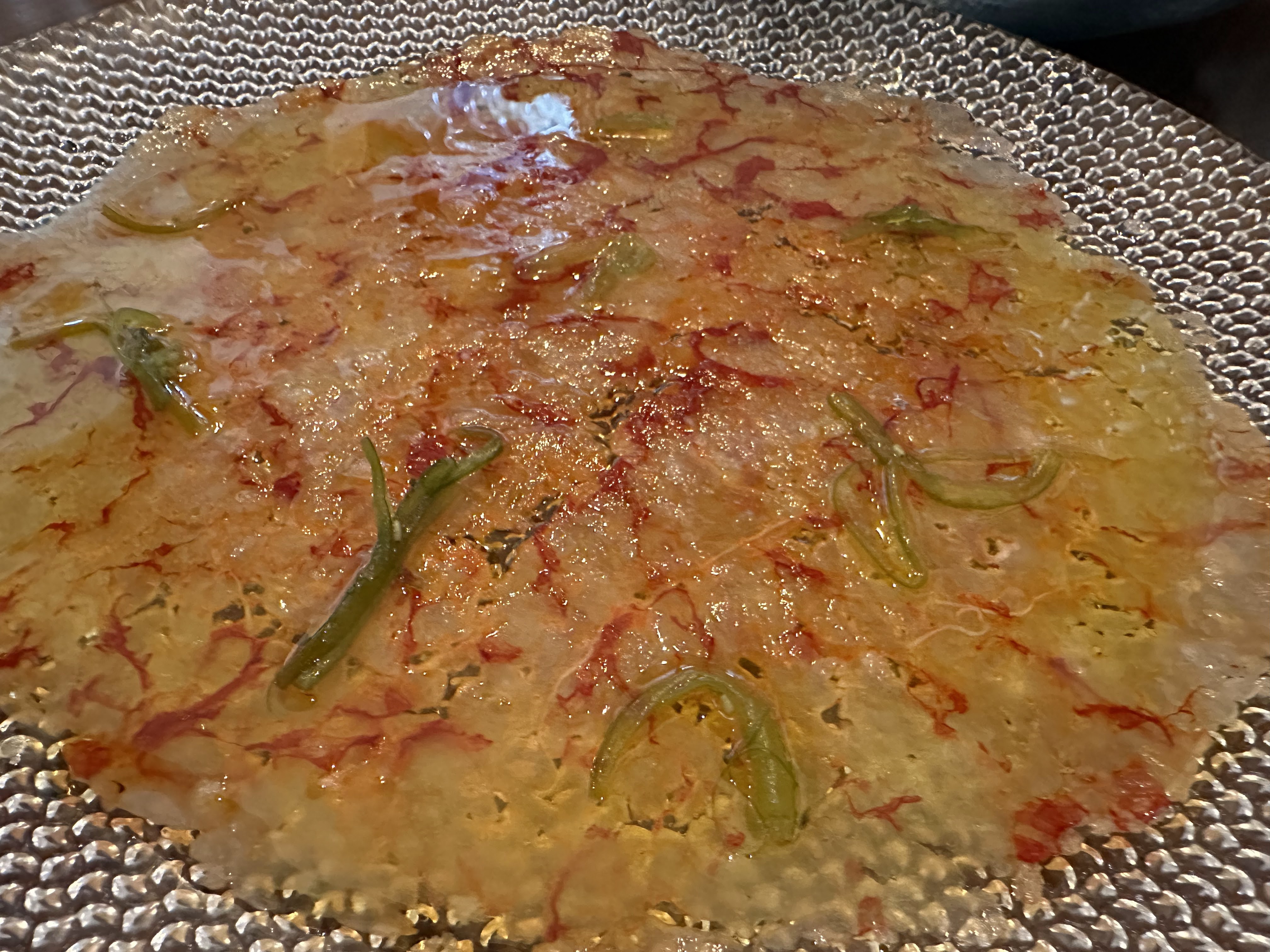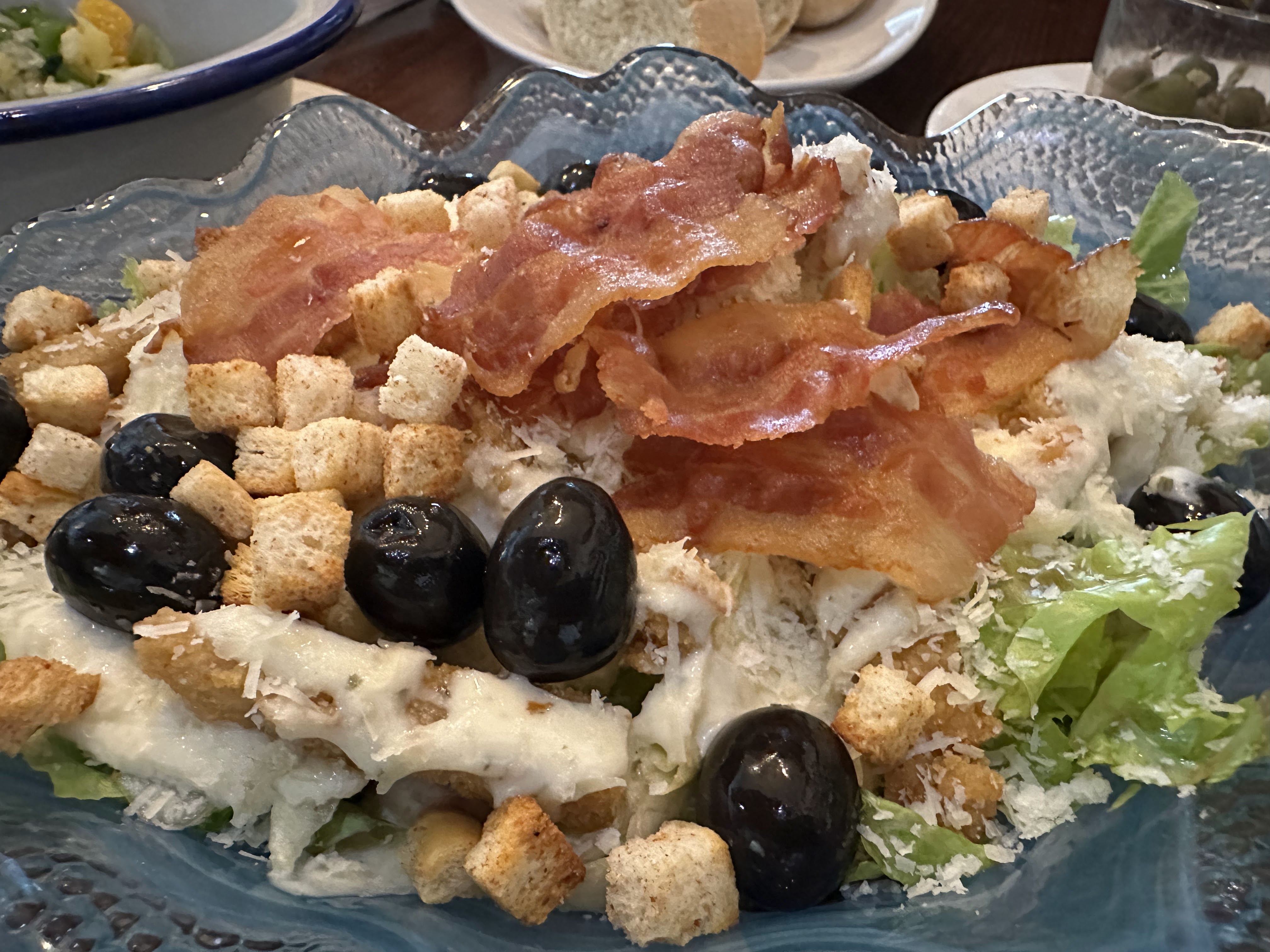 Los platos fueron un carpaccio de gamba, ensalada César y unas papas con huevos y aceite de trufa.