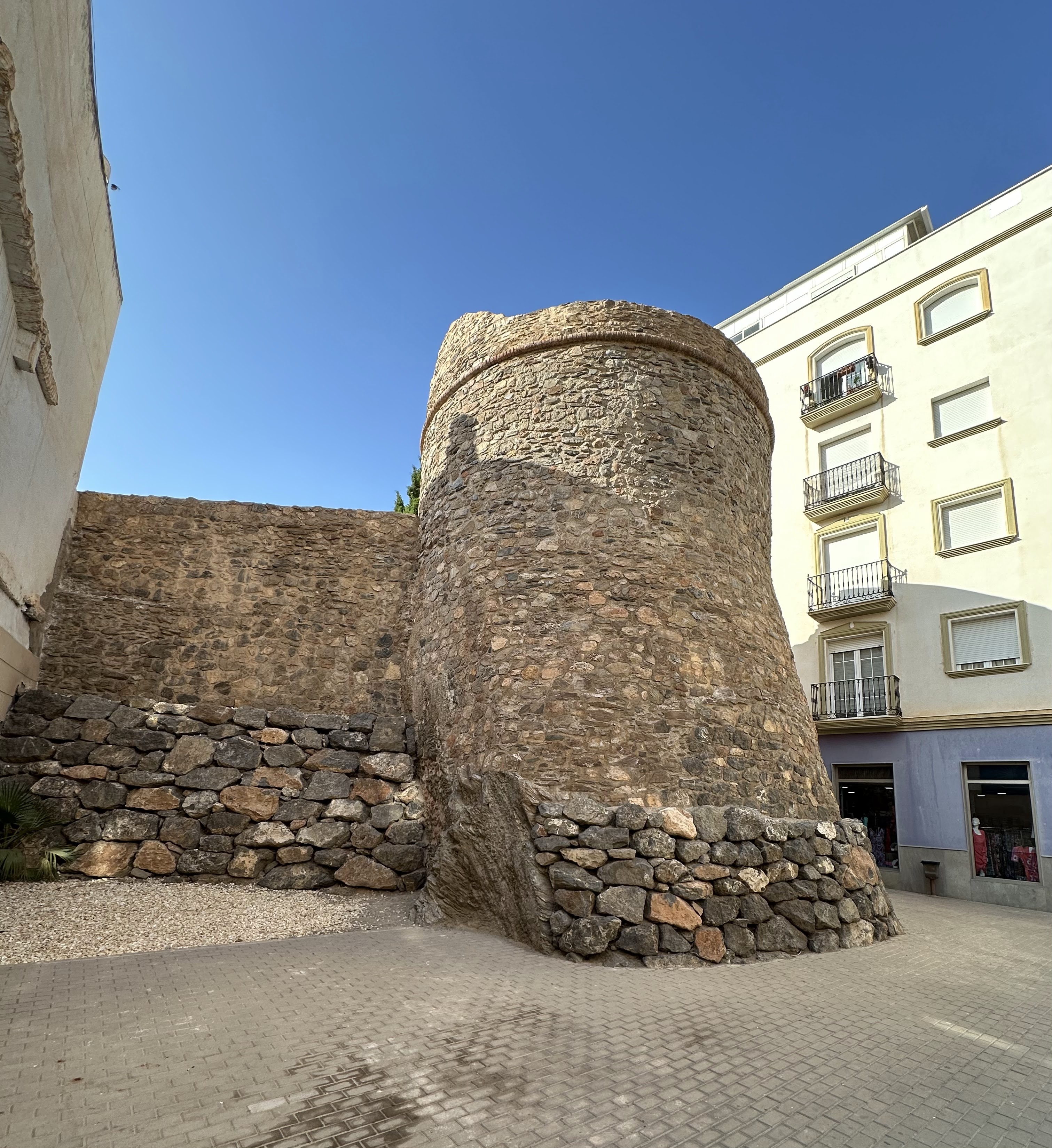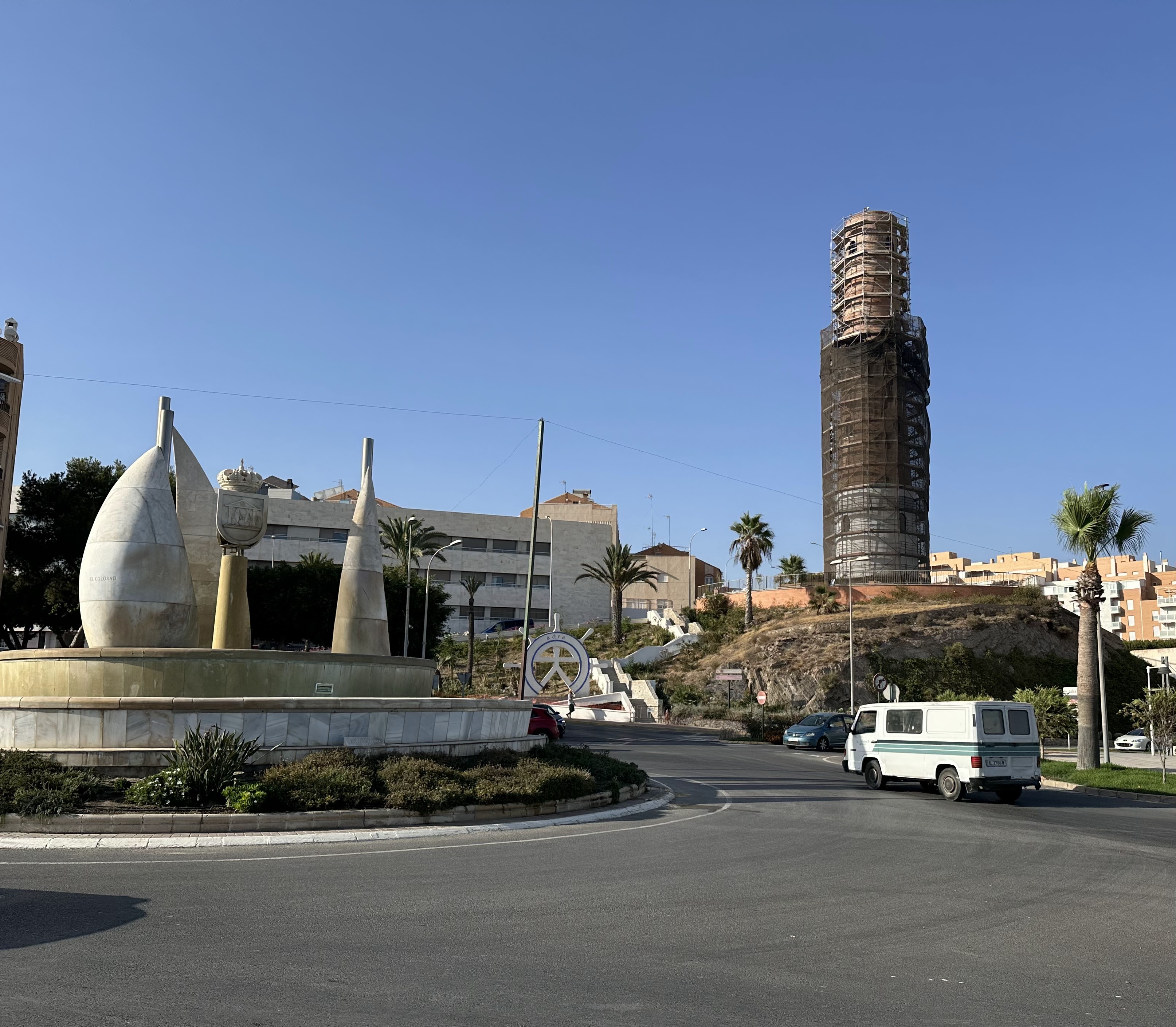 Existió el Castillo de Adra, pero vemos el torreón de la Vela incrustado entre casas; seguimos en la ctra.nal. 340a.»El castillo de Adra fue mandado construir en el año 1505 por la reina Juana «la loca». Con la intención de fortificar la ciudad levantó un castillo y las murallas, ambos elementos terminados de construir entre 1535 y 1568. Las murallas recogían todo el casco viejo de la villa y tenían aproximadamente siete metros de altura. En cuanto al castillo, era de planta rectangular y tenía torreones de más de 15 metros de altura. La fortaleza, que ahora se encuentra en ruinas, estaba compuesta por la plaza de Armas y una torre del Homenaje, que era llamada El Macho.»