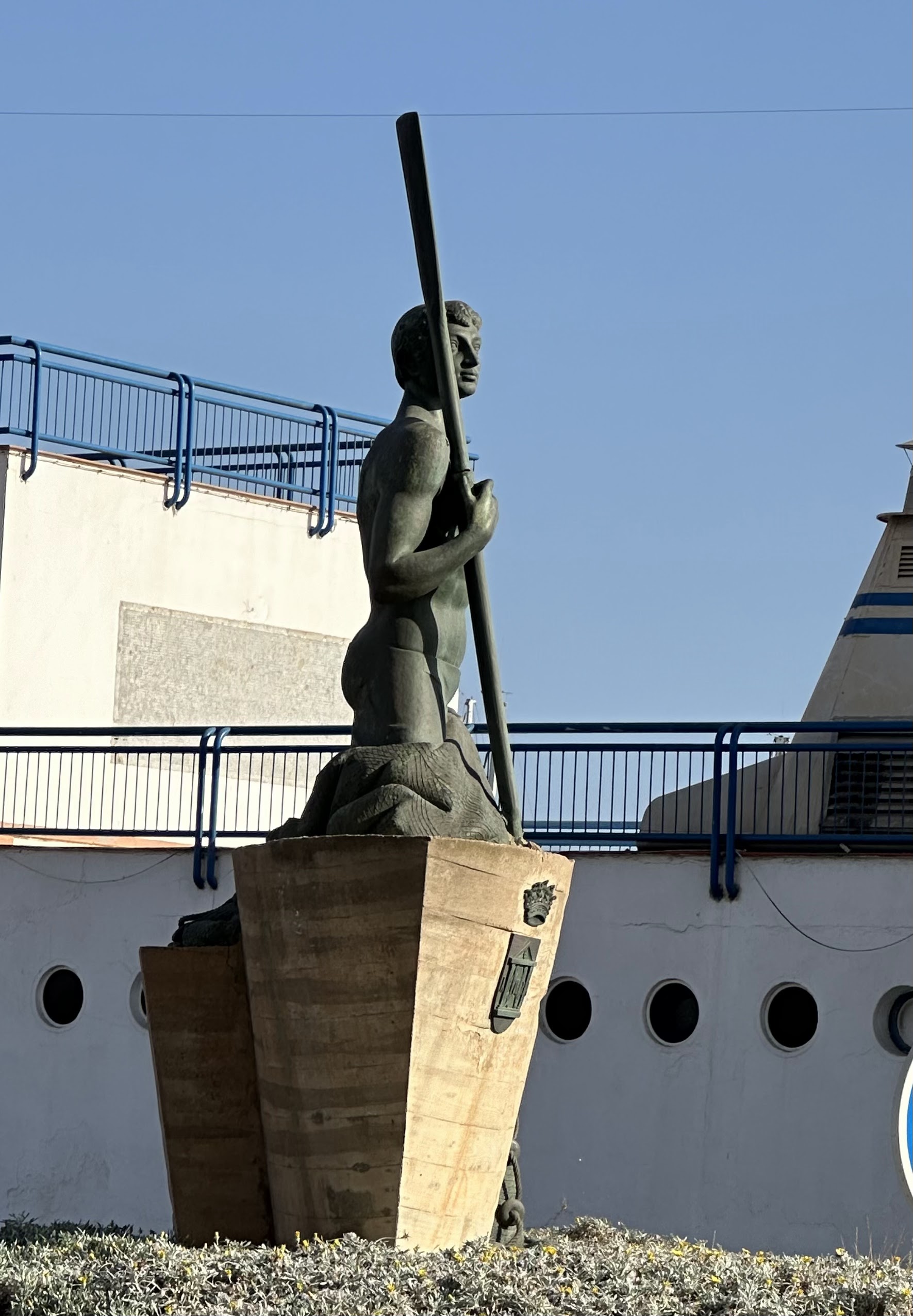 «El monumento en su mano derecha empuña un remo enarbolado y en la izquierda sujeta unas redes. En Septbre./2023 cumplió 40 años dicha escultura y que en principio llegó a estar en los jardines de la Isla con posterior traslado aquí.»