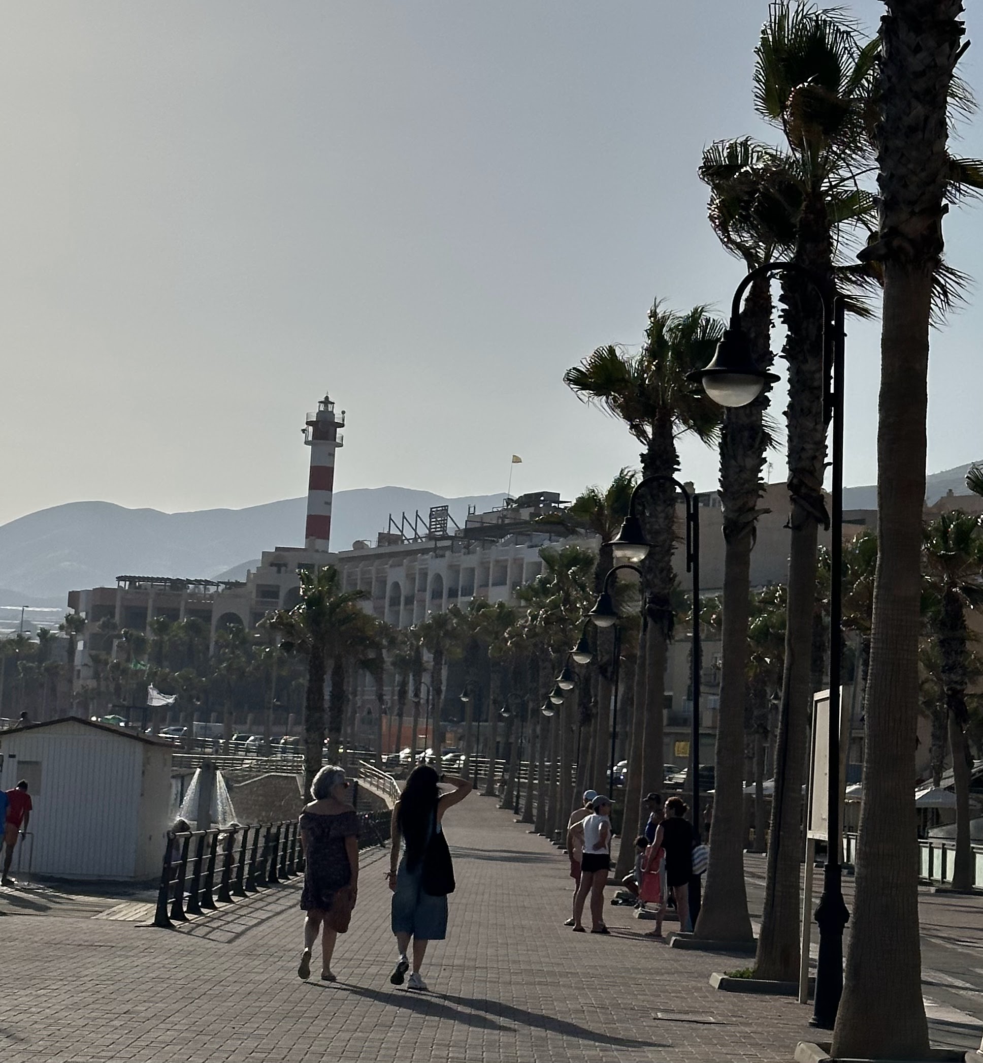 Andurreo entre palmeras con el faro de Adra al fondo, tal y como se aprecia también en la siguiente foto.