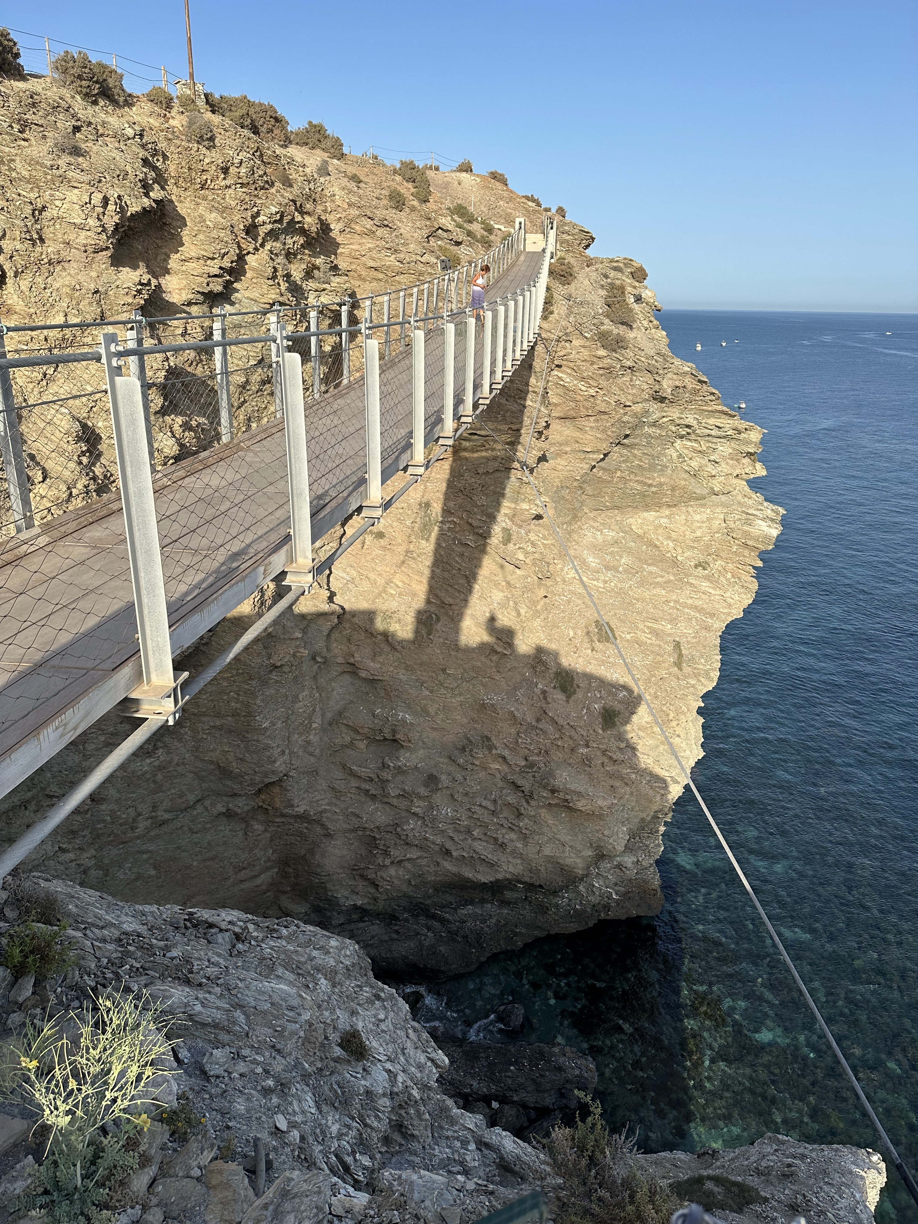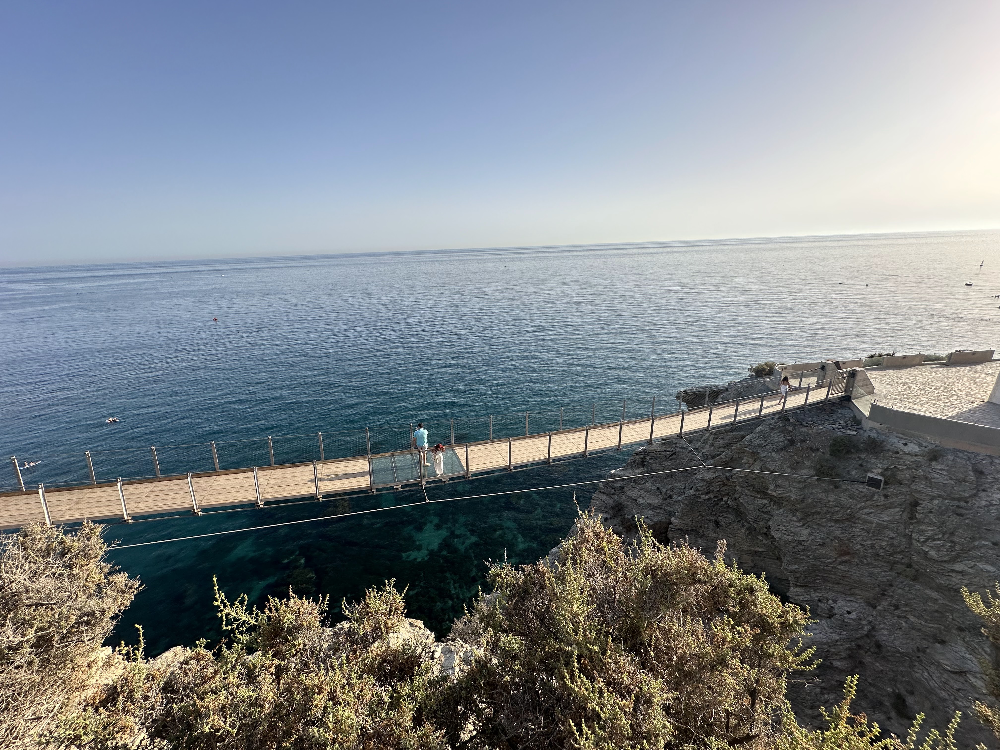 Tarde con 29º y nos vamos en coche a ver la Pasarela Colgante del Jolúcar en Torrenueva/Granada.»Bañado por el Mediterráneo y arropado por una montaña que alcanza a tocar el mar con hermosos riscos llenos de vida, nuestro municipio ha logrado darse a conocer con la primera pasarela sobre el mar de la costa mediterránea española.