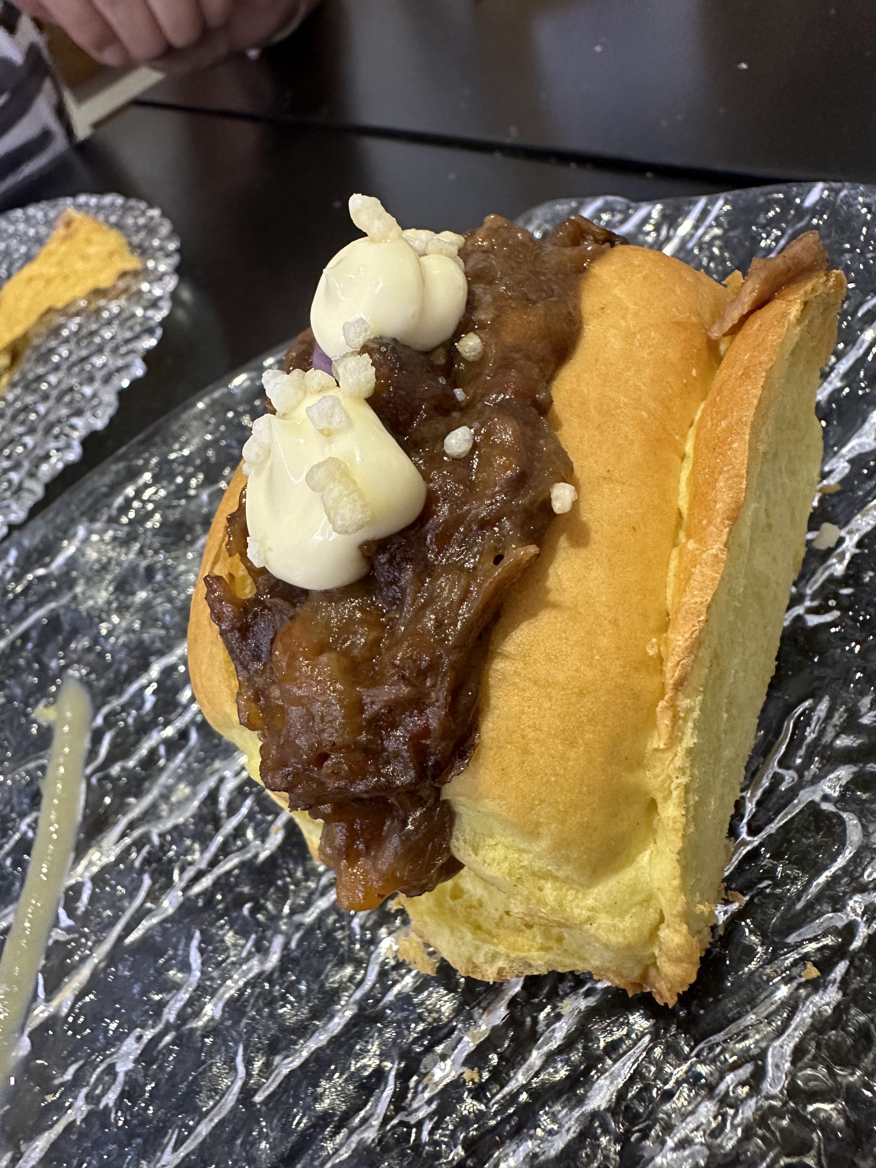 Acompañamos con un taco bonito escabechado casero, un pepito, brioche carrillada, alcachofa en flor, ravioli de foie, buñuelos rape y kataifi (que tardó lo suyo porque al parecer no estaba pedido a cocina).
