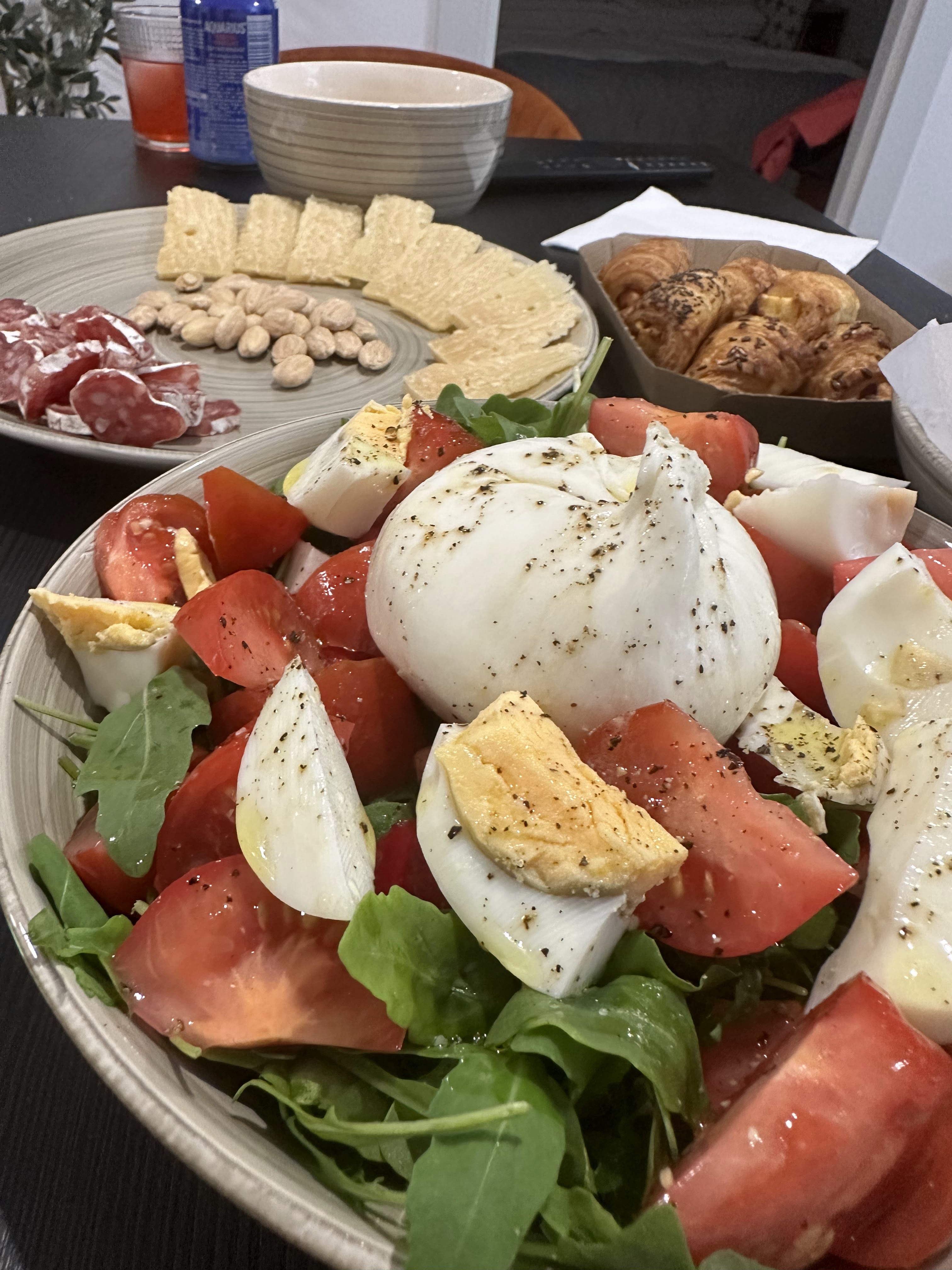 La cena de nuestra última noche en Adra fue en casa, con una ensalada de burrata, lomos comprados en el súper, y poco más.
