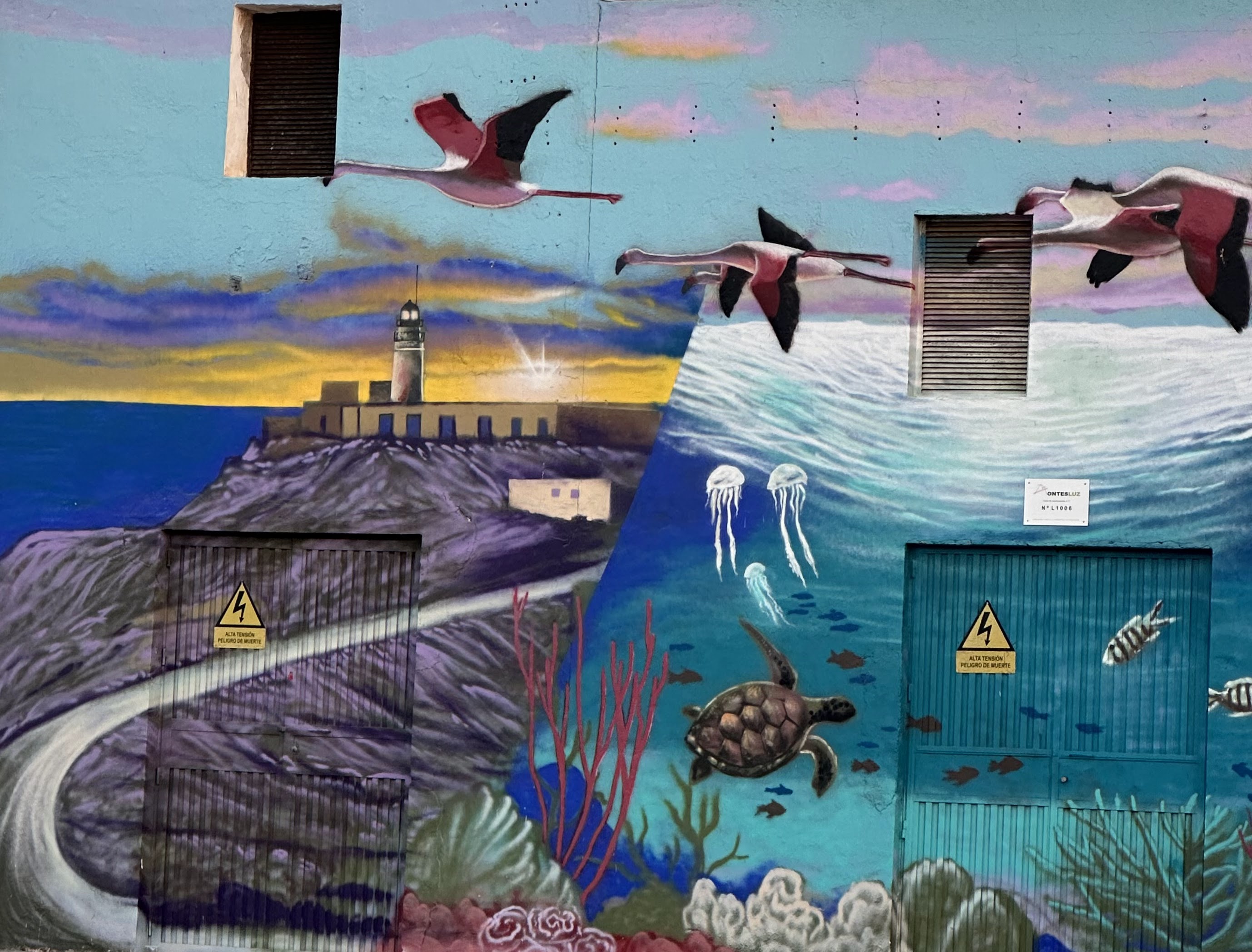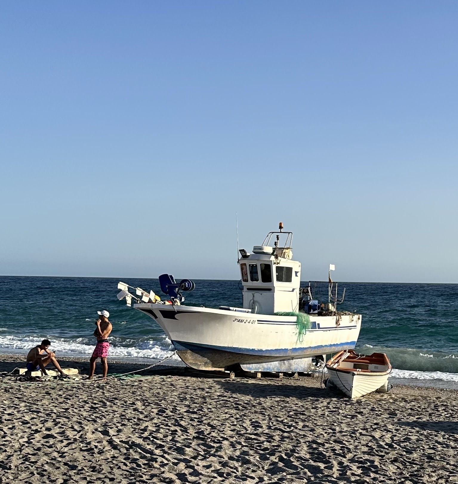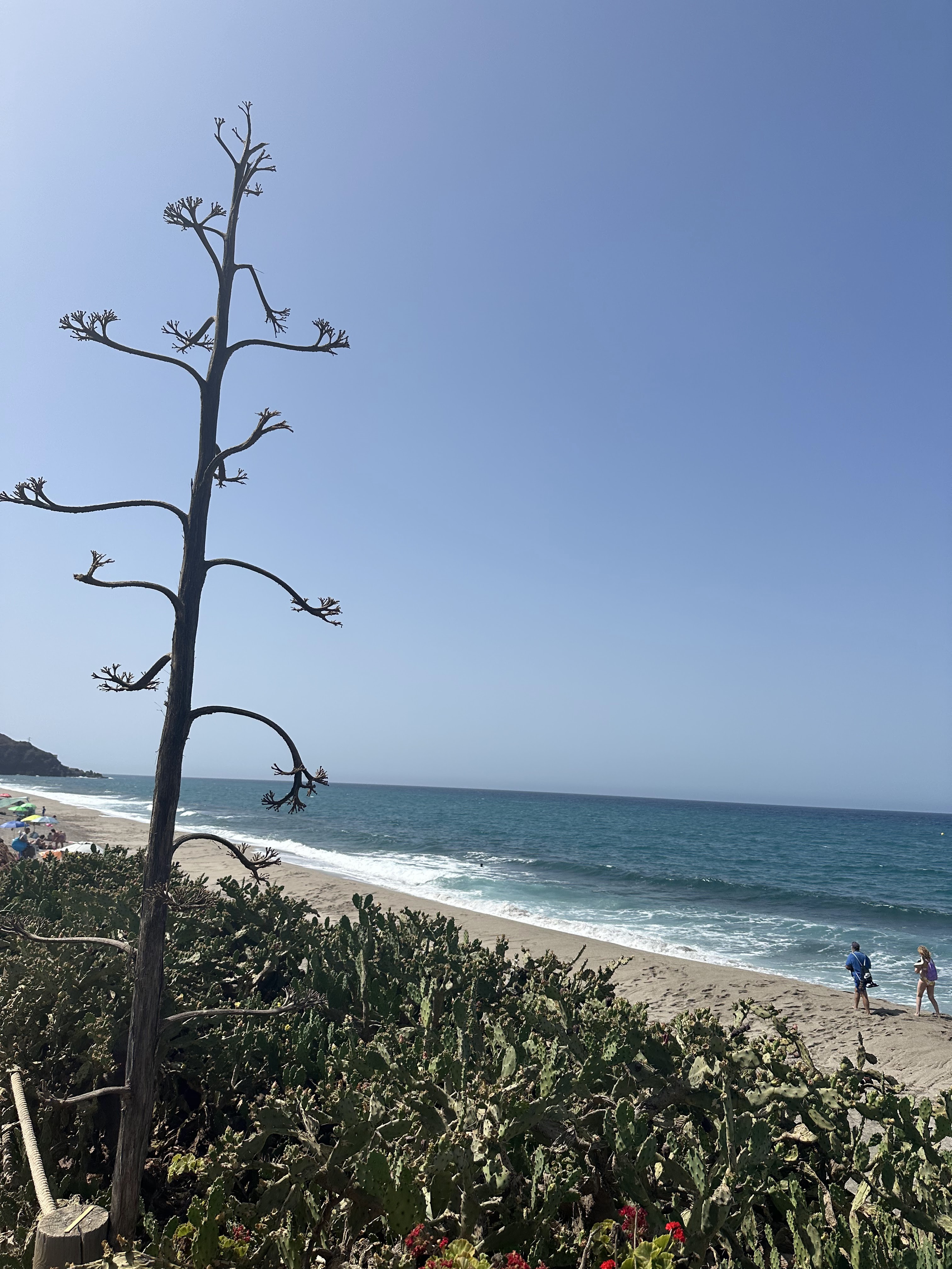 Llegué hasta el Torreón de San Miguel, allí mismo y cerca de nuestra ubicación. También de las barcas de pescadores y del chiringuito Chiri-Bus donde me compré una botella de agua de litro fresquica y donde escuché «el que quiera arroz que se vaya al pueblo, aquí no»; echada la botella en mi mochililla proseguí andurreo pero esta vez hacia el lado contrario, el que estuvimos anoche en el paseo Miramar, llegando hasta el chiringuito Sonia y Boni en el final de la playa.