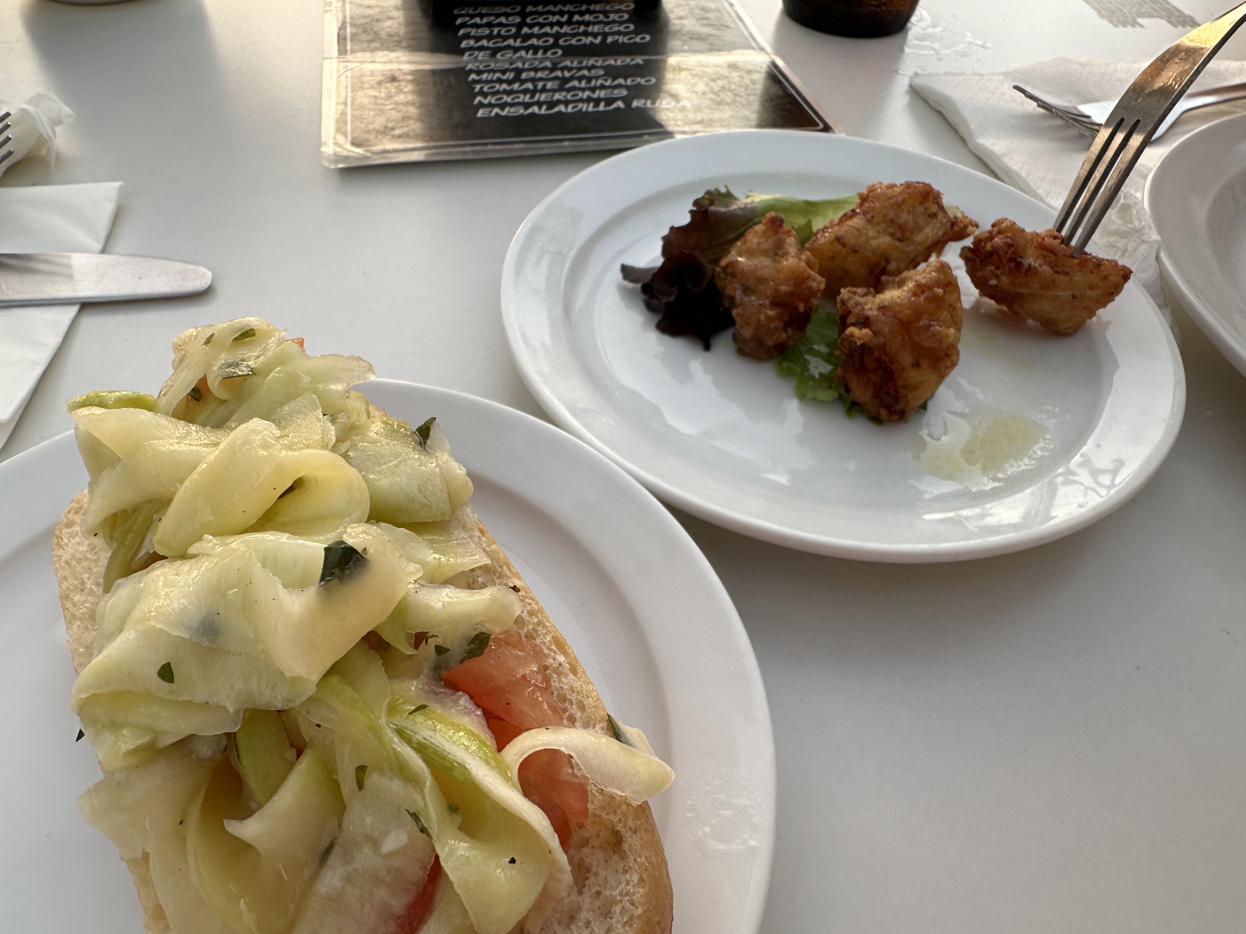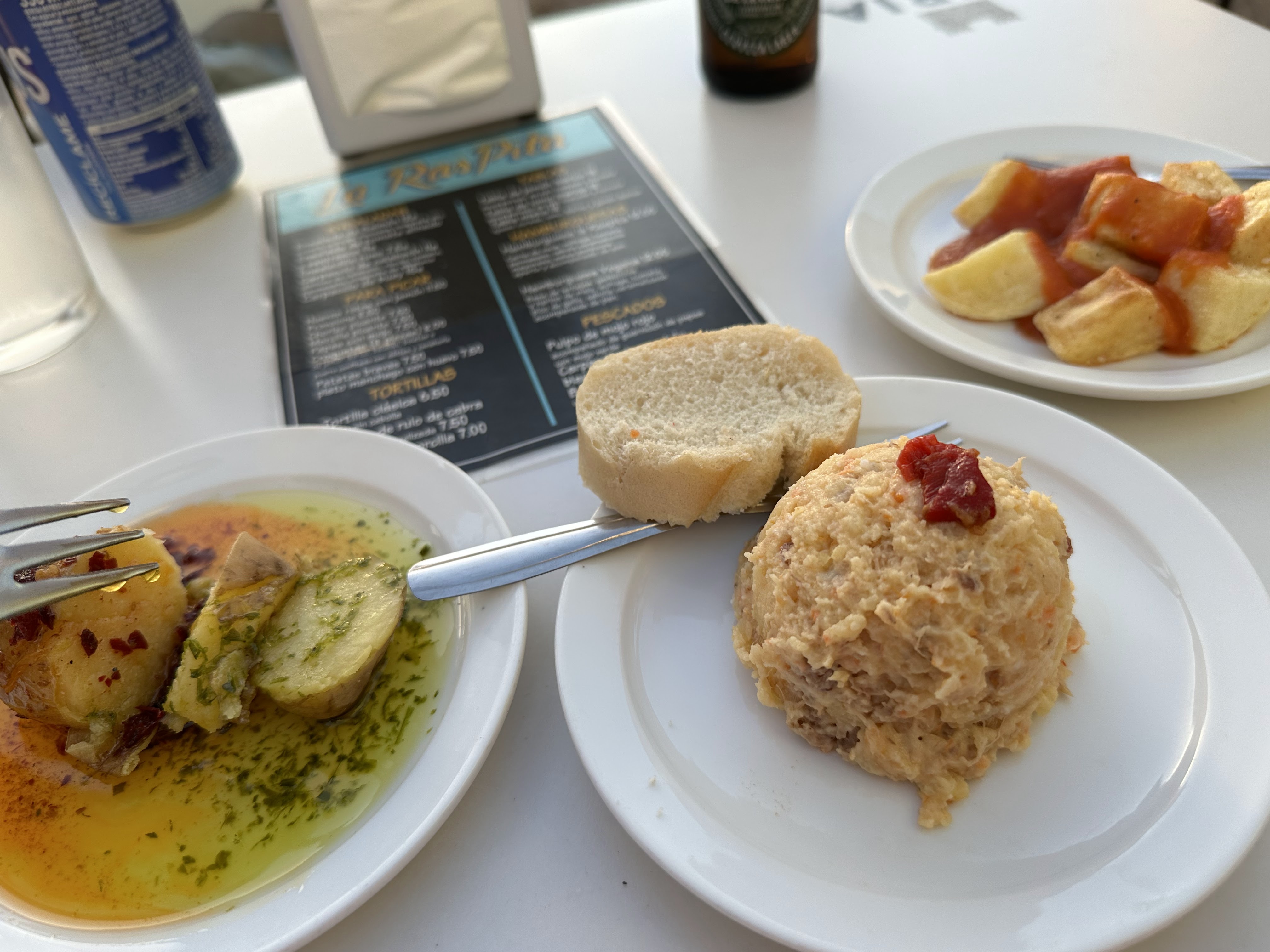 Con el quinto de E.Levante pedimos unas papas con mojo rojo y verde, una ensaladilla rusa, noguerones veganos, mini bravas, rosada en adobo y una tortilla clásica en su punto.