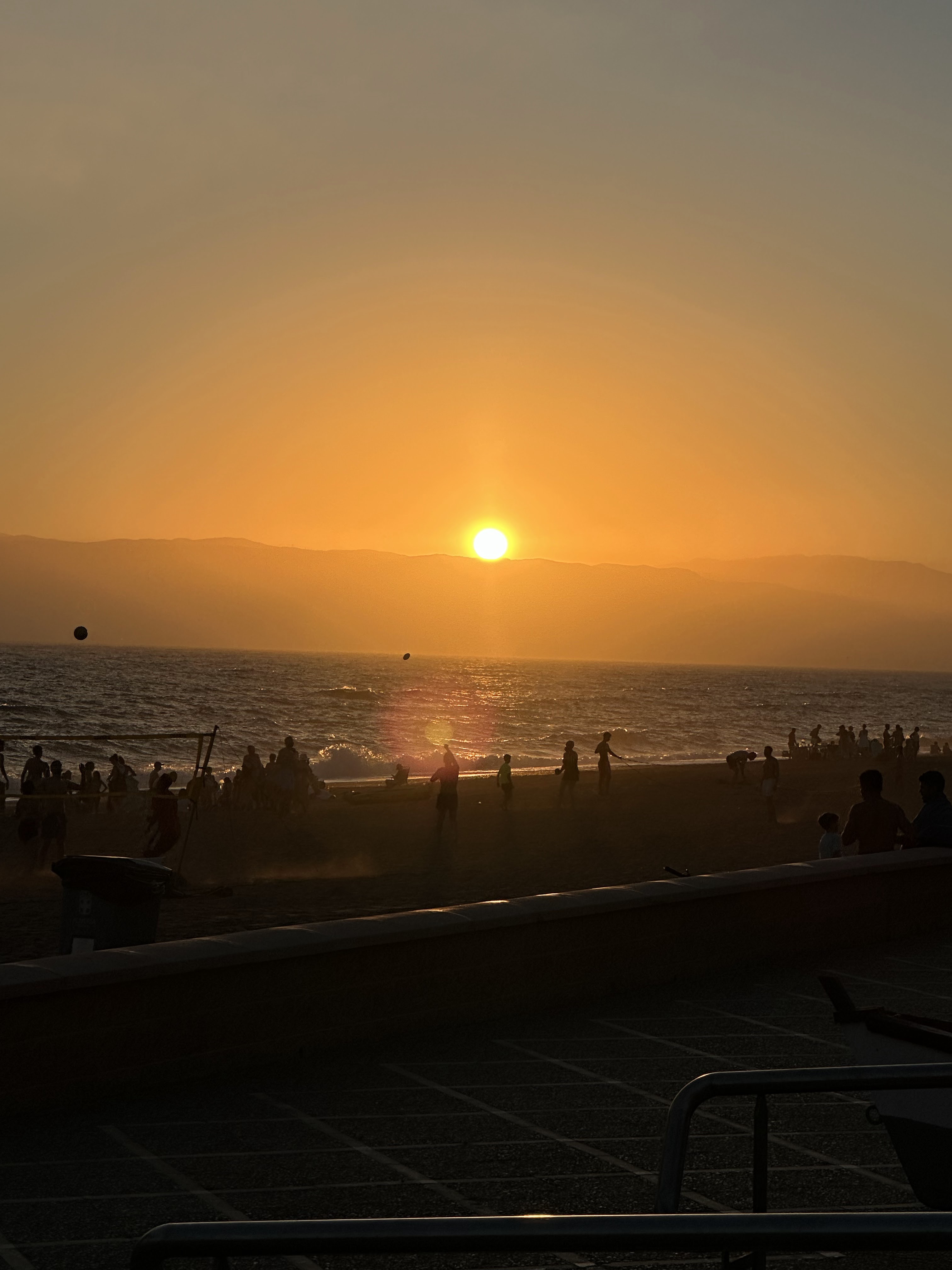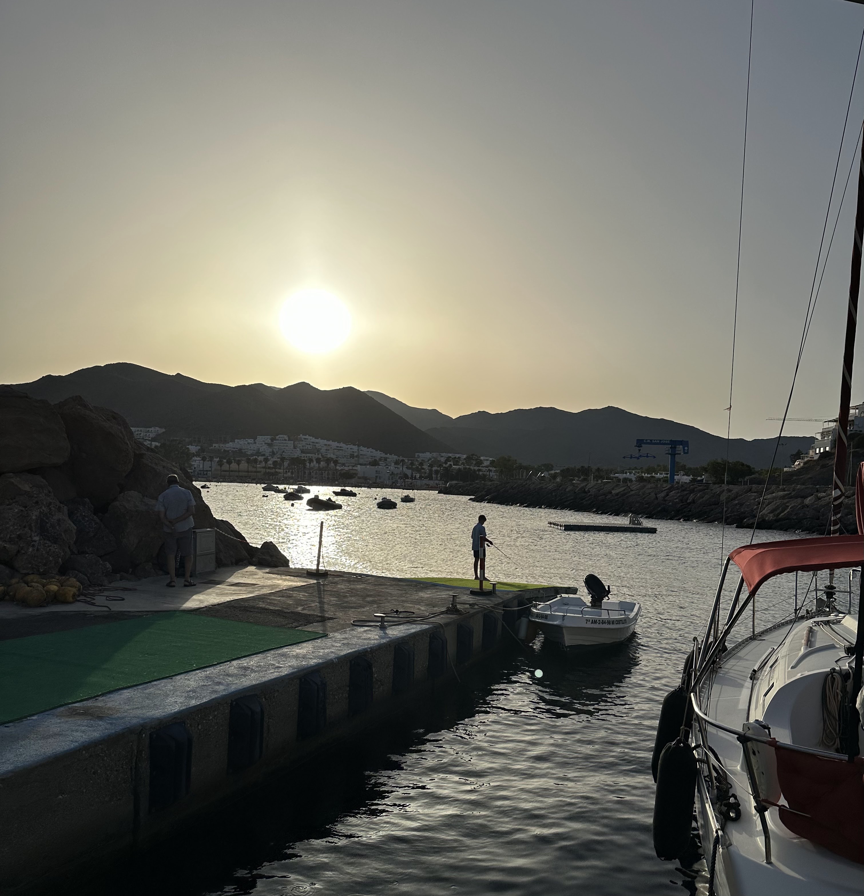 Acoplados en una mesa y con la puesta de sol en el «horizonte»; pongo comillas porque se metió nuevamente por la montaña y no por el mar. El siguiente enlace es de otra temporada que si se mete el sol por el horizonte/mar. Ver foto a continuación de la nuestra.