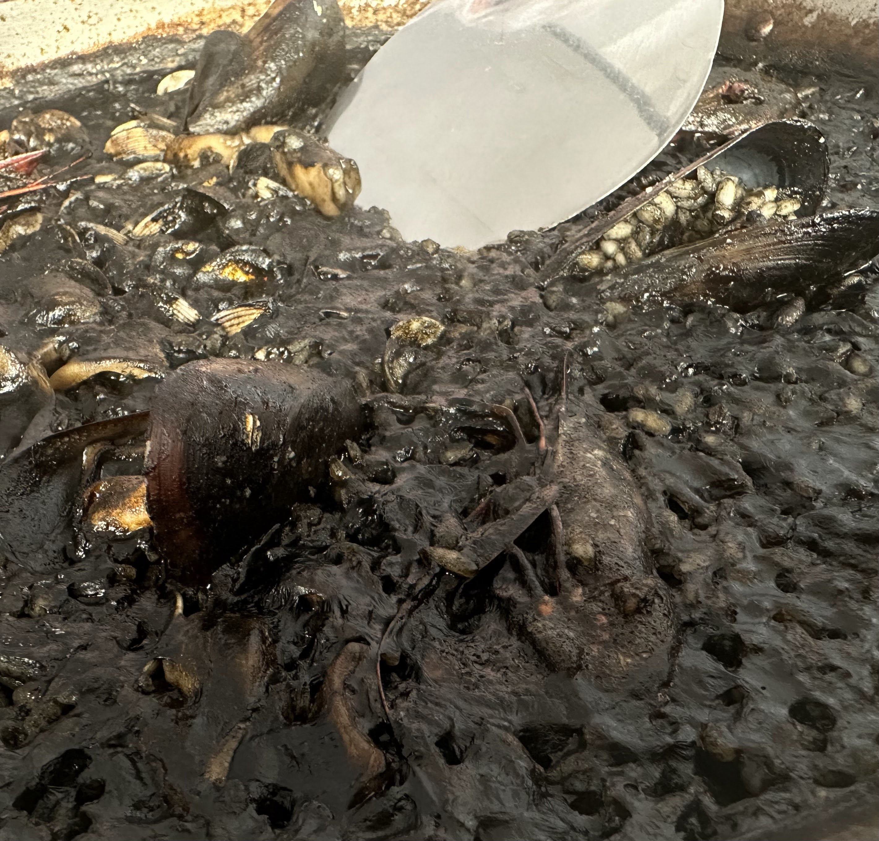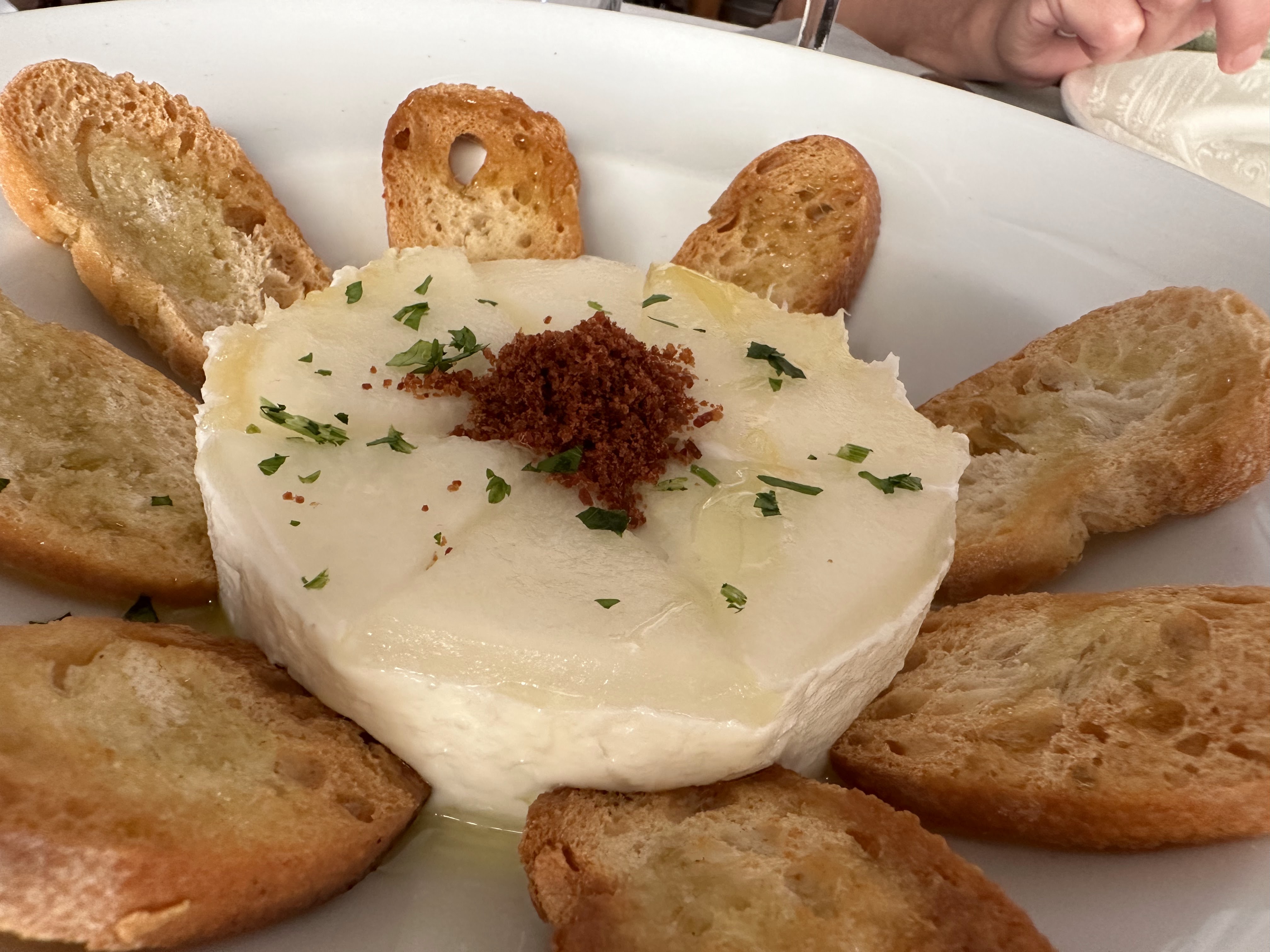 Almejas al vino tinto, ensalada de queso de cabra y un ajoblanco muy especial (veréis foto, parece un queso para extender). Como final un arroz negro para 2 pers. (20 eur p.p.) que estaba bueno pero bastante mejorable. *Postre : Tarta de queso al horno al centro.
