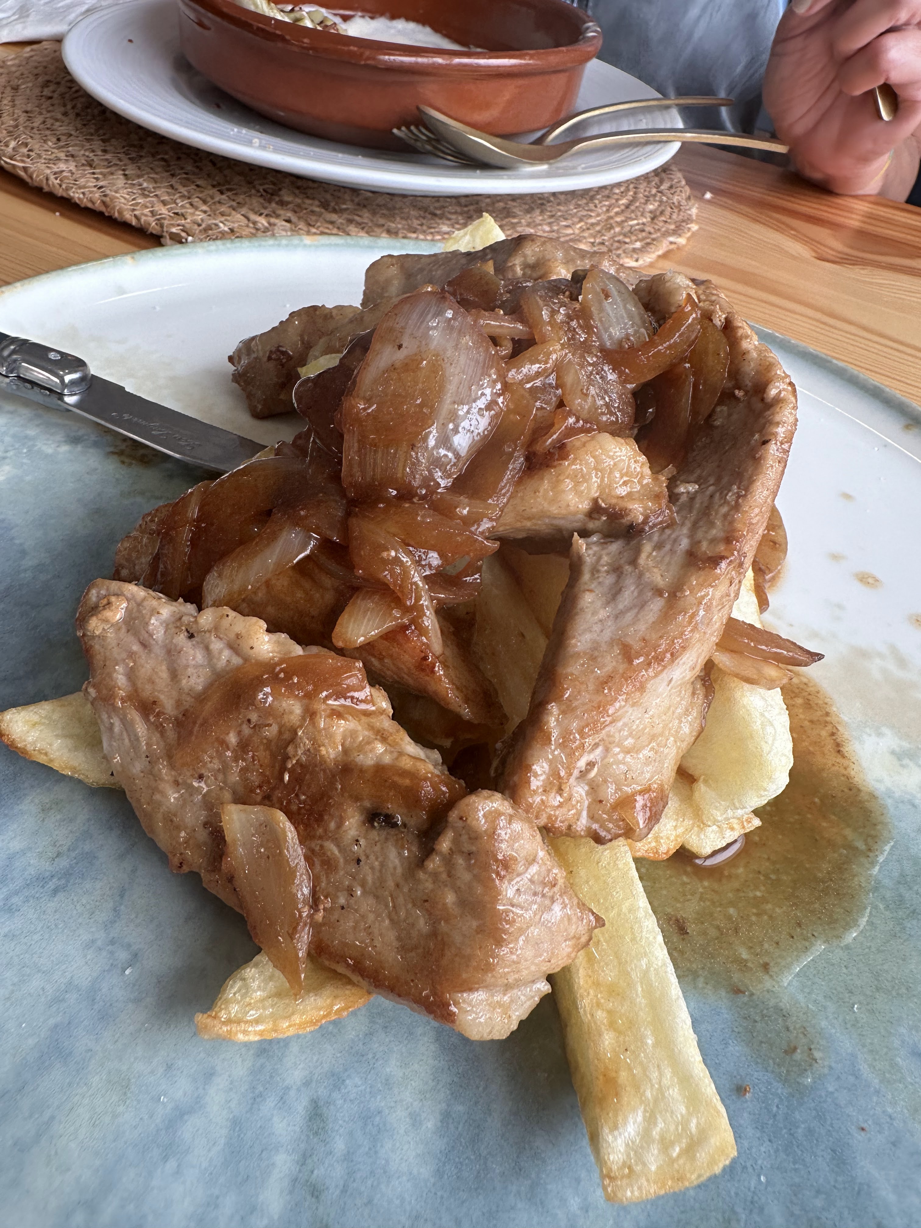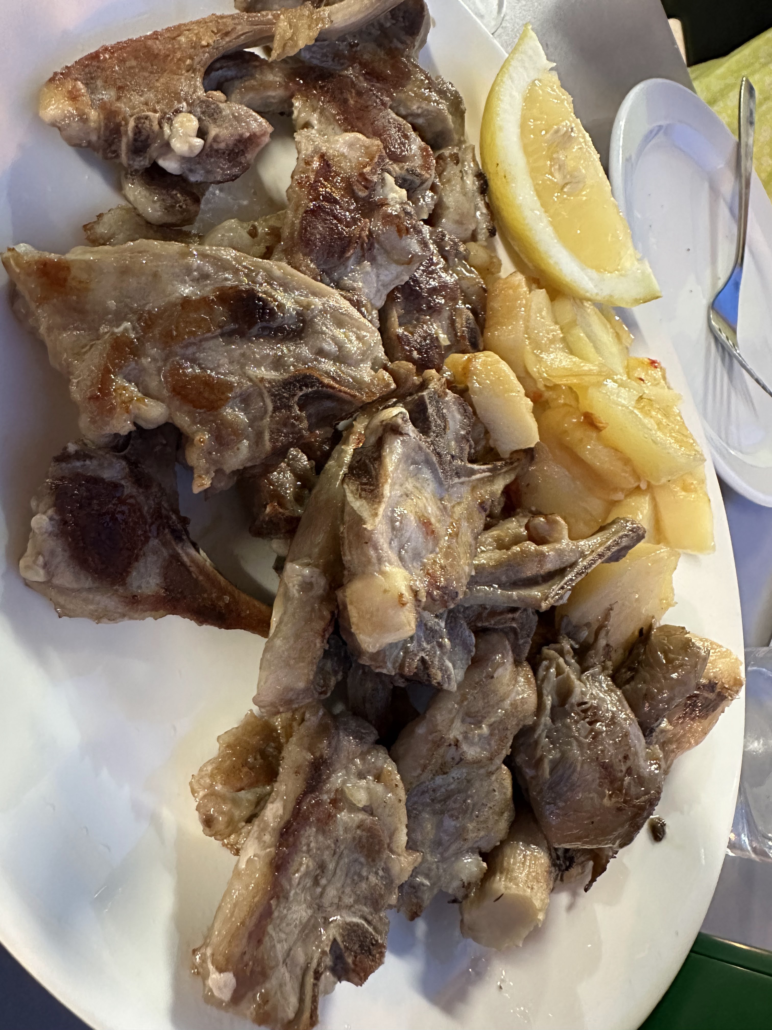 En su terraza cenamos de tapeo (cerveza+tapa = 3,50 eur) una de merluza frita, carne en salsa, mini-burguer y pincho moruno. También pedimos a parte de las tapas, unas croquetas y chuletas de cordero. Malas críticas en google pero a parte de su «peculiar» servicio, la comida estuvo bien.