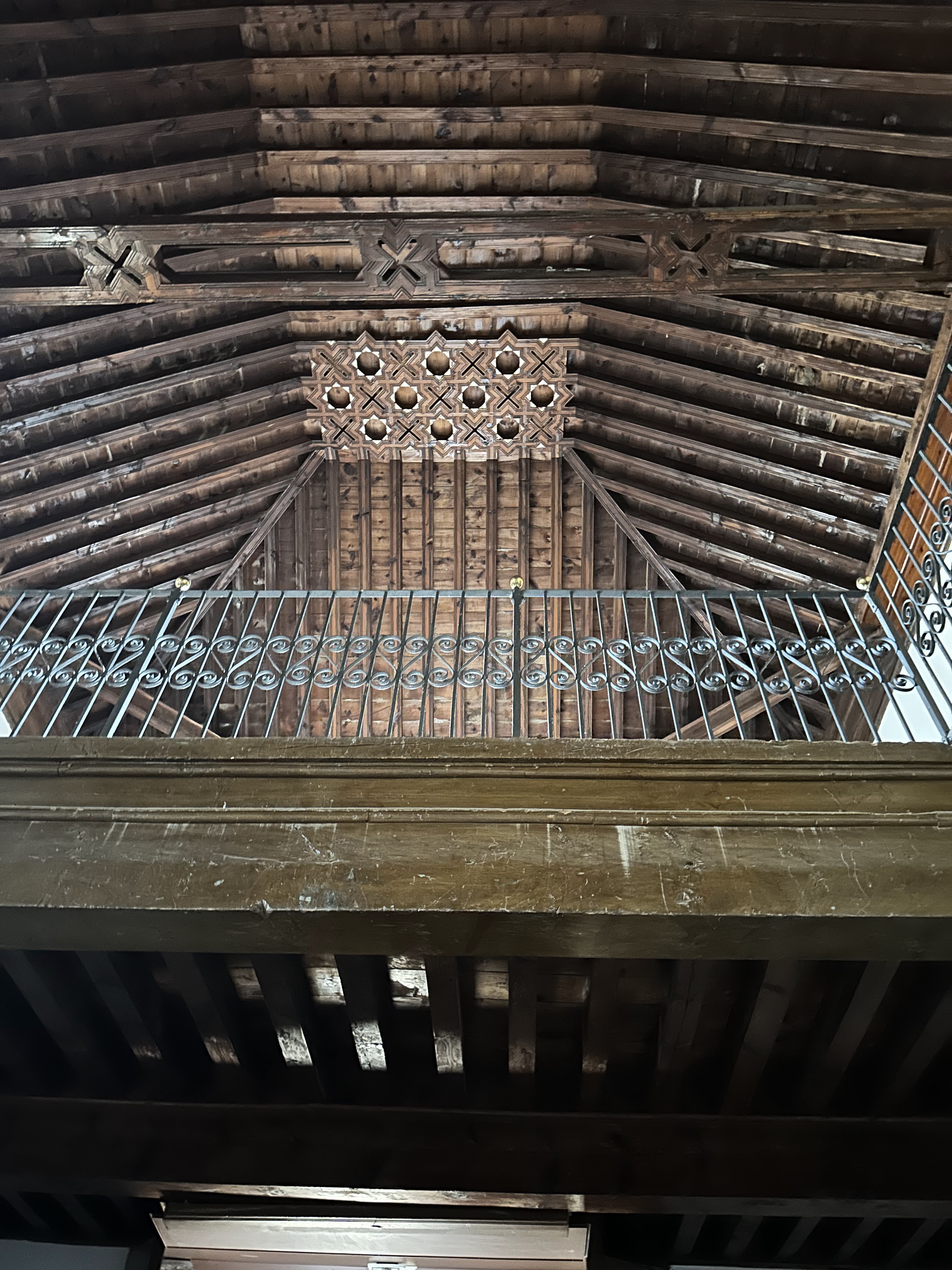 La nave central tiene un magnífico artesonado de madera con una armadura de lima-bordón, bellamente decorada con motivos de estrellas de ocho puntas y lazo de cuatro decorando el almizate y las parejas de tirantes, todo perfilado con labor de agramilado.