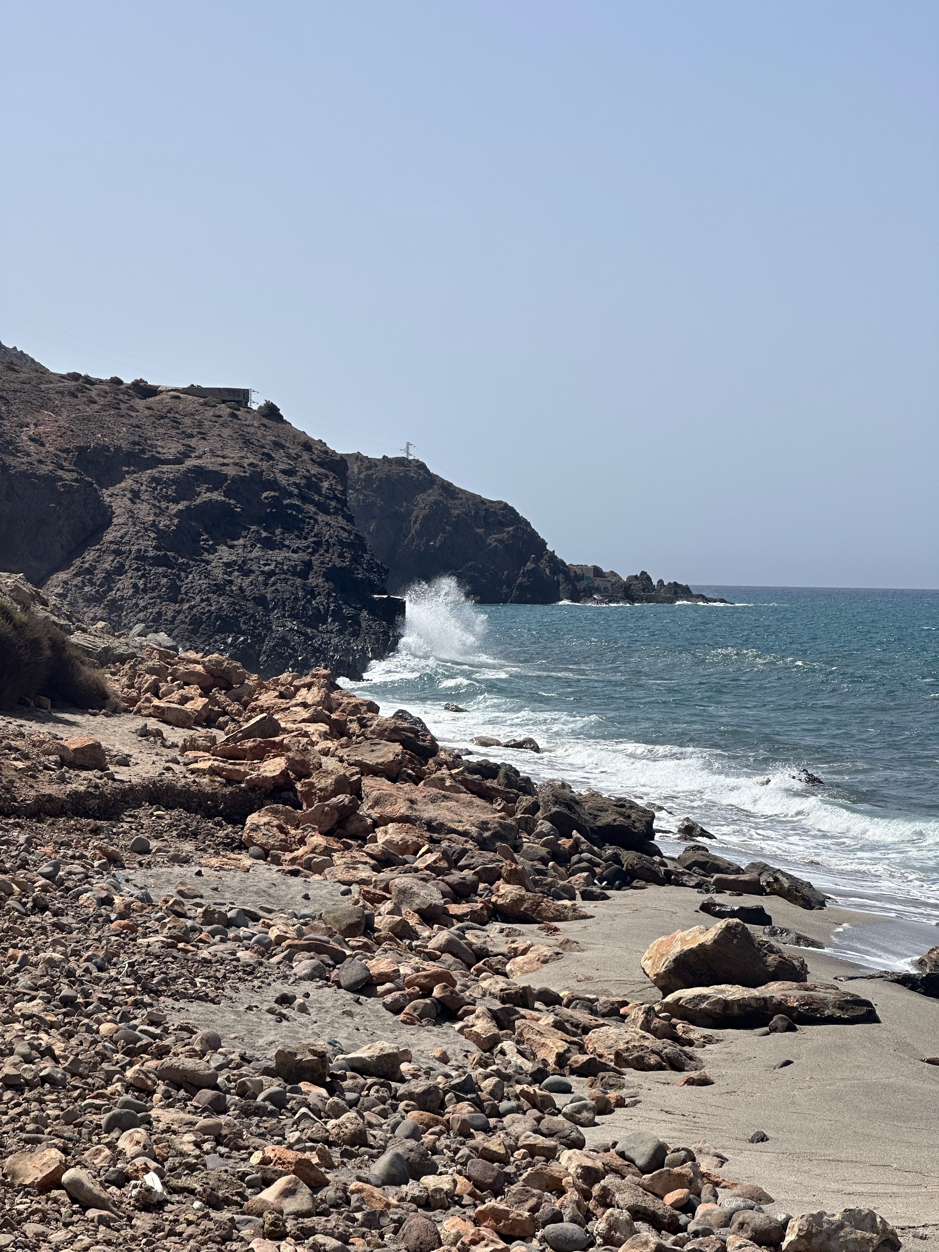 «La Playa de La Fabriquilla (es la última playa a la que fuimos), es la de la explanada de las Salinas previa al ascenso al Faro de Cabo de Gata y que muere apoyada en acantilados volcánicos.