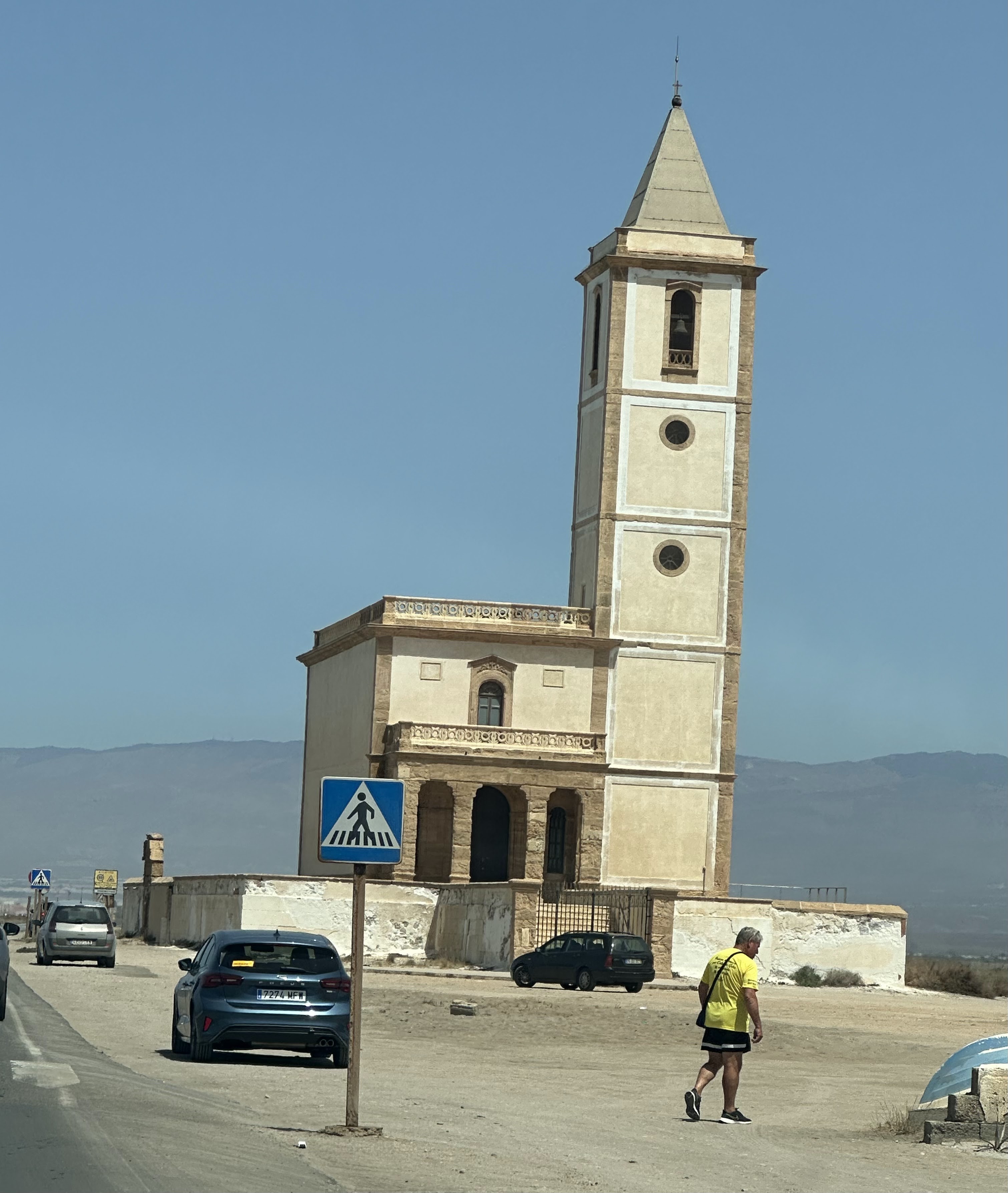 «Una de las imágenes más características de las salinas de Cabo de Gata es la de su iglesia (ya la conocemos de otro viaje, pero tiré foto sin bajarnos. Situada entre las barriadas de La Almadraba de Monteleva y de Cabo de Gata, en la ciudad de Almería.