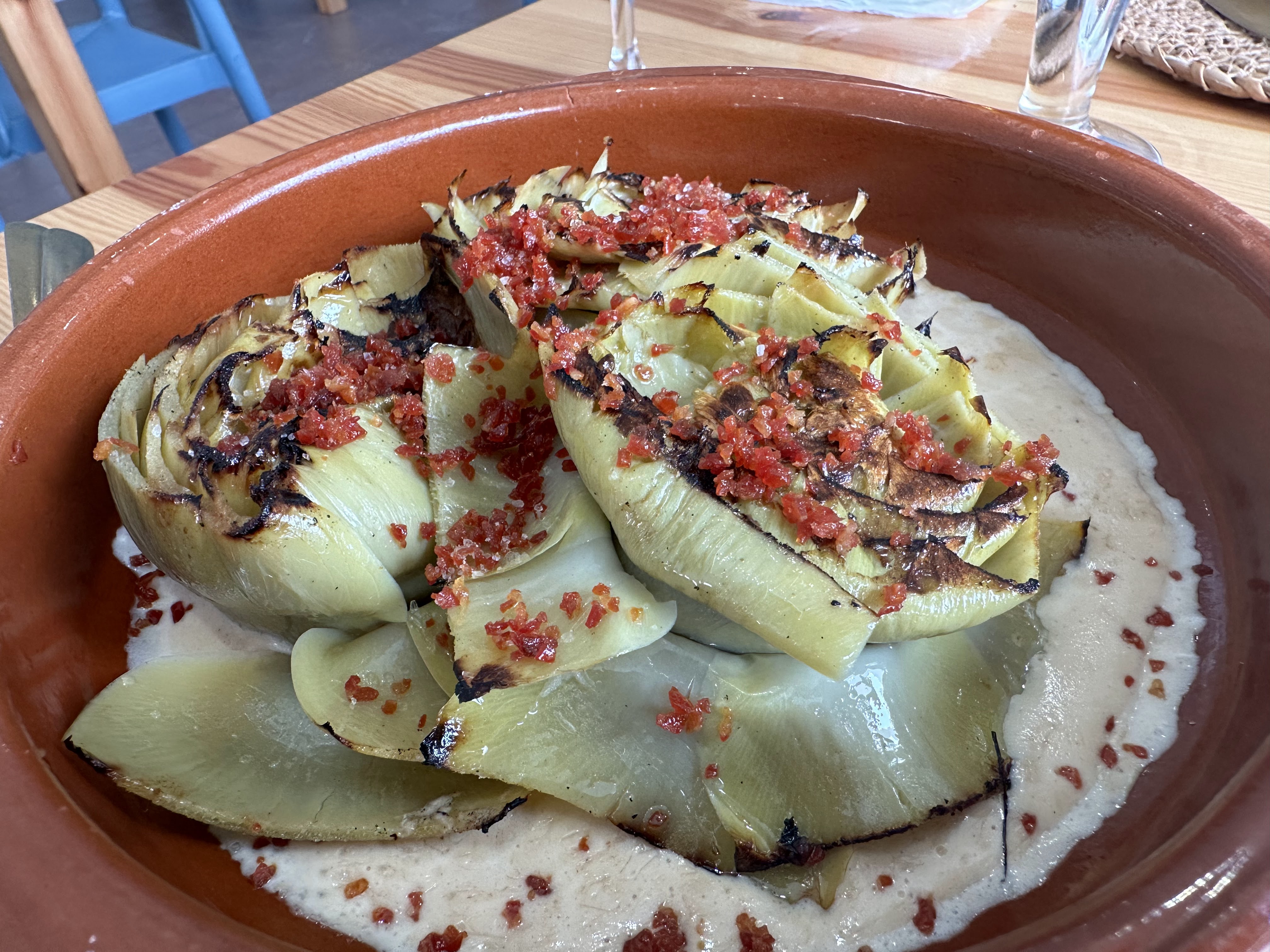 Nosotros pedimos unas tellinas, unos buñuelos bacalao diferentes, una flor de alcachofa con jamón y unos bastones de presa ibérica salteados con cebolleta y vino.