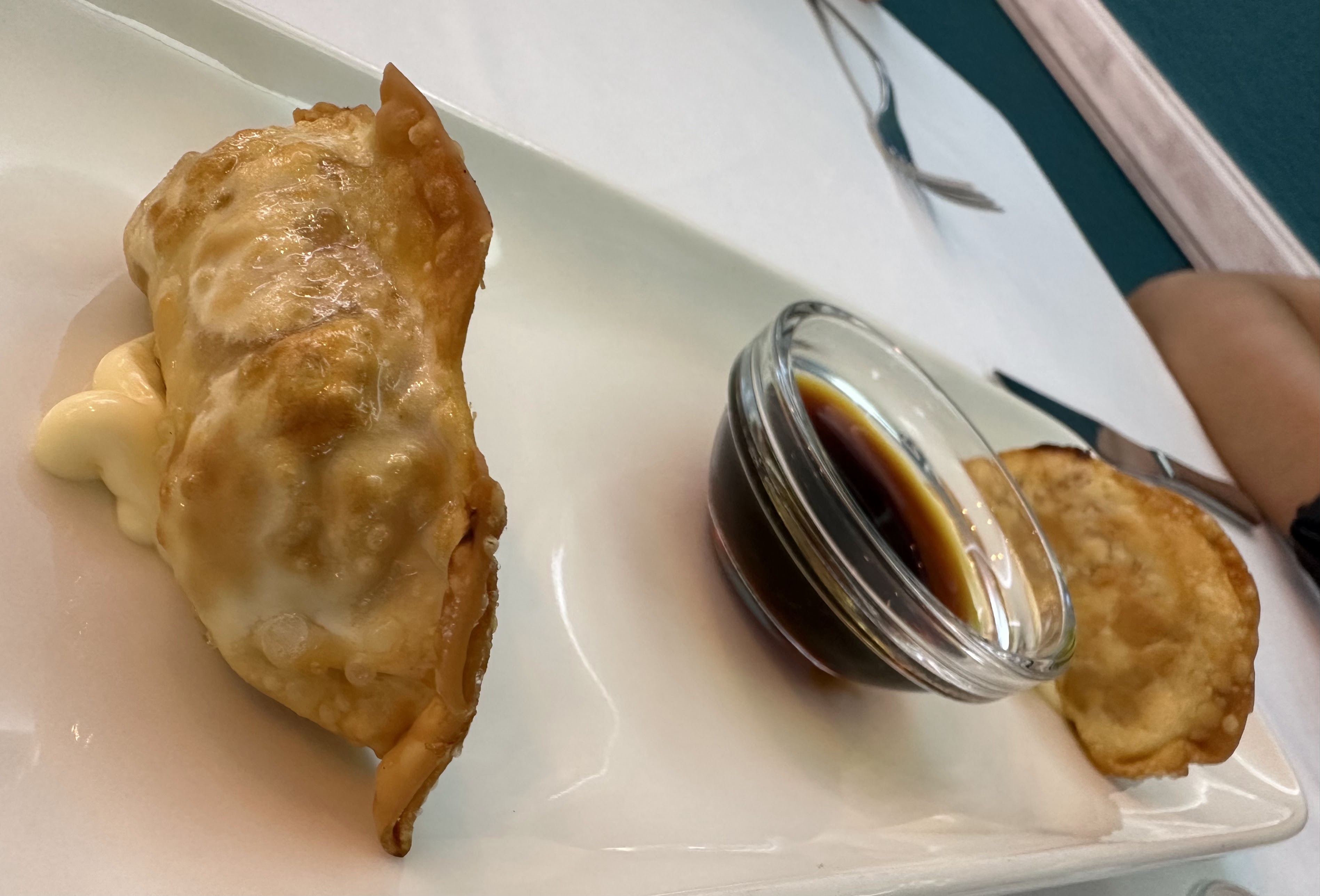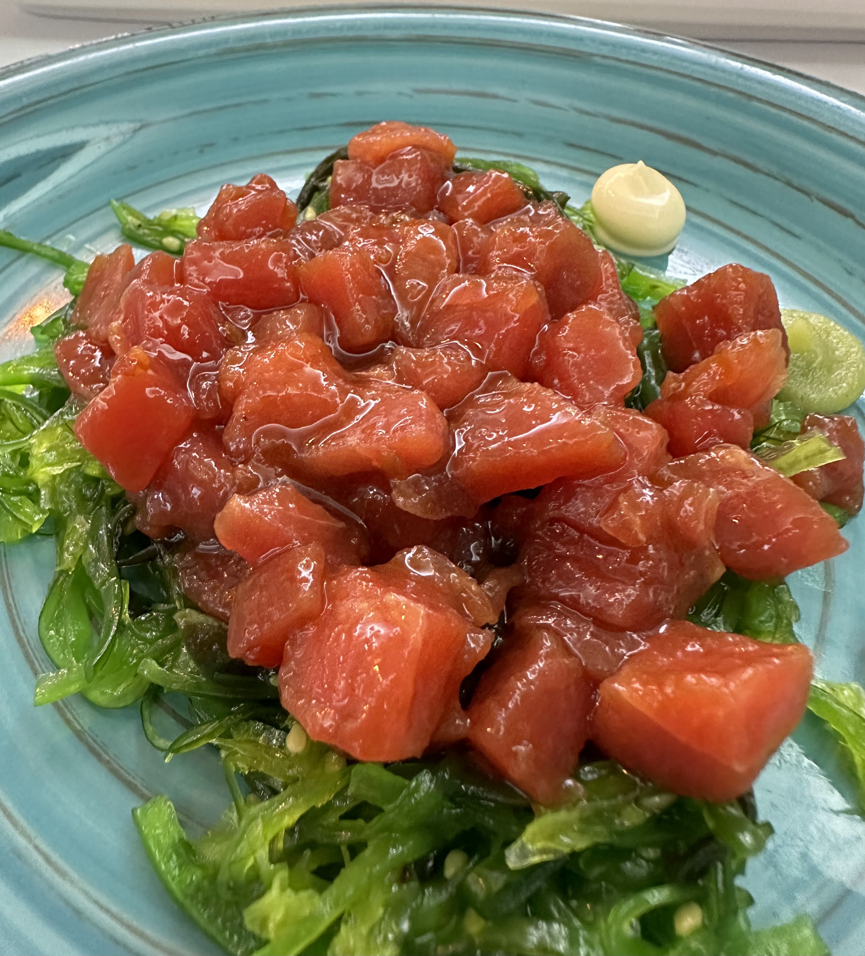 Atún marinado con salsa wakame; gyozas de presa ibérica y naranja; mini-burguer de buey y huevo de codorniz; brocheta de gambas y jibia con tomate; gambas de cristal; tomate marinado; crujiente de pollo; canelón de brandada y piquillo y una pequeña tabla de quesos para terminar. Todo a nivel pincho.