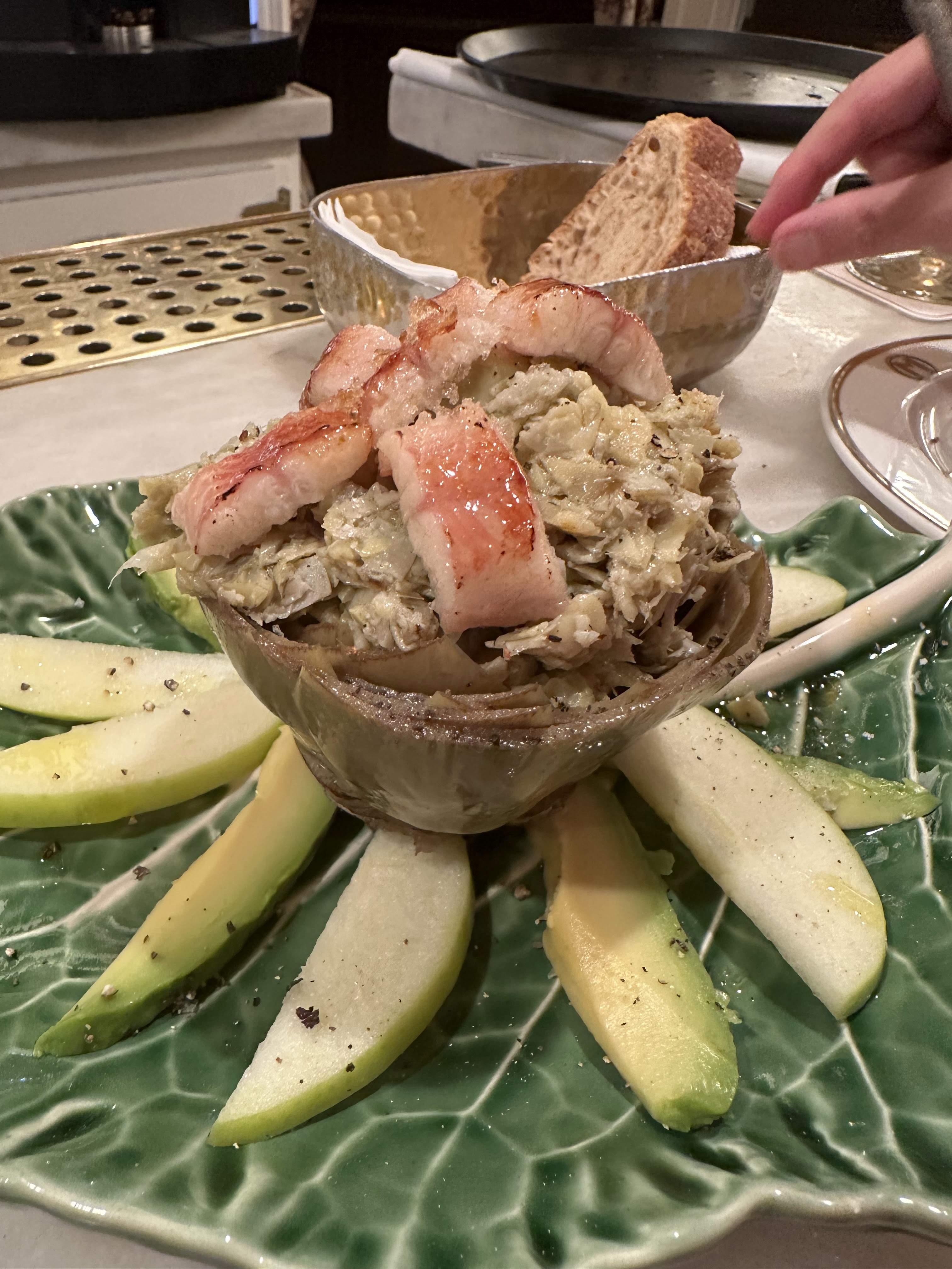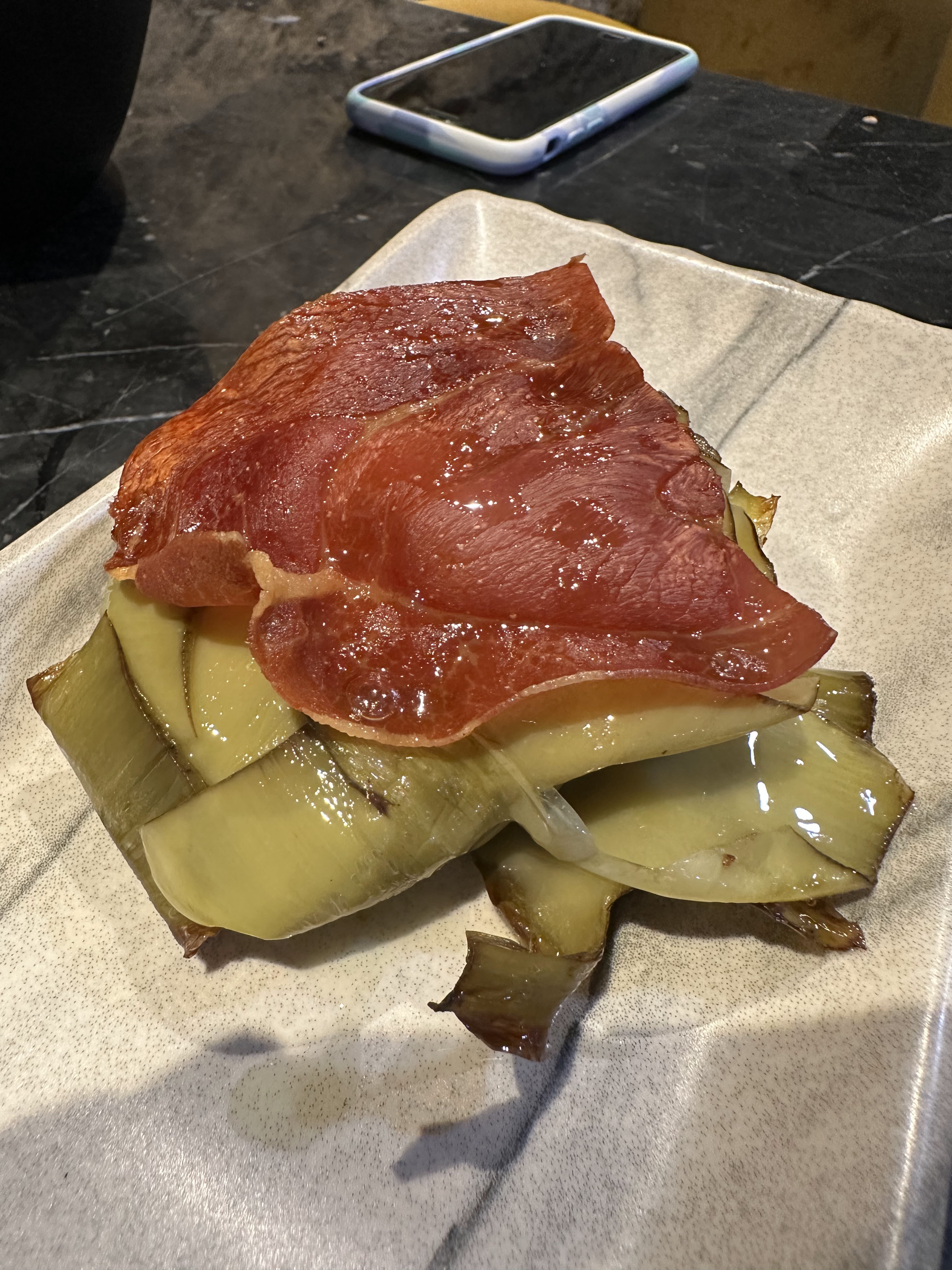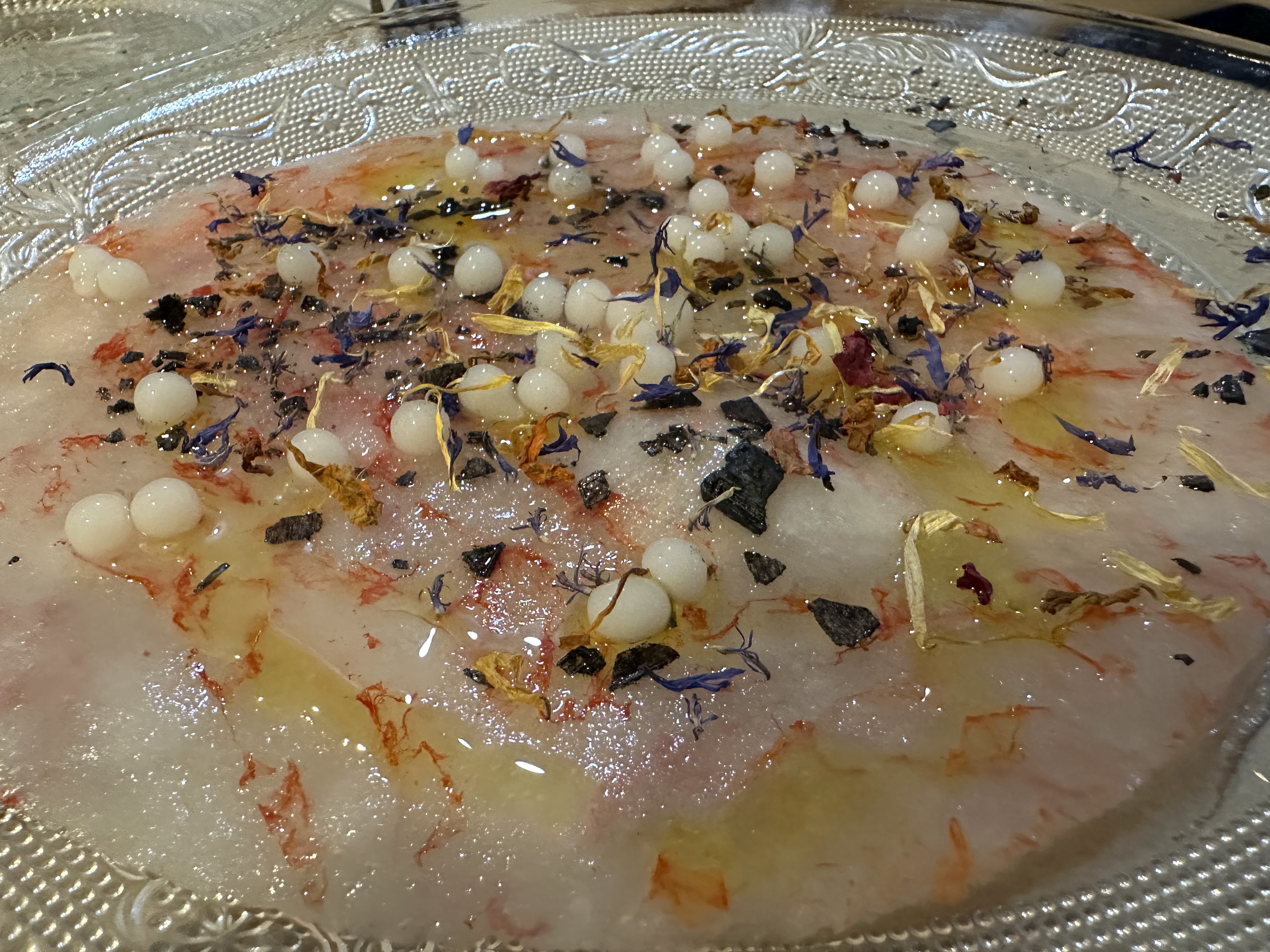 Una espléndida y en su punto, mini tortilla de patatas con cebolla (12 eur; no tengo foto solo un video que por su capacidad no puedo subir); un buen y diferente tartar de alcachofas (16 eur); unas buenas gambas al ajillo al estilo Manero (con huevo frito encima y suavecicas/18eur) y un exquisito vitello tonnato (14 eur) que se hizo de «rogar» pero que mereció la pena.