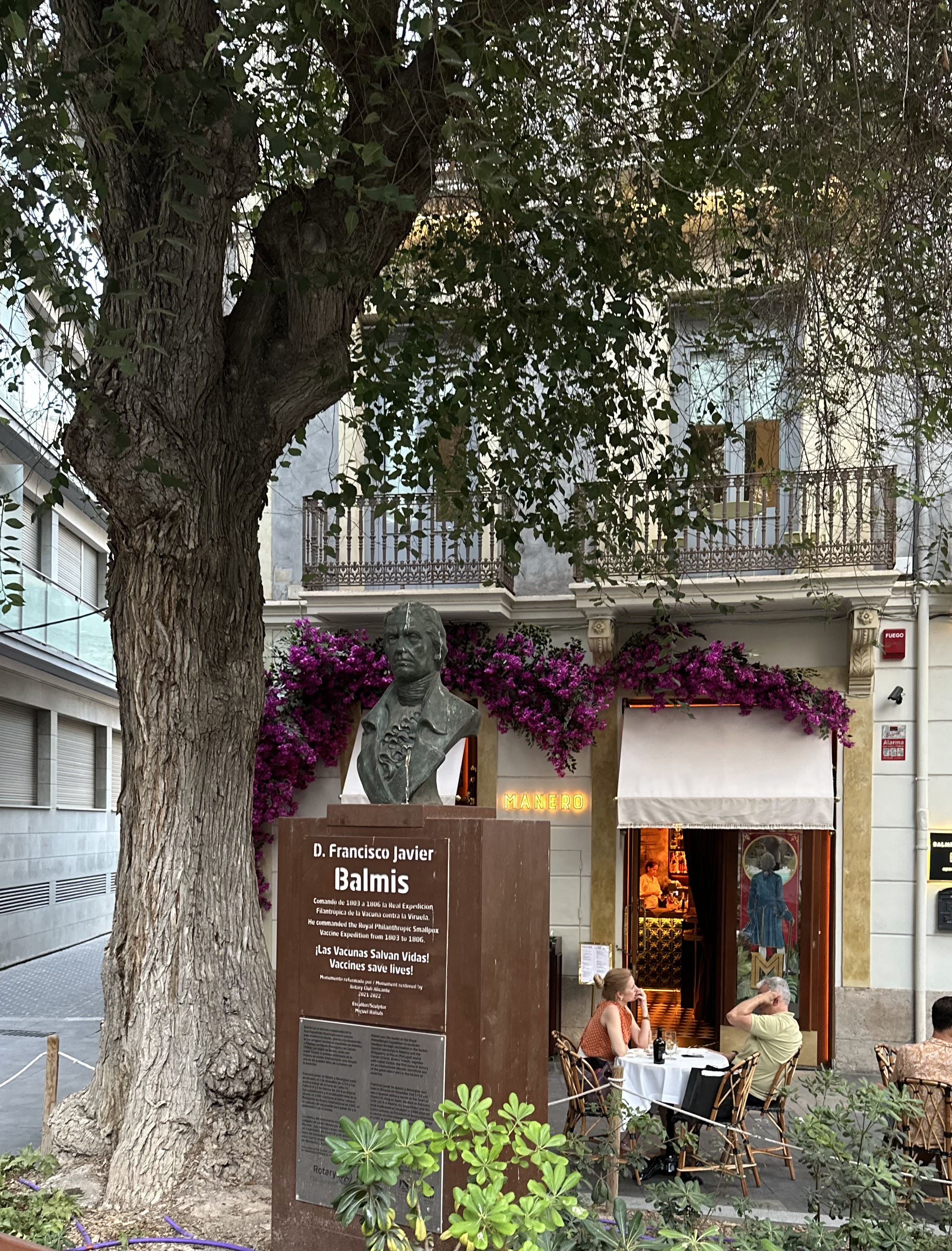 «El busto del médico alicantino que realizó en 1803 la gesta de llevar la vacuna contra la viruela a las colonias españolas inoculada en niños.El escultor alicantino Miguel Bañuls es el autor de esta obra que viene a sustituir a la que estaba anteriormente y que sufría un gran deterioro. La nueva pieza, en cuyo pedestal aparece descrita su hazaña, ha sido financiada por el Rotary Club Alicante, dentro de su campaña para recuperar la memoria del doctor Balmis.En la placa conmemorativa se ha escrito el lema «Las vacunas salvan vidas».