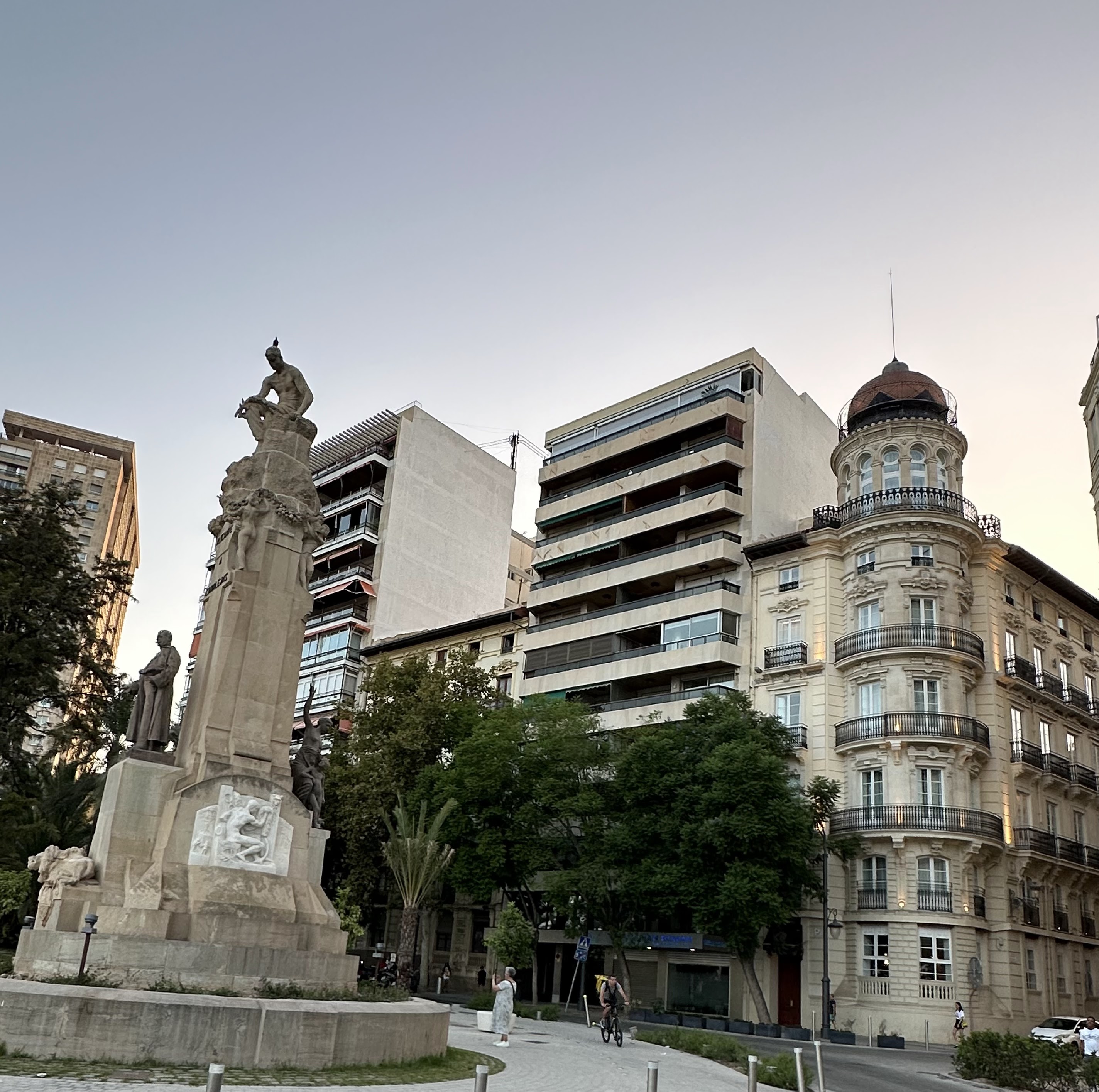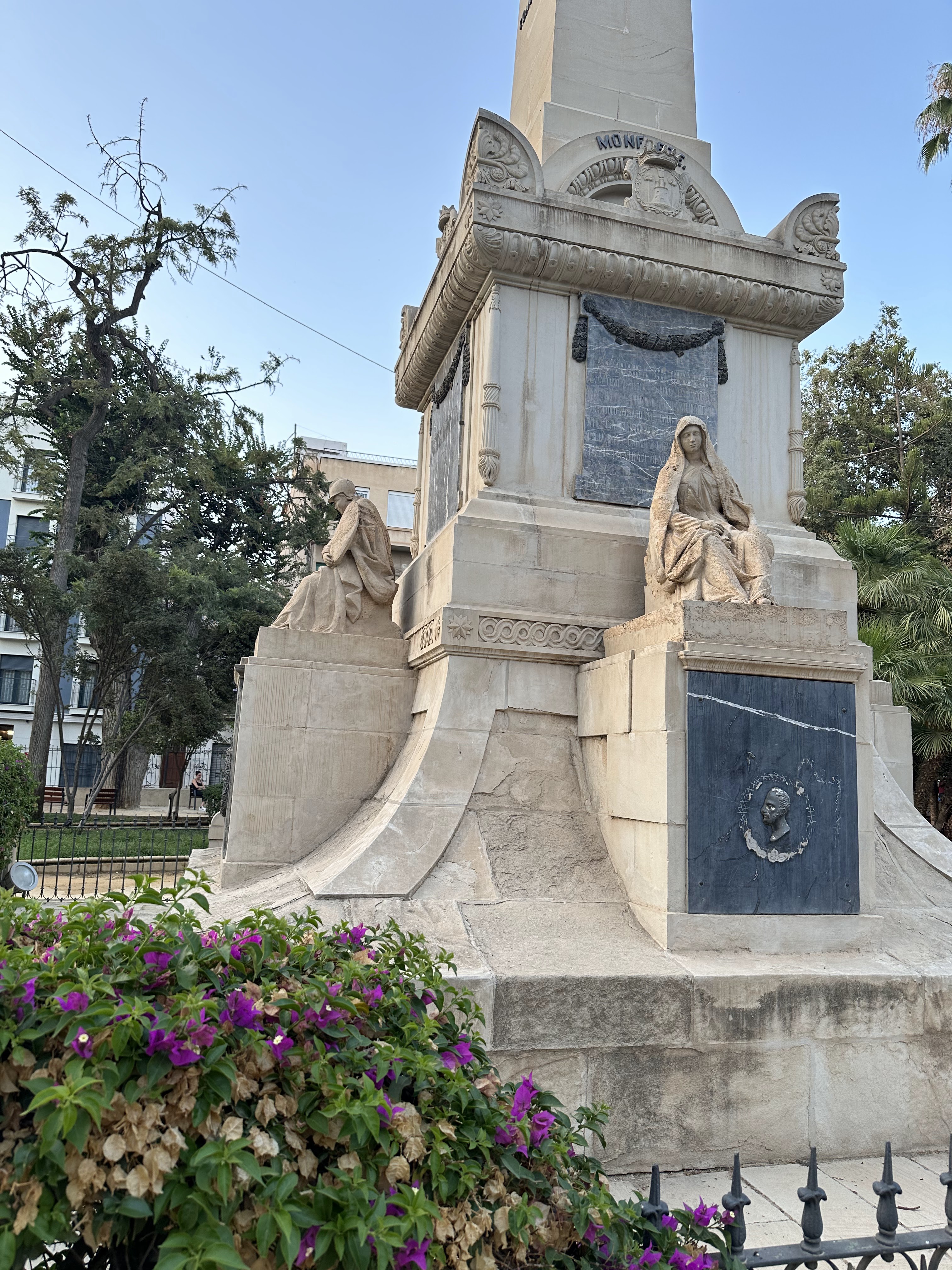 Son muchos los paseo que nos hemos dado por esta bonita ciudad, y ahora seguíamos hacia la zona baja junto al mar; fotico en la Plaza Canalejas también al «monumento a Canalejas» :»Complejo conjunto escultórico que se resuelve arquitectónicamente con un pedestal y pilar central cuadrangular que en forma de aguja se corona con una escultura exenta, mientras que los cuadro lados del prisma se ocupan con dos esculturas de bulto redondo y dos bajorrelieves. El monumento se dedica a José de Canalejas que aparece representado en la figura principal del personaje en bronce a cuyos pies descansa un león yacente sobre un Escudo, circular, de cuatro cuarteles con los emblemas de León, Castilla, Aragón y Navarra y en el centro las flores de lis. En su parte contraria se complementa el conjunto con el grupo escultórico de bulto redondo «Gratitud» también en bronce. Sendos bajorrelieves se sitúan en los lados restantes, uno de ellos se titula «Saneamiento» donde se representa a una mujer y dos niños simbolizando las mejoras de la ciudad. El otro relieve se titula «Comercio» y en él aparecen signos alegóricos de dicha actividad mercantil así como una descripción de las obras realizadas para la mejora del puerto alicantino. Remata toda la composición en lo alto de la aguja un hombre encorvado, la figura de un obrero sentado sobre una cabeza antropomórfica que está sostenida en los cuatro ángulos por sendas figuras humanas femeninas con guirnaldas.»