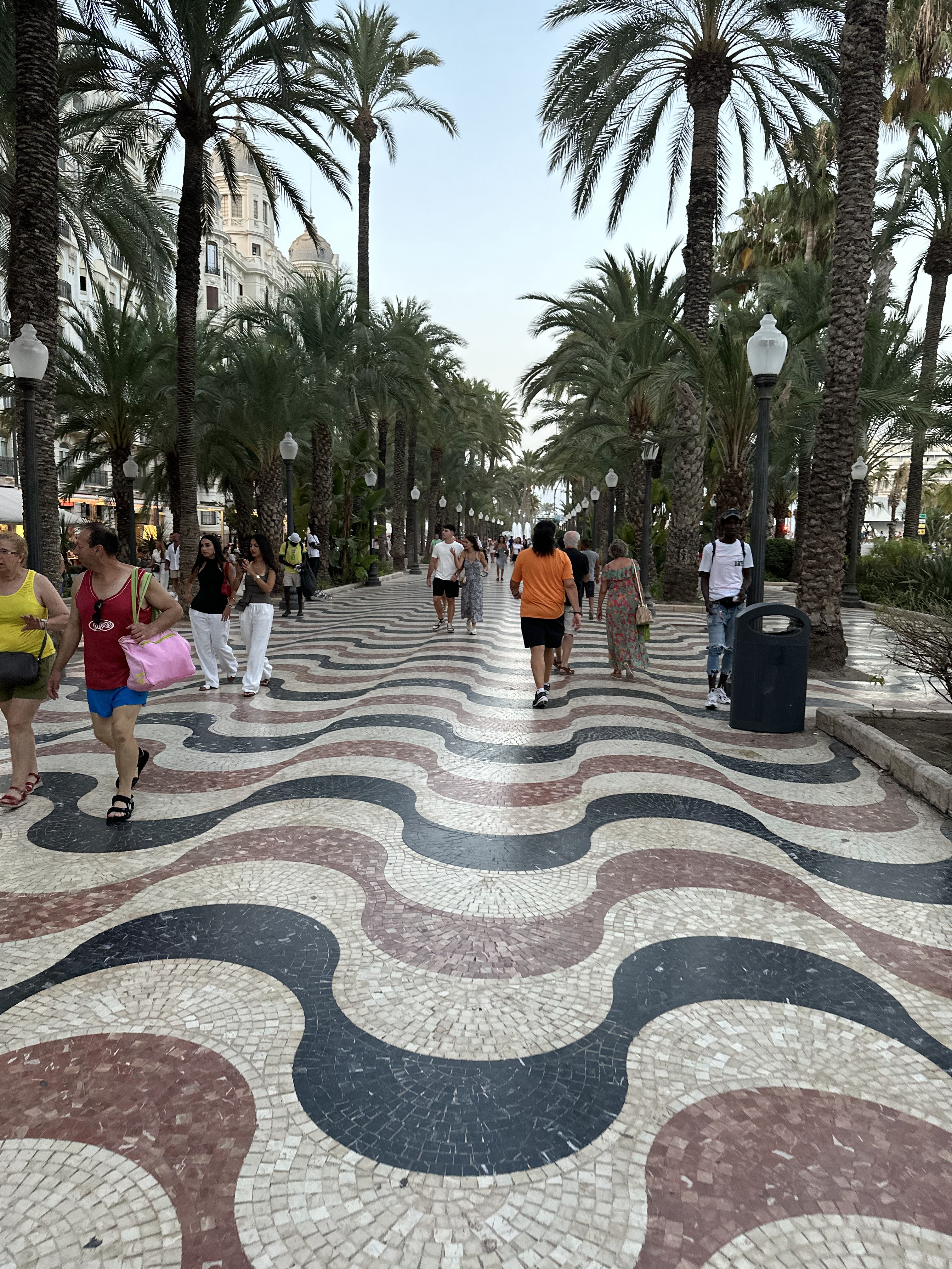 «La Explanada de España es uno de los emblemas de la ciudad de Alicante y transcurre en paralelo a uno de los muelles del puerto. Está bordeada a cada lado por filas de palmeras y el suelo está decorado con 6.600.000 teselas de mármol tricolor que forman un mosaico con un característico diseño que imita las olas del mar.