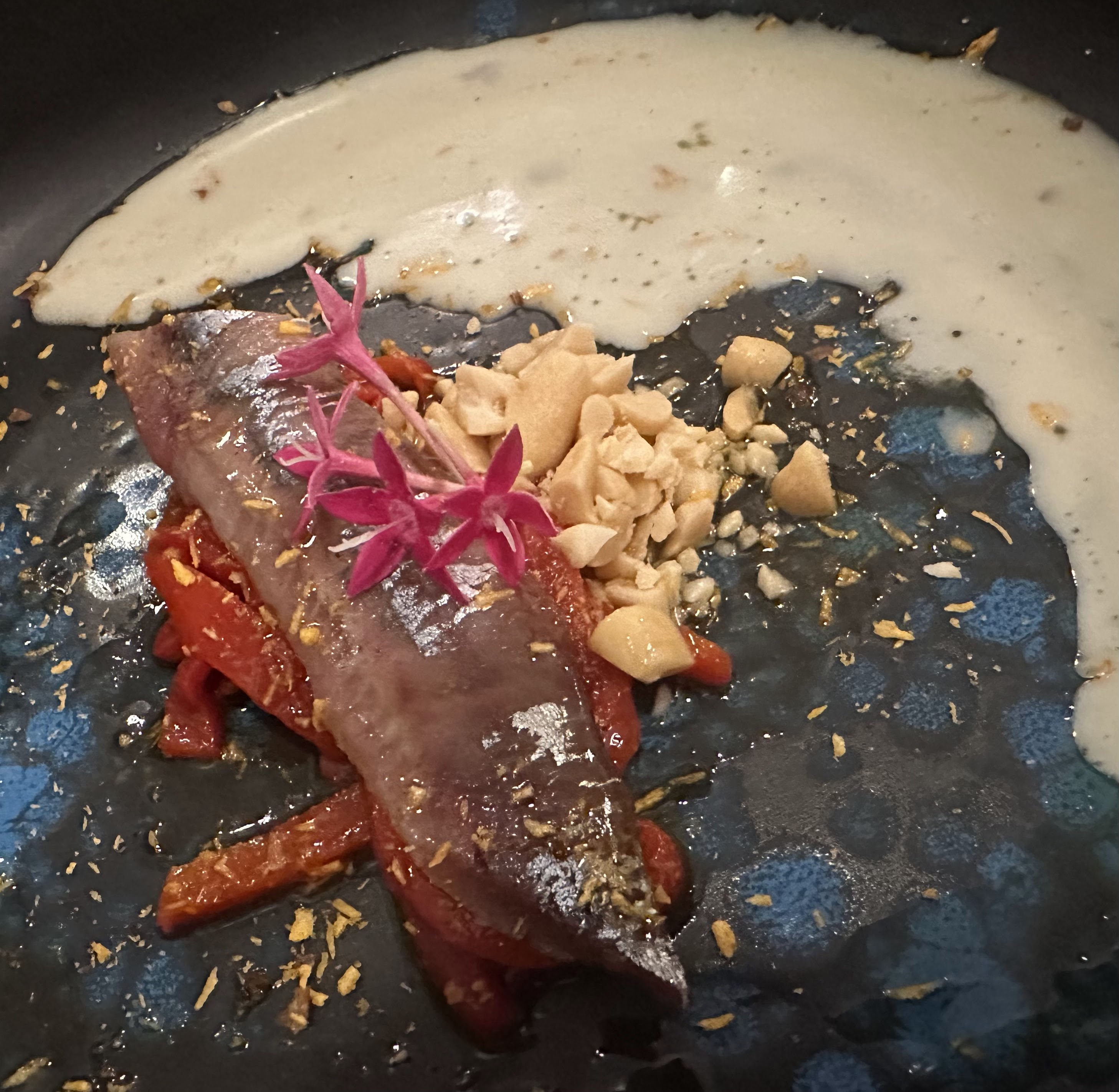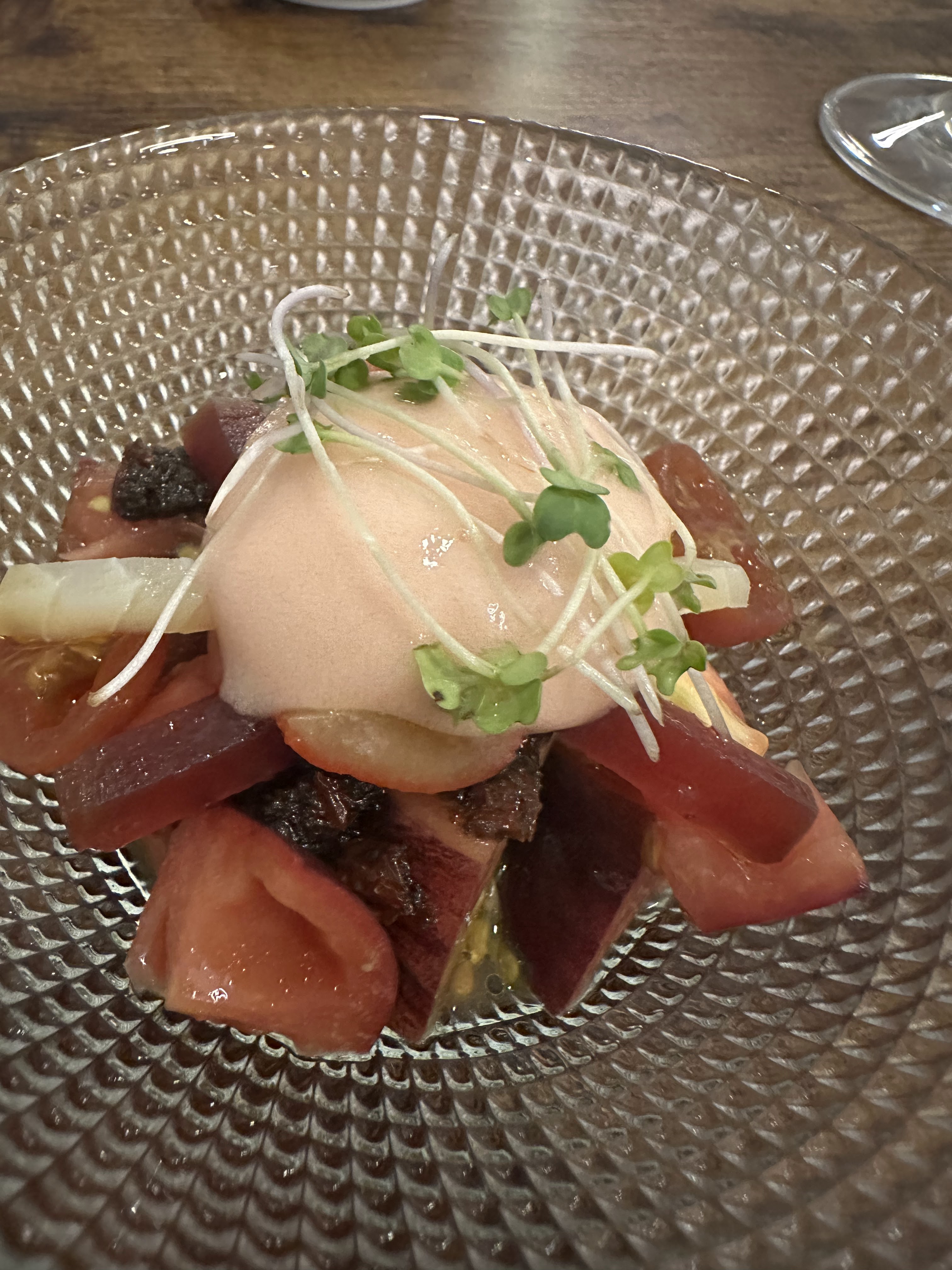 (Estuvimos el pasado 31 julio y tomamos el menú Turmalina, el de 47 eur p.p. y estuvo genial. Combinación de texturas y sabores que consiguen superarse plato tras plato. Servicio y atención a la altura. Buen consejo del vino rosado Ou Yea que maridó perfectamente con toda la comida. Recomendable 100%»)