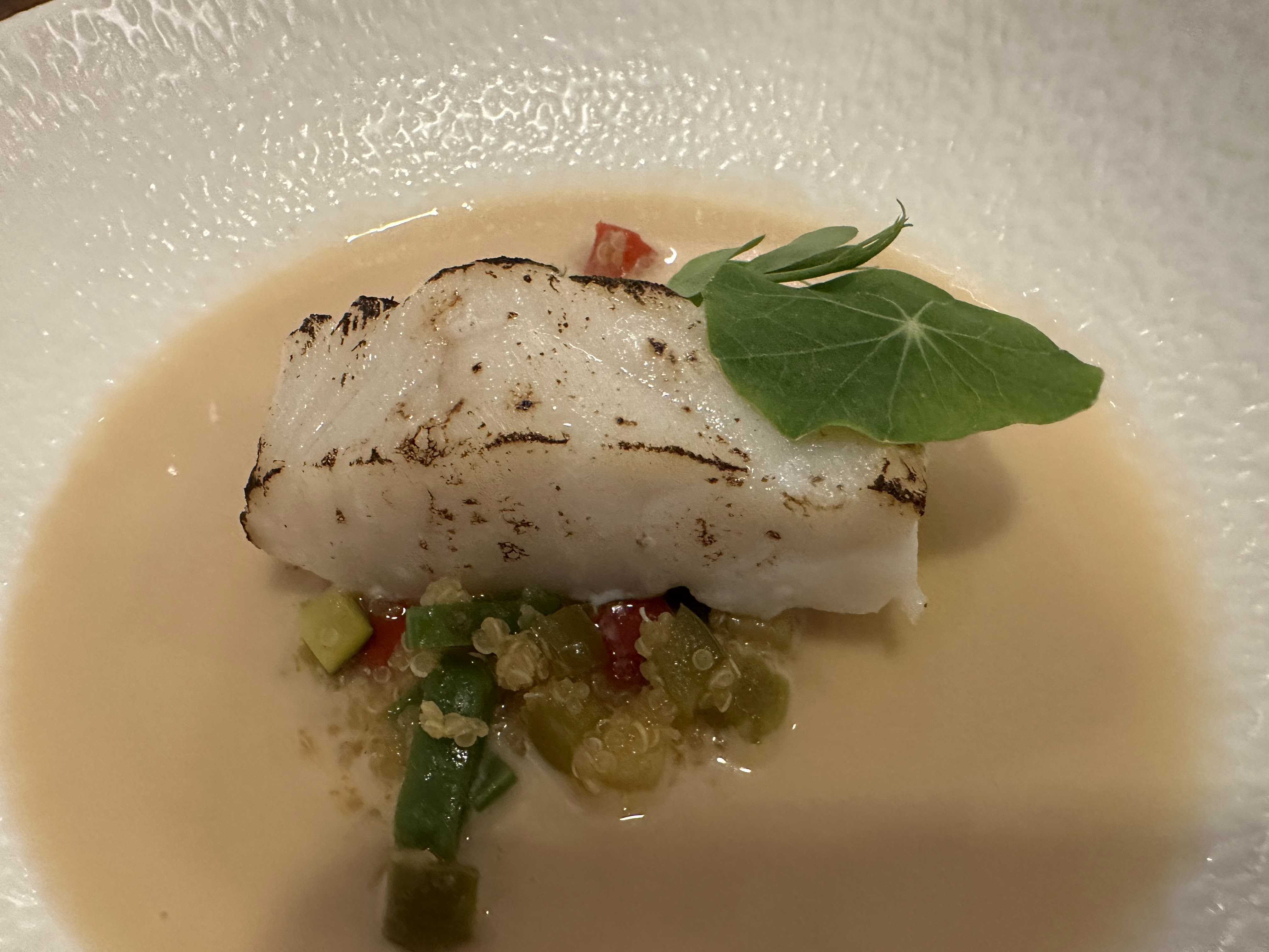 Los platos principales fueron, lomo de bacalao (con quinoa con verduritas y piña colada) y magret de pato (con patata en texturas y cebolla glaseada)