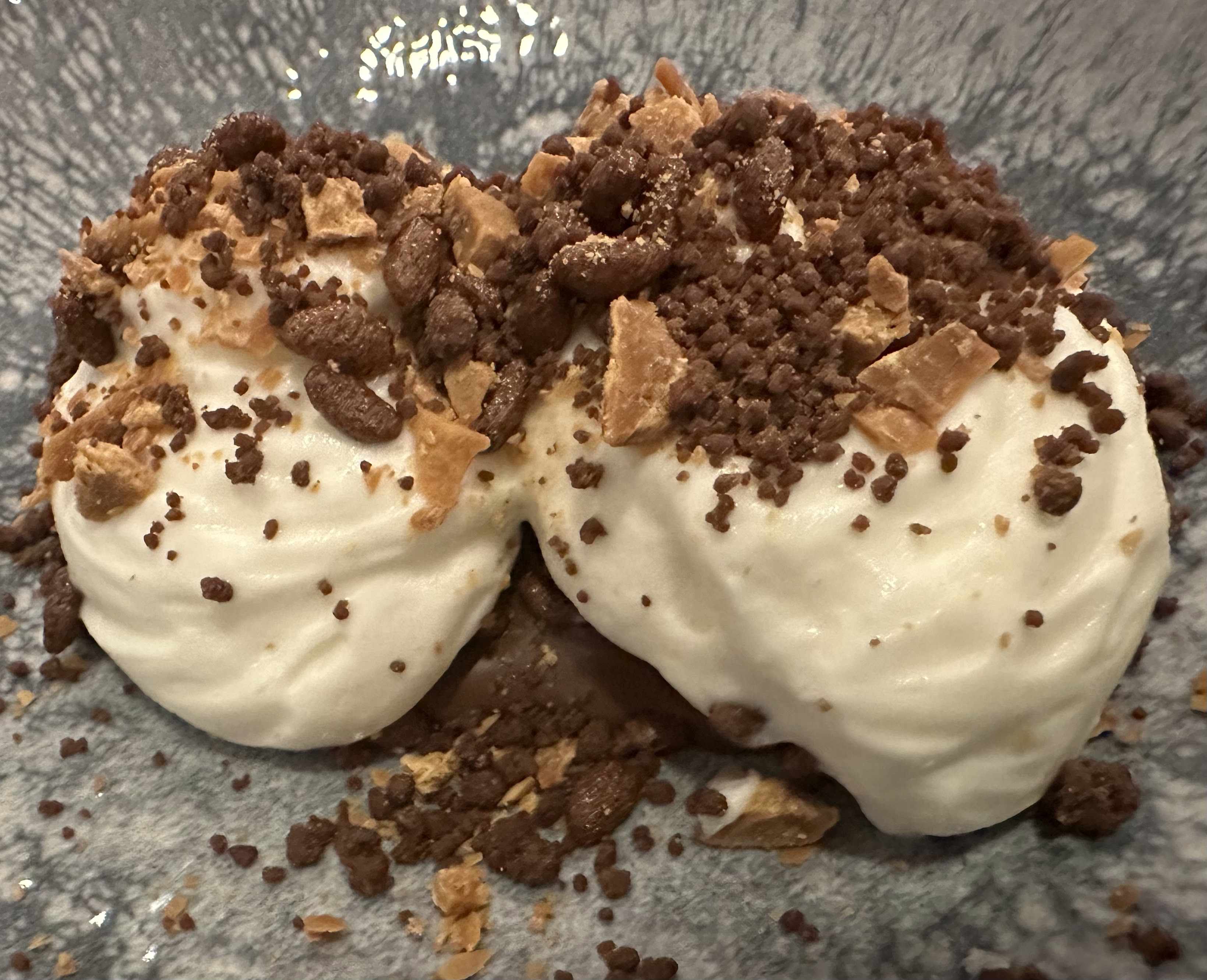 Postres : Mentireta (cítricos, café licor, granizado) y Choco-latte (ganache 70%, espuma choco blanco, texturas)