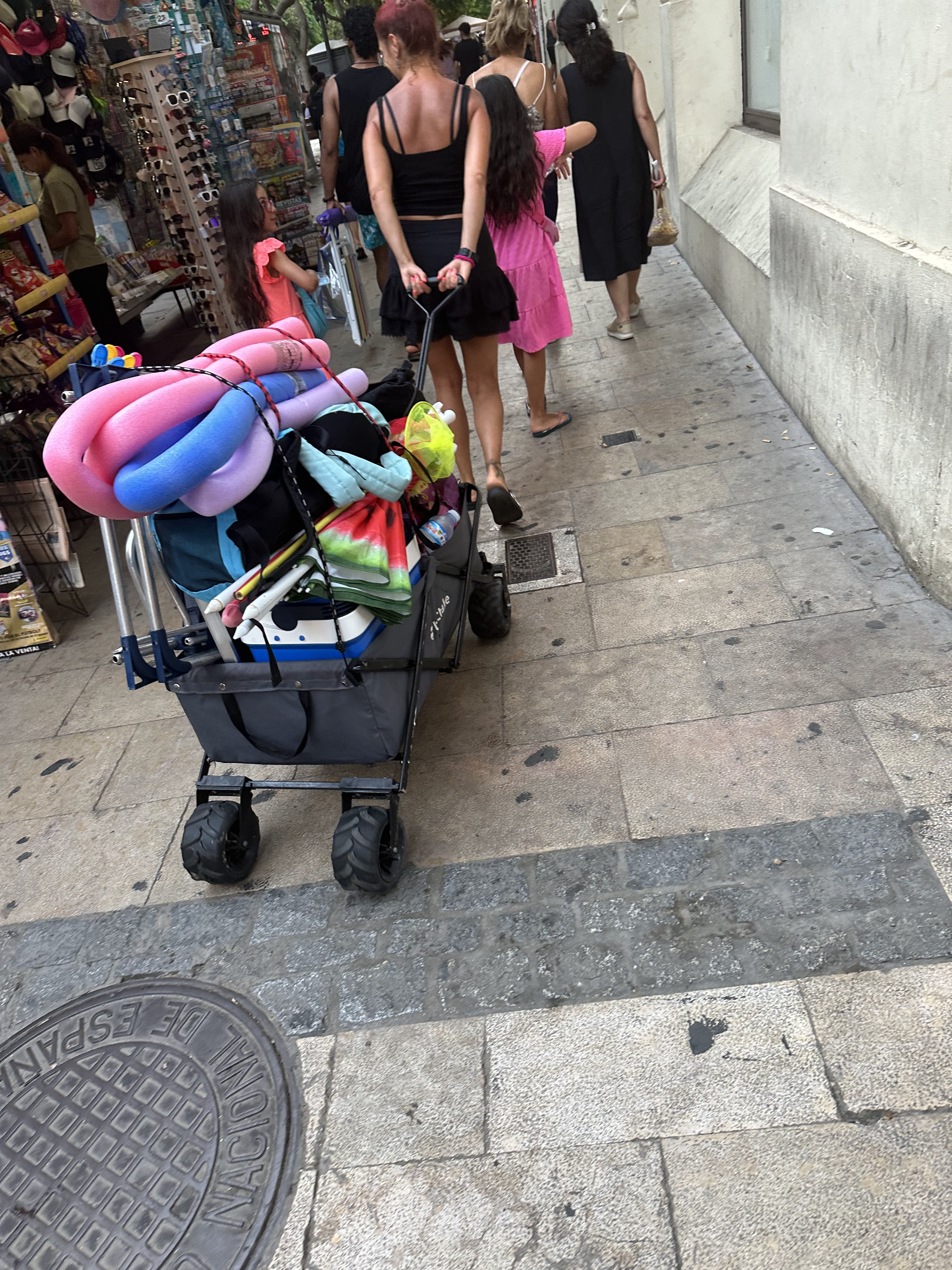Ya en la famosa Explanada de España con ese dibujo característico de su suelo. Se encontraban puestos de artesanía para pasar un ratillo echándoles un ojo, y una fuente con chorros hacia arriba a la que daban ganas de pasar entre ellos; 34º y mucha humedad.