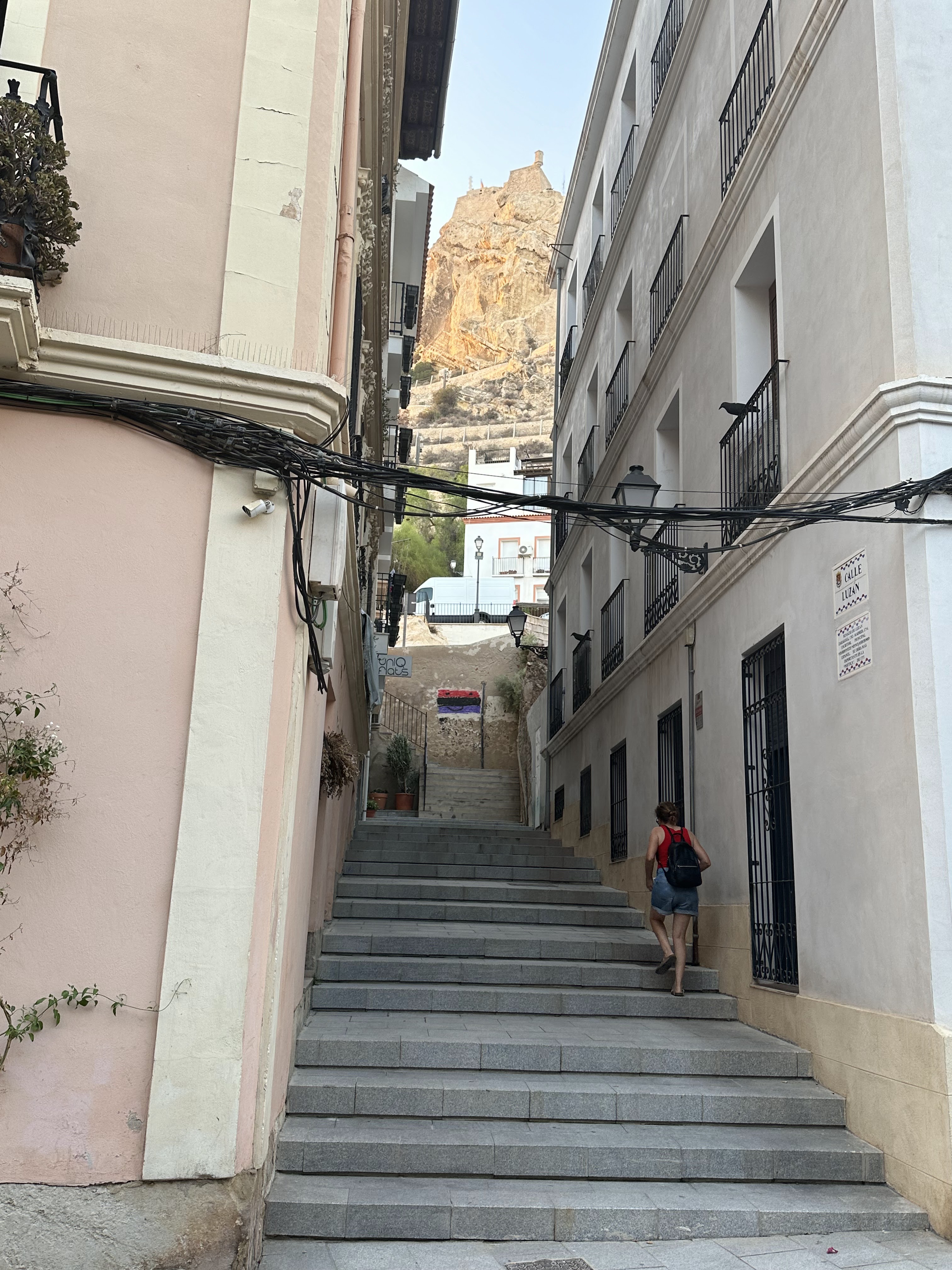 El cruce de la mencionada calle Villavieja y calle Padre Calpena, se aprecia aún más el desnivel y el mirador del castillo en lo alto.