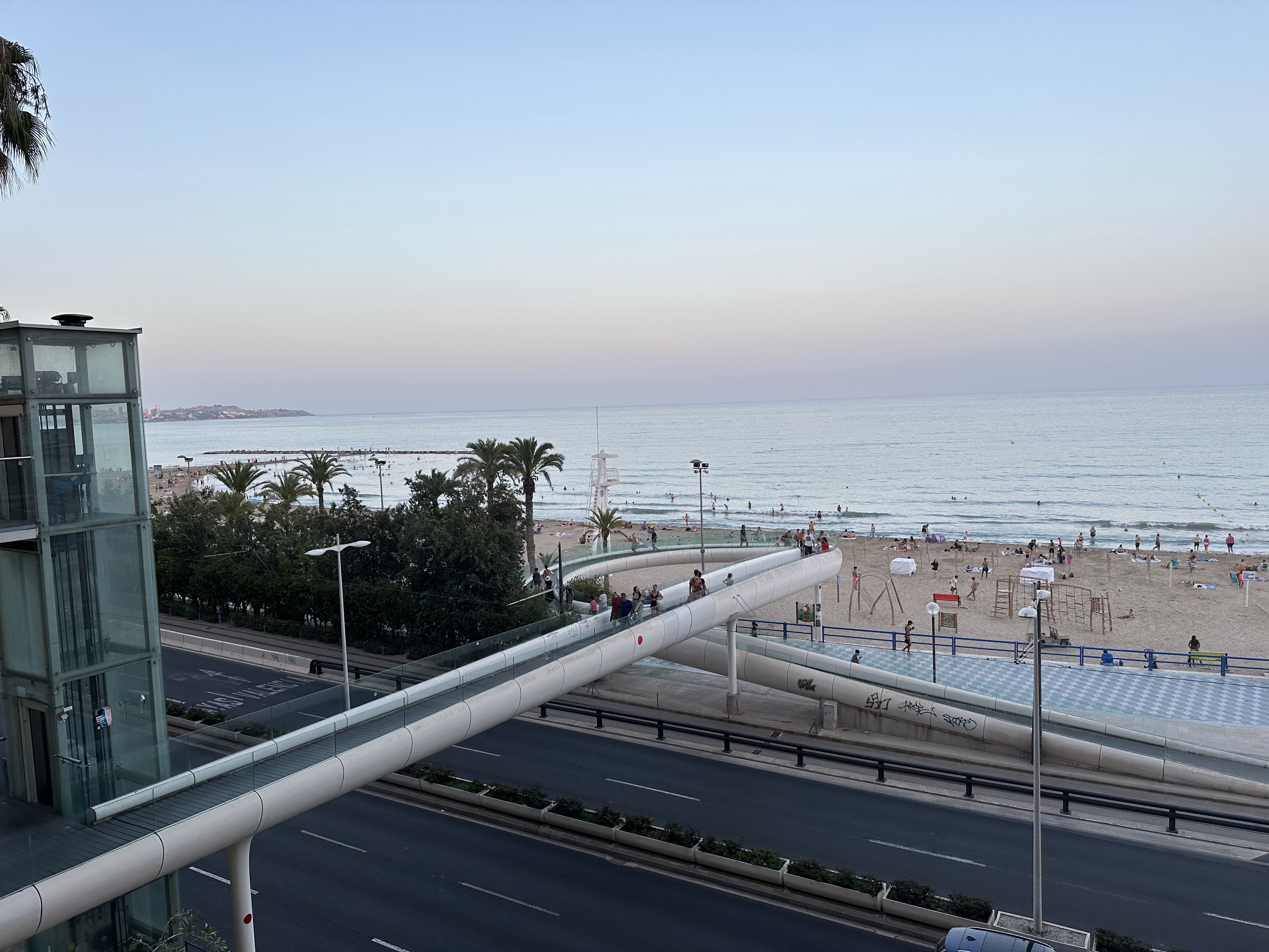 Al llegar a la calle Virgen del Socorro tomamos la pasarela Postiguet (también hay un ascensor) que baja al Paseo Gomiz de la Playa del Postiguet.