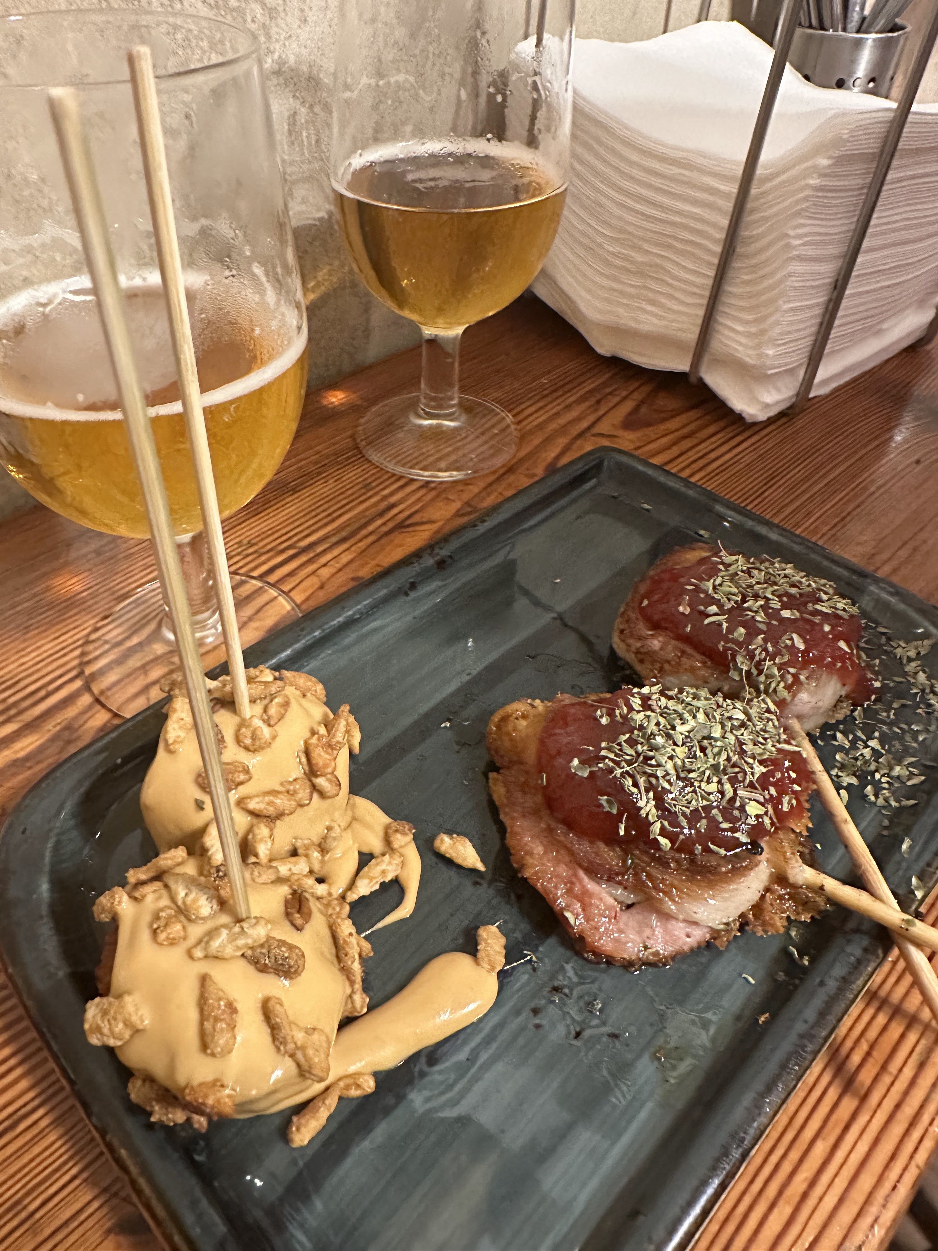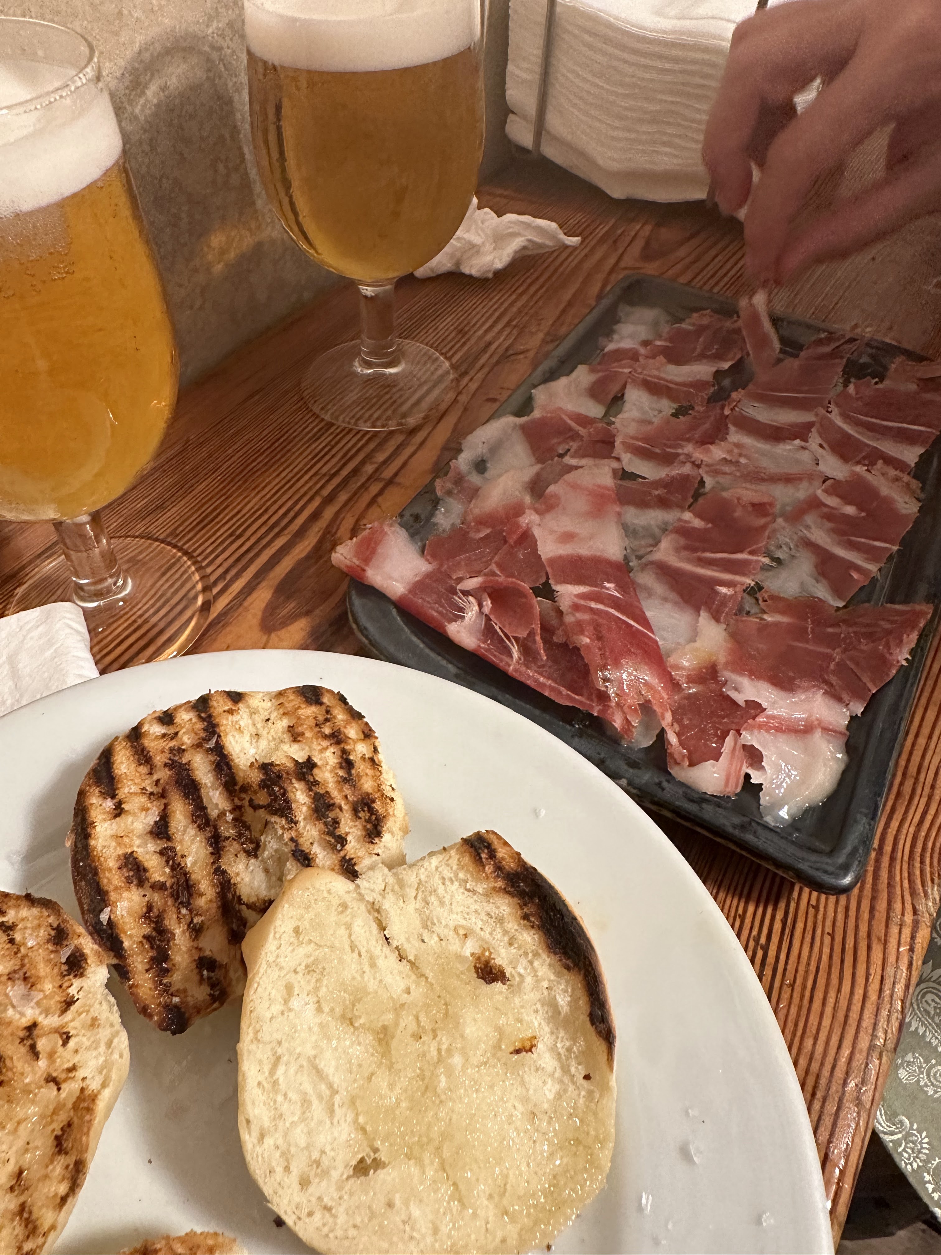 Dos chupachups (4,40 eur), dos piruletas (4,40 eur), dos montaditos de ternera (7 eur) y 1/2 plato de jamón (9 eur) fue nuestra cena.