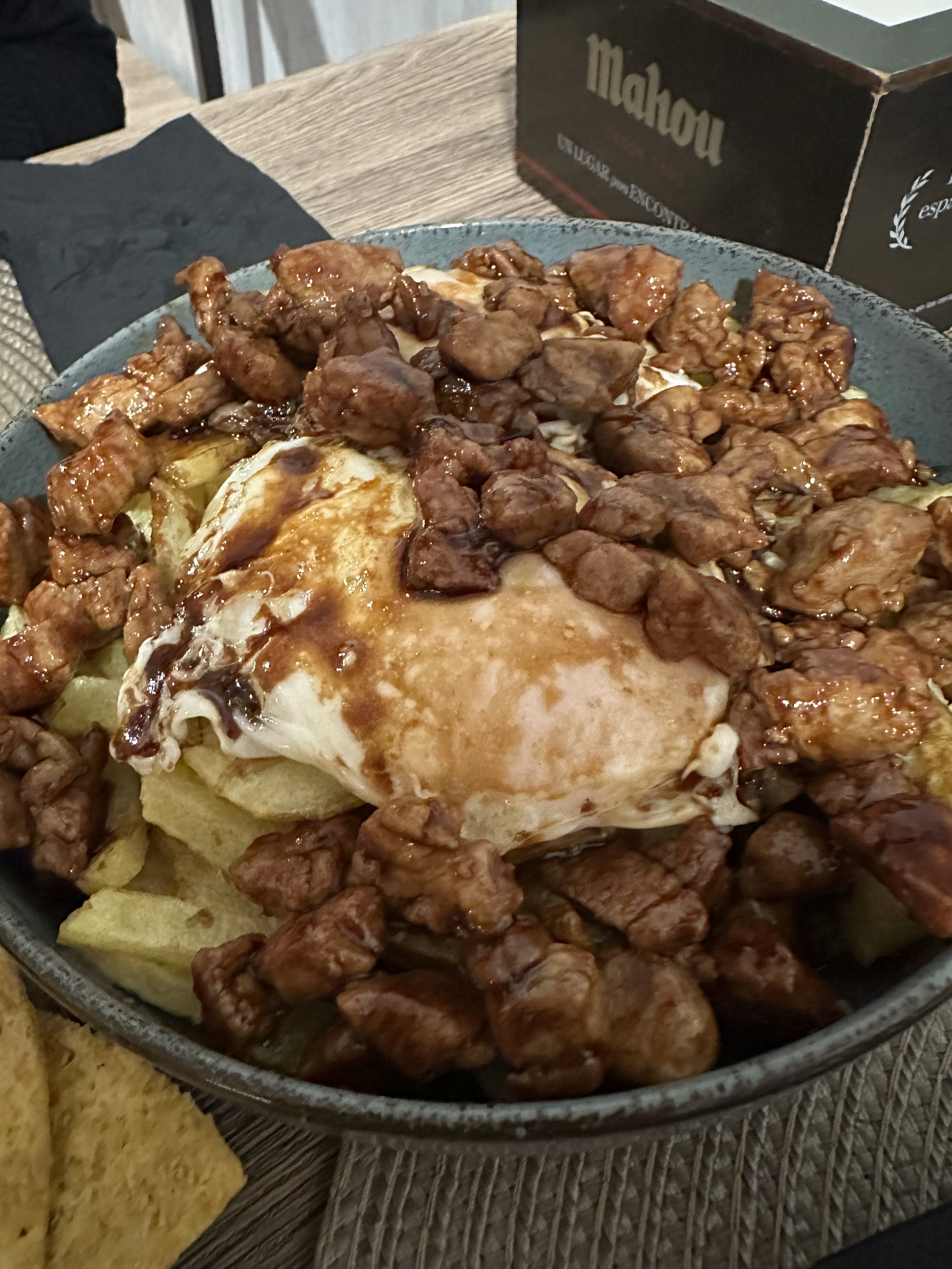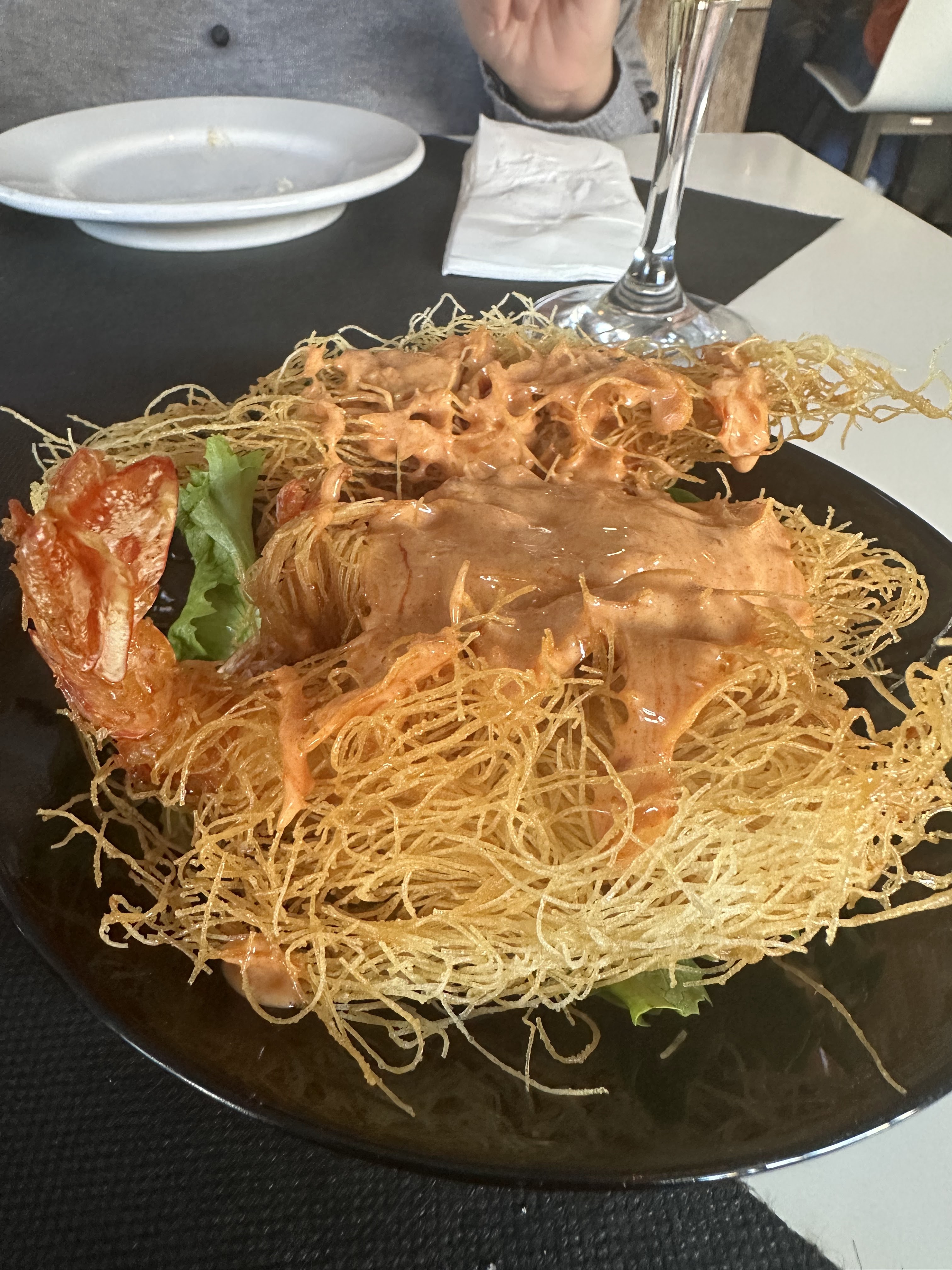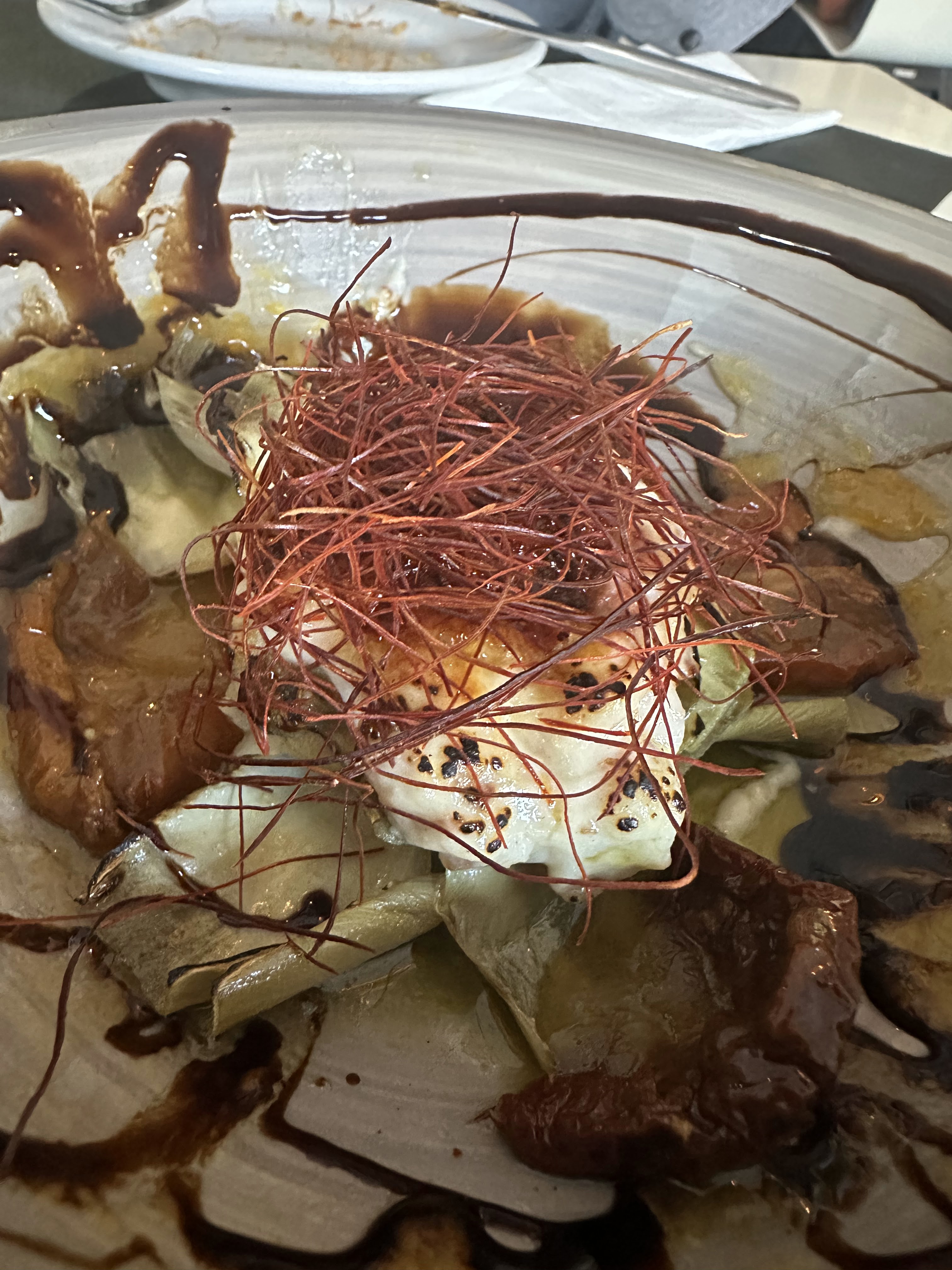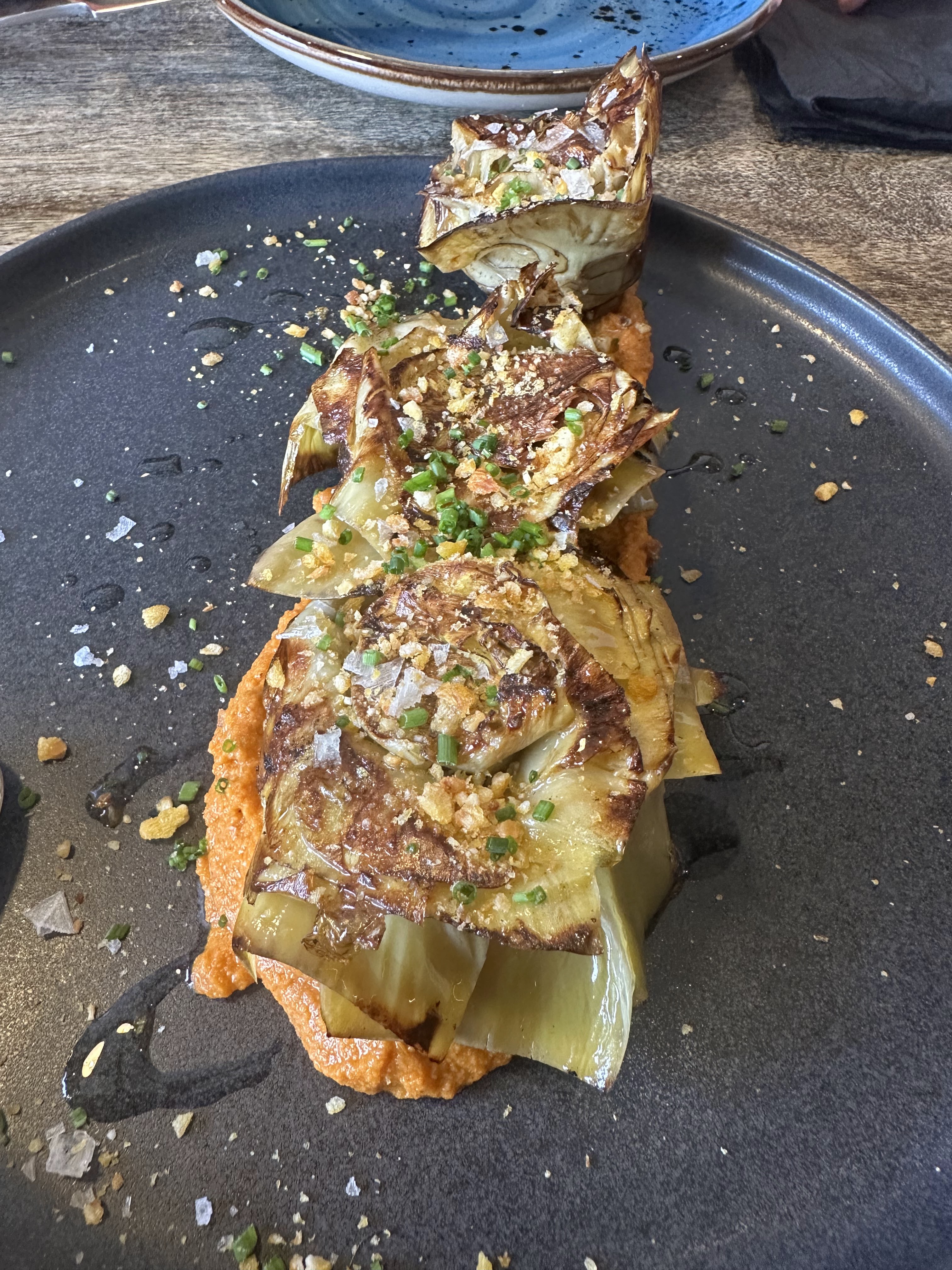 Tomamos bravas chulas, Alcachofa y romescu, bao madrileño, 1/2 canelón de rape, 1/2 tataki de lomo bajo y de postre, 1 tarta fina de manzana.