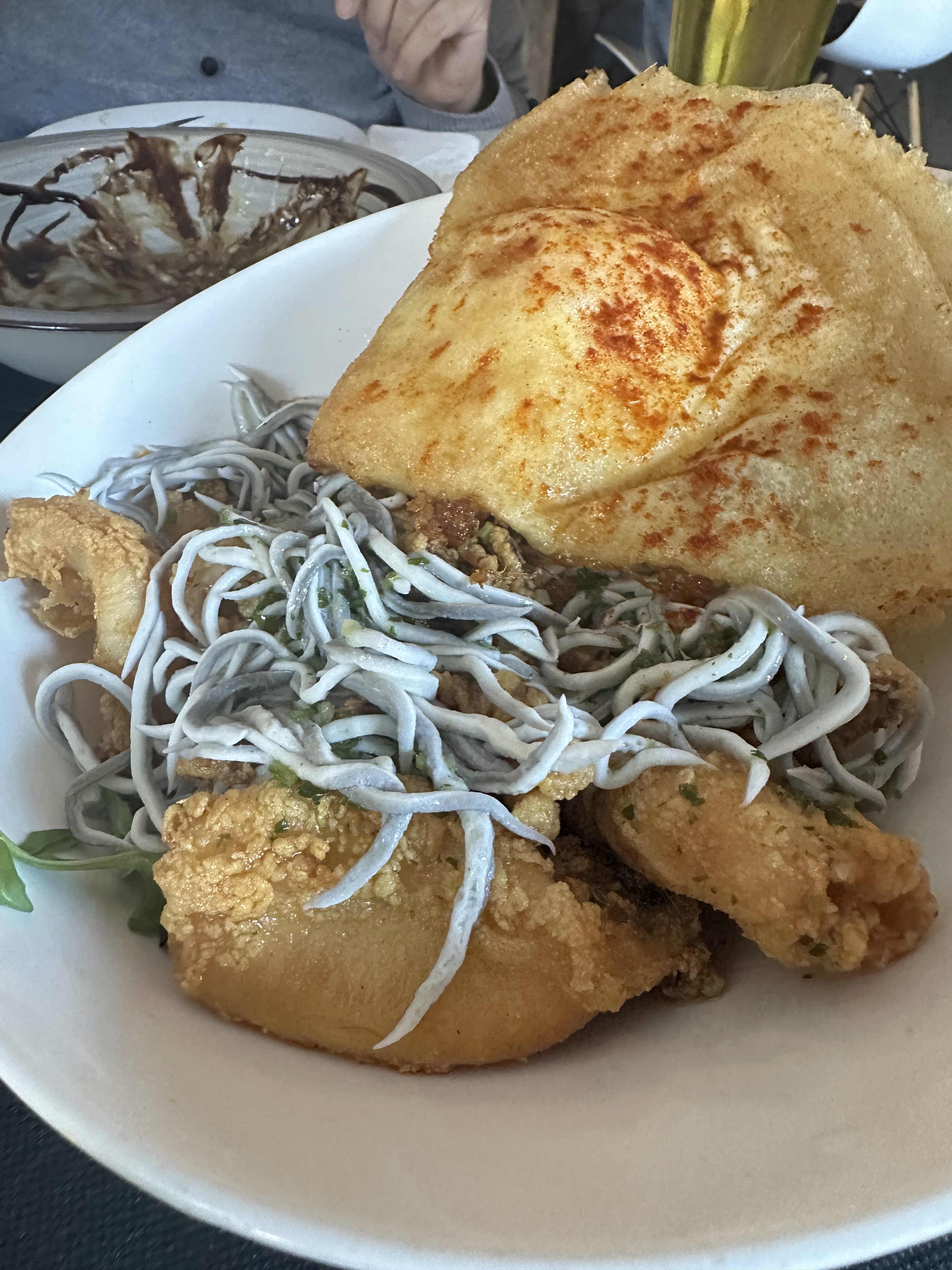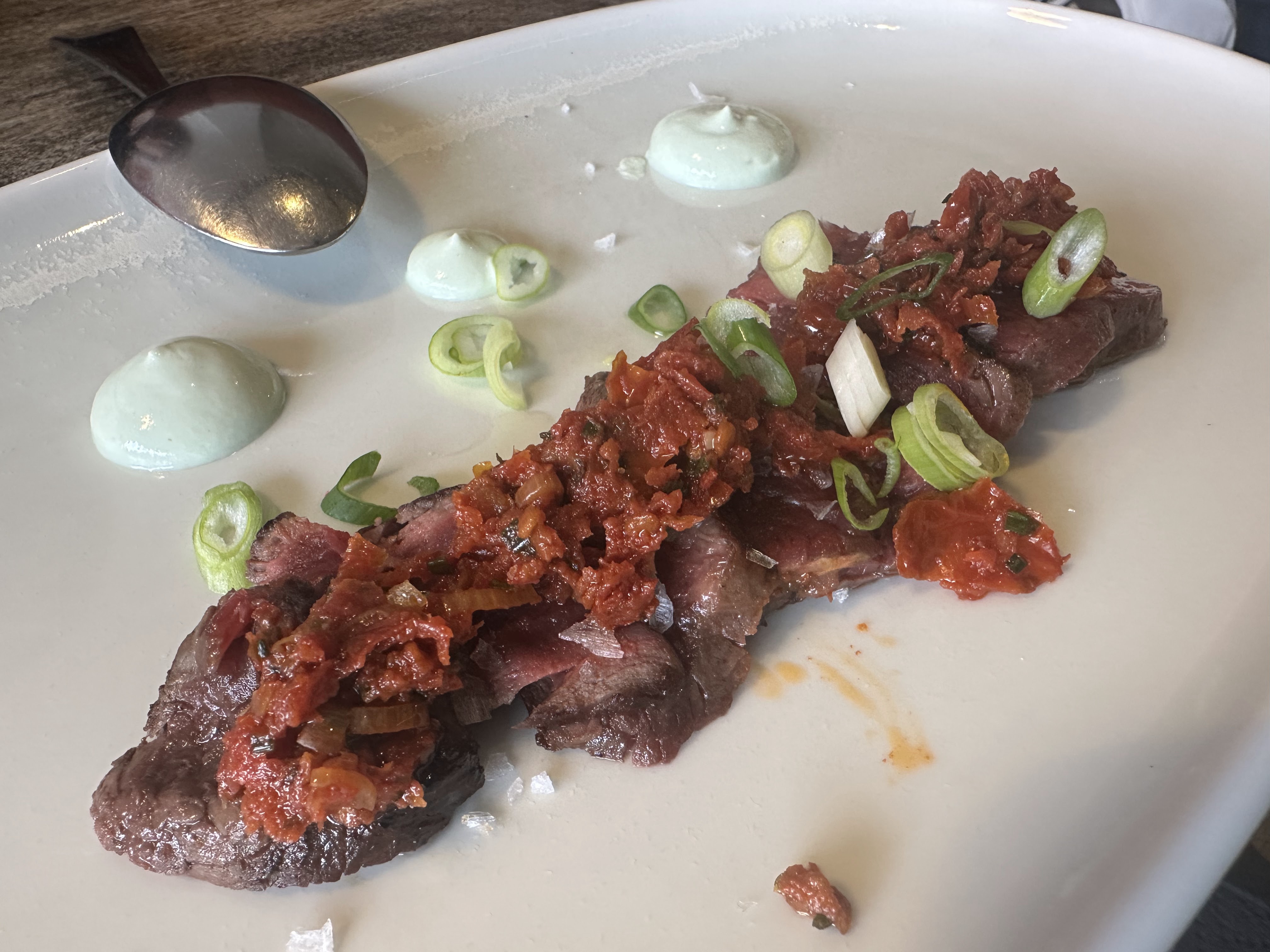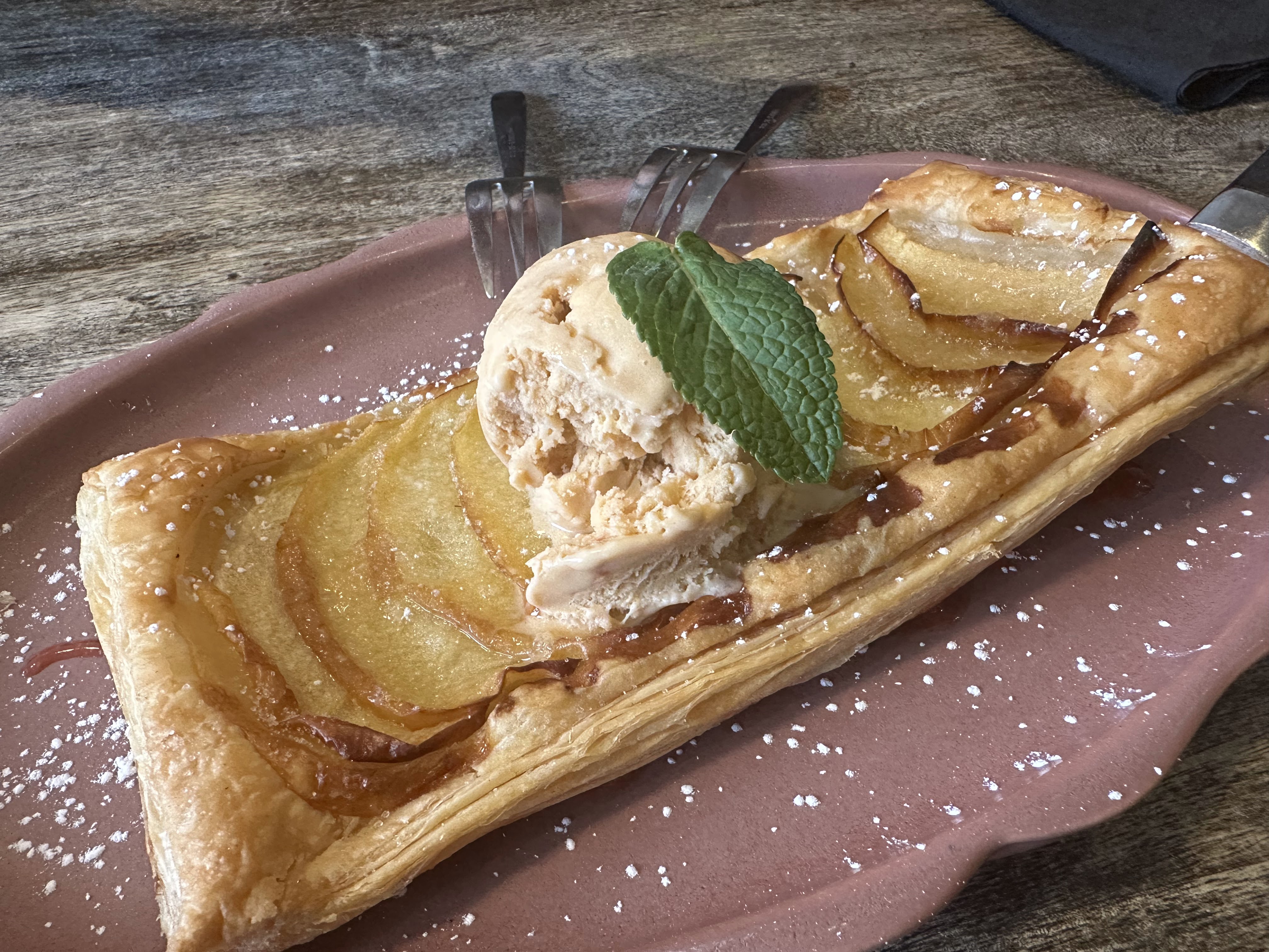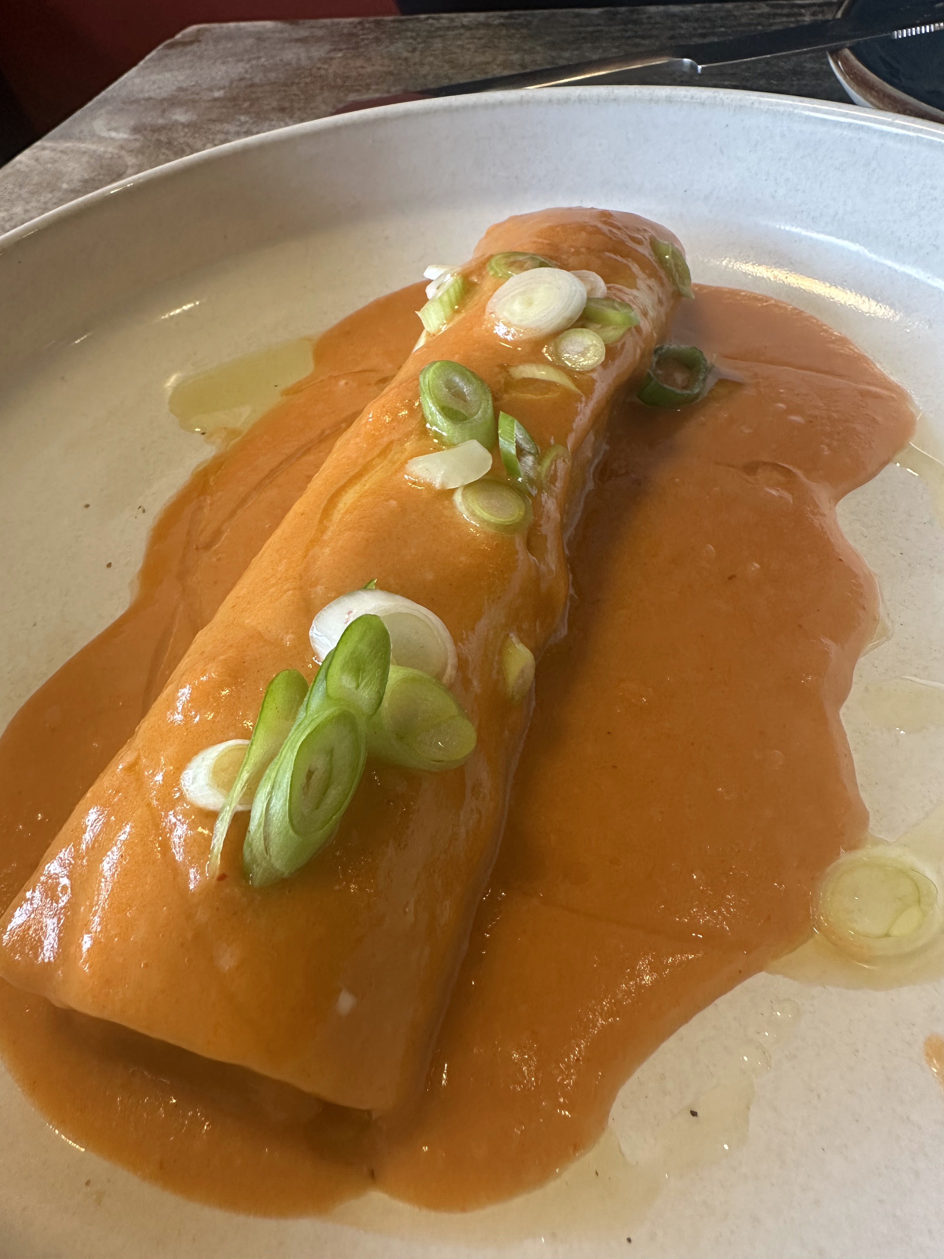 Tomamos bravas chulas, Alcachofa y romescu, bao madrileño, 1/2 canelón de rape, 1/2 tataki de lomo bajo y de postre, 1 tarta fina de manzana.