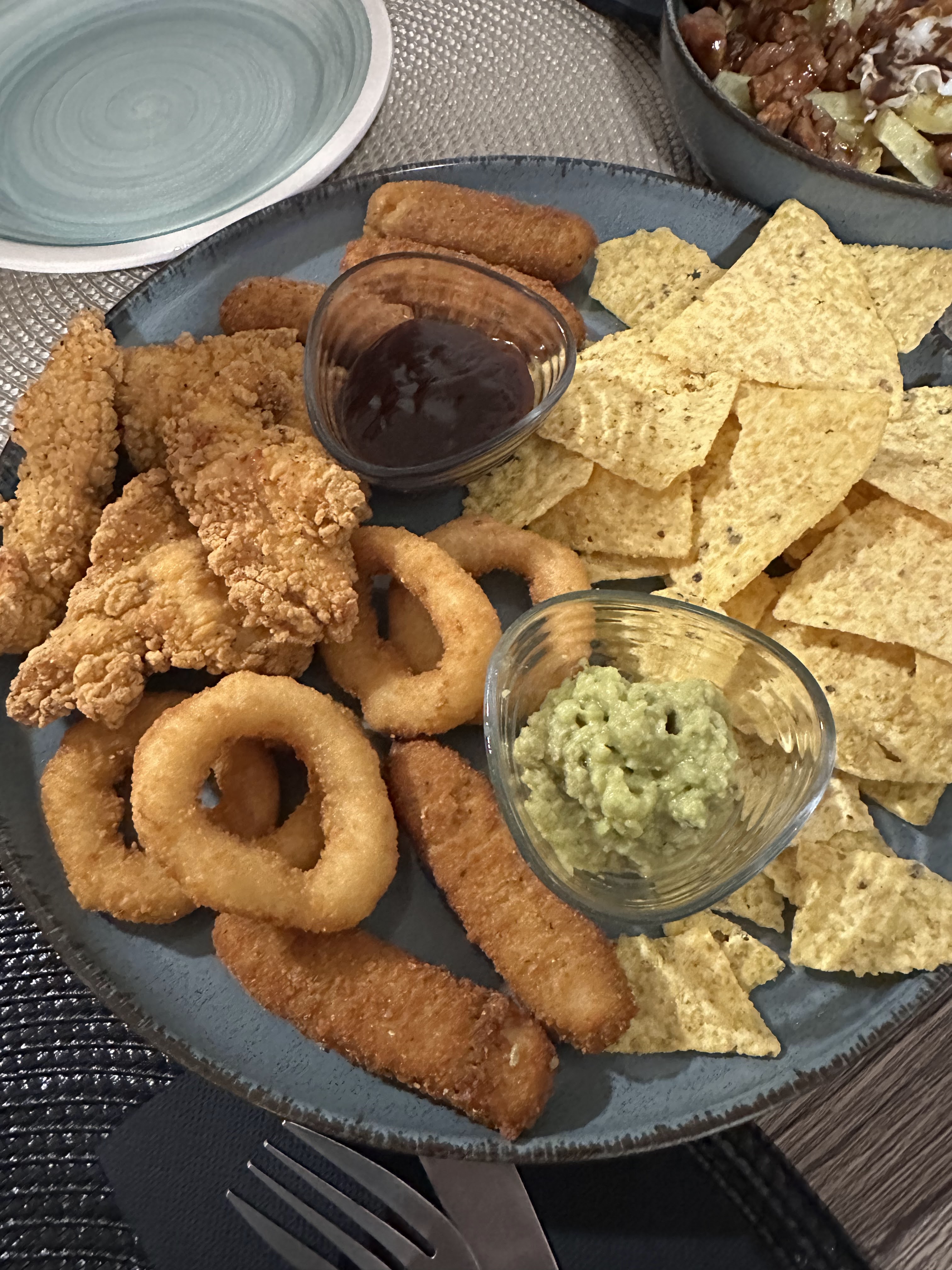 Tomamos un combo (nachos, finger, aros cebolla y pollo kentucky), raxo La Ermita y una tosta de salmón ahumado.